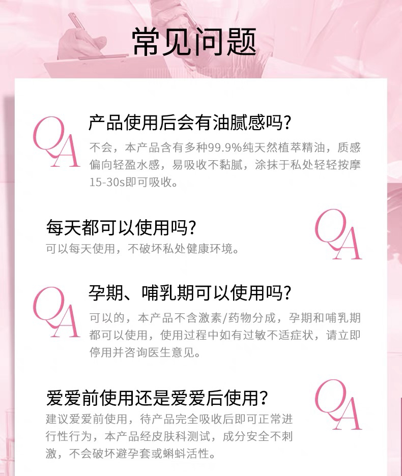这款油薄如蝉翼,15秒吸收,擦完之后丰润舒适,明显能感受到滋润度的提升。激活细胞的同时还能改善外阴的环境,是个值得体验的优品。除此之外,大家还可以尝试擦脸,手肘,膝盖大腿根部或者臀部粗糙的部位,前戏导入,只要你能想到的场景,都可以用它试试。