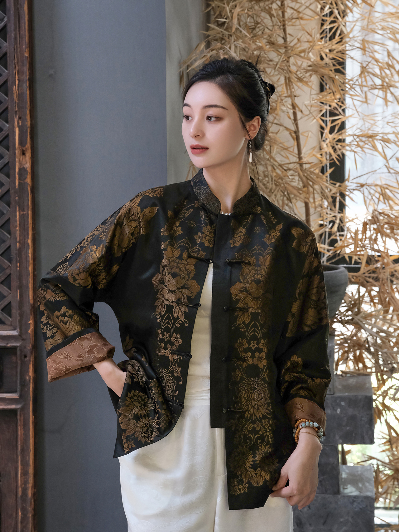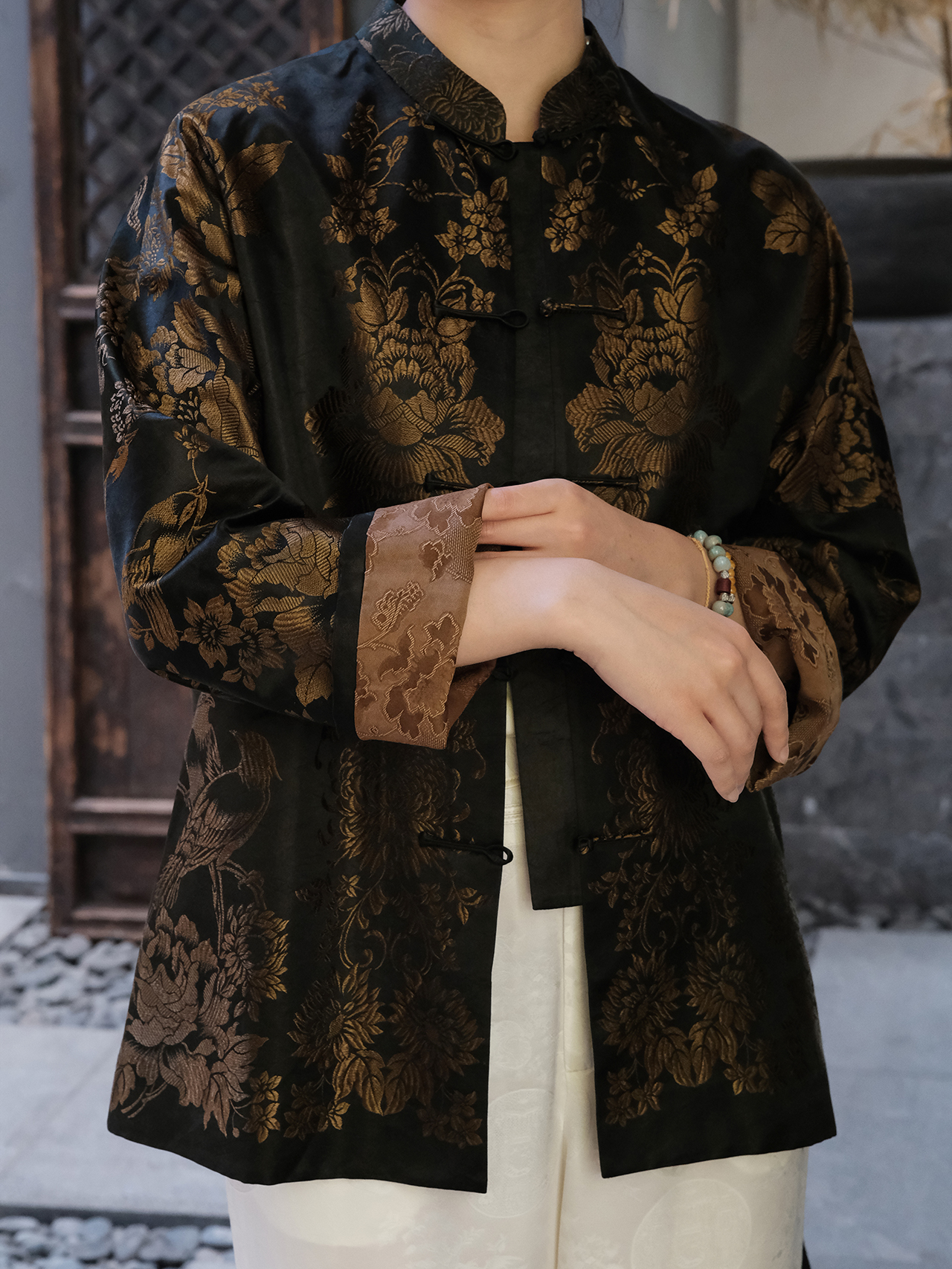 盛唐婧| 重磅桑蚕丝老缎新中式对花外套-金色