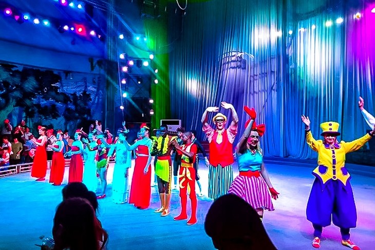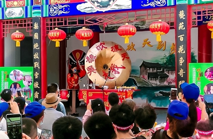 漫步城中可以尽情欣赏各具特色的杂技、马戏、戏法、气功、曲艺、独台戏、拉洋片、驯白鼠等艺术表演,身着清朝服饰的吴桥艺人们,说着当年卖艺求生的语言,把过去艺人四海为家的生活情景展视的淋漓尽致,我们在露天的杂技表演广场,看驯鼠、独台戏、驯猴、吹破天剧场的吹茶壶、鼻吹唢呐和口吃香烟、上刀山、吞剑、等,之后在魔术宫剧场、鬼手剧场和红牡丹剧场看室内表演,以及国术马戏场。