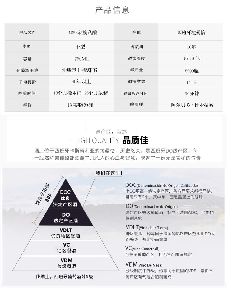 厂名:西班牙博得佳斯·洛萨诺葡萄酒厂 厂址:西班牙拉曼恰 配料表:葡萄汁、二氧化硫 储藏方法:避光阴凉/恒温箱 保质期:3650 天 食品添加剂:无 系列: 1853家族私酿 产地: 西班牙 西班牙分级: 法定产区酒DO 糖分: 干葡萄酒 (含糖量小于4克/升) 香味: 橡木味/矿物质 | 葡萄酒种类: 红葡萄酒 葡萄酒等级: 西班牙 西班牙产区: 卡斯蒂利亚-拉曼恰 醒酒时间: 90分钟(含)-120分钟(不含) 搭配菜肴: 红肉/野味/陈乳酪 套装规格: 单支 进口类型: 原瓶进口 酒精度: 14%vol及以上 净含量: 750ml 采摘年份: 2007-09 |