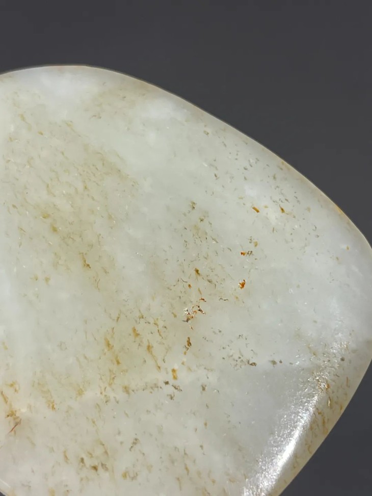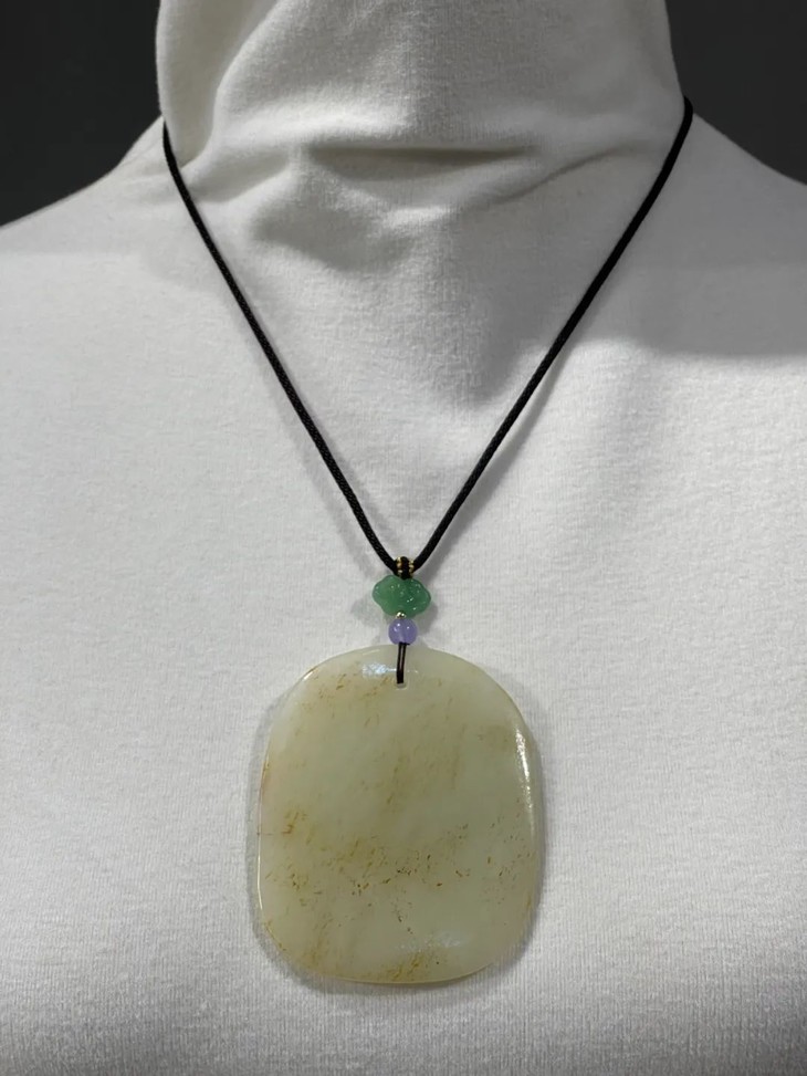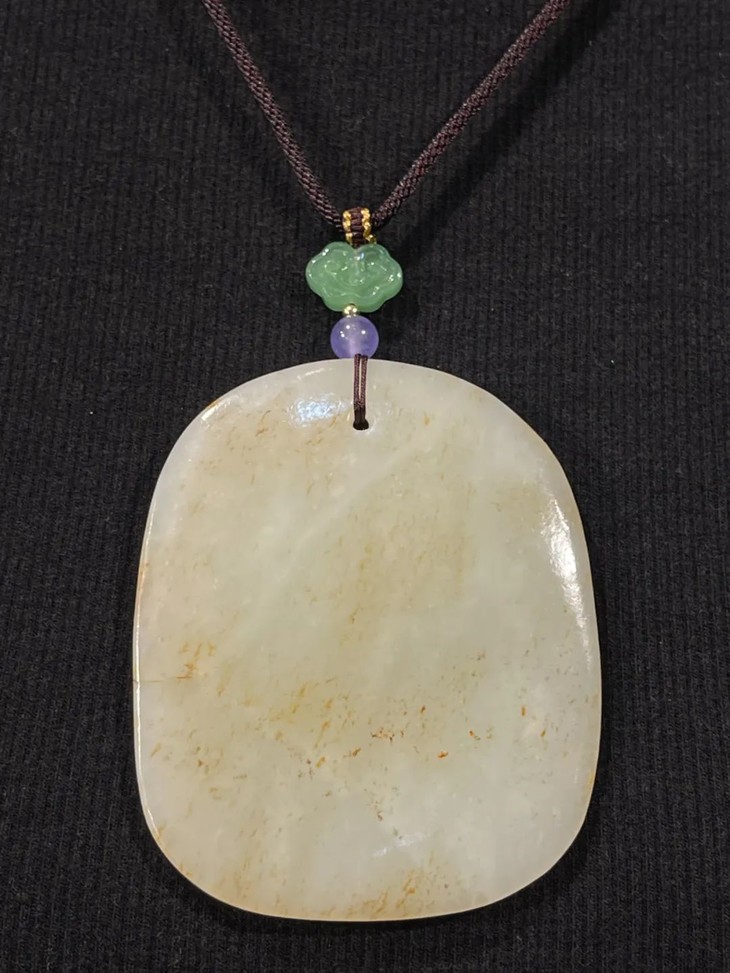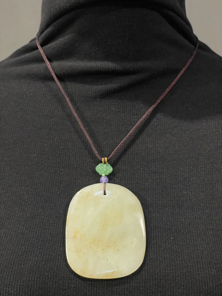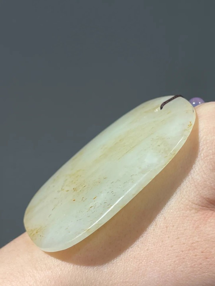 素面无纹的吊坠玉牌俗称”无事牌”,寓意平安无事,此白玉无事牌取材和田籽料洒金沁白玉圆石籽儿,随形琢磨成扁玉牌,尺寸不小,琢磨精细、随形式样极简、表面弧面打磨细致,玉质硬度高,除小量絮状物与金色斑点外纯净洁白,色泽柔美匀称,油脂性高,包浆温润。