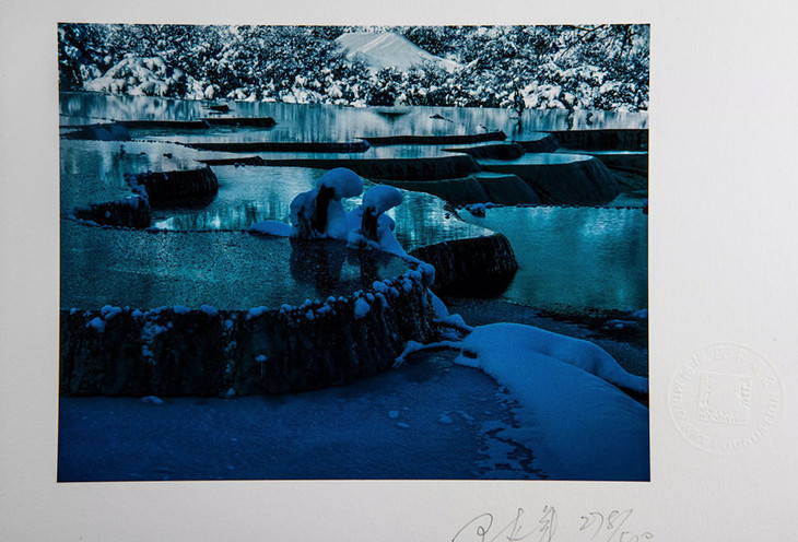 此作品是60名家作品中的其中之一,作者王达军是中国当代著名风光人文摄影家。他的风光照在至美的画面中,讲述了大自然最微妙变化的生动故事,在悦目的同时,又引人以哲理的思考。本幅作品是他拍摄的黄龙风景区雪后放晴的景观,黄龙以规模宏大、结构奇巧、色彩丰艳的地表钙华景观为主景,以罕见的岩溶地貌蜚声中外,堪称人间仙境,冬天银装素裹的黄龙更是别有一番风味。
