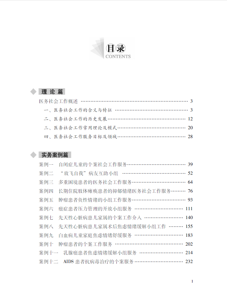 该书是江西财经大学《社会工作案例精选》丛书之一,全书分为理论篇和案例篇两大部分。理论篇主要介绍医务社会工作的含义与特征、医务社会工作的历史发展、医务社会工作常用理论及模式、医务社会工作服务目标及领域以及医务社会工作最新进展;案例篇包括案例背景、需求评估、实务理论基础、服务计划、实施过程、总结评估、专业反思和督导点评等基本内容。本书是基于服务于高校医务社会工作人才培养,服务于一线社会工作者提升服务质量等需求,以医务社会工作基础知识和医务社会工作理论为基础,以医务社会工作案例为主体,以实务操作过程呈现为重点,同时具备教材或教师用书的一定特点,具有一定的理论性和知识性,因此可以为医务社会工作研究和教学、为医务社会工作实务领域社会工作者提供参考和借鉴。