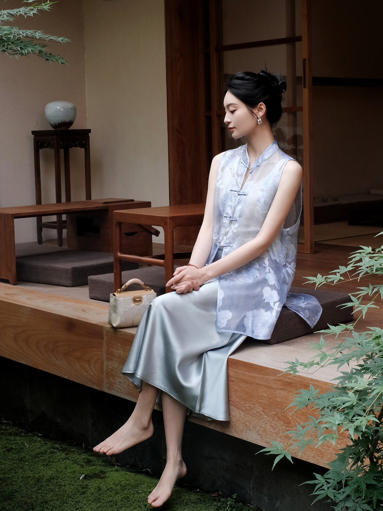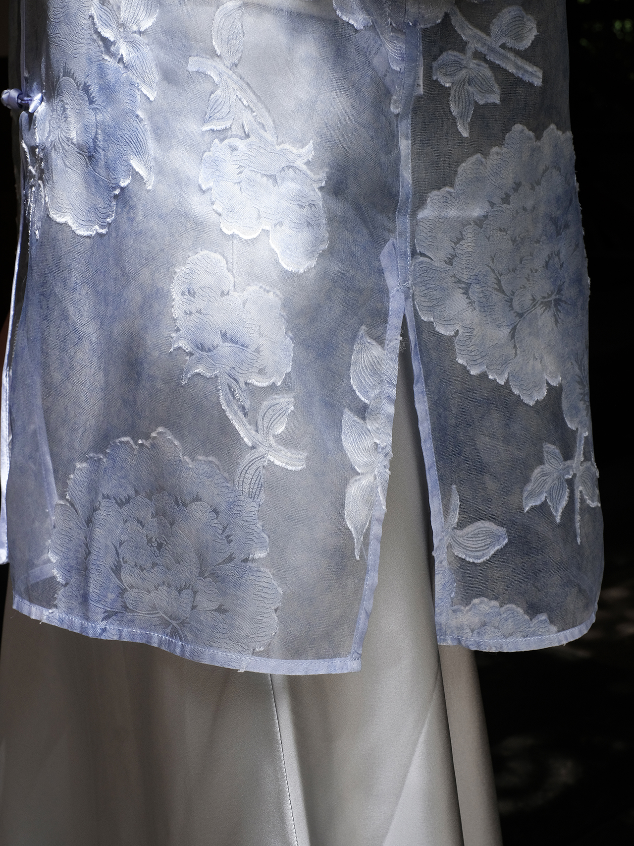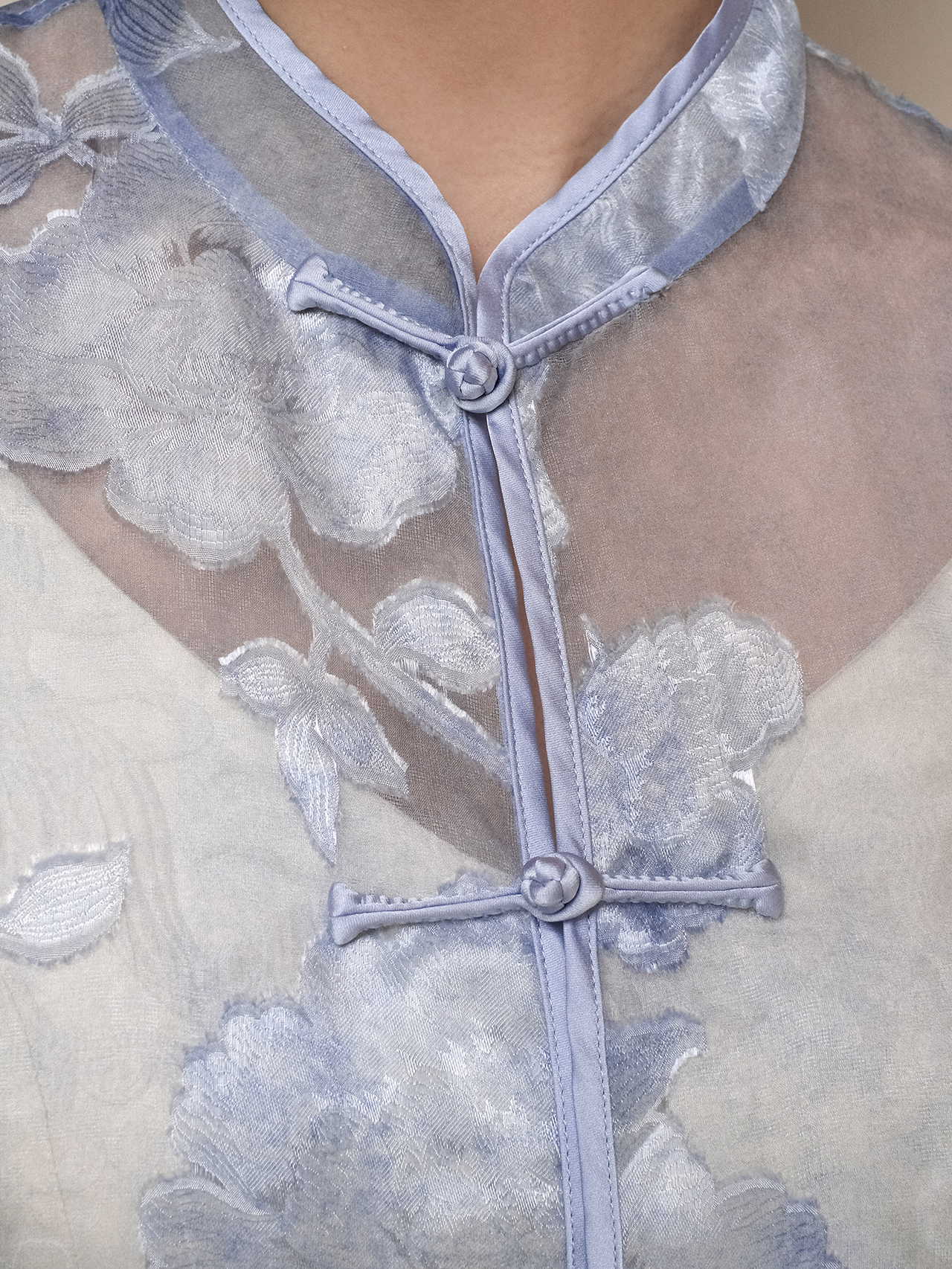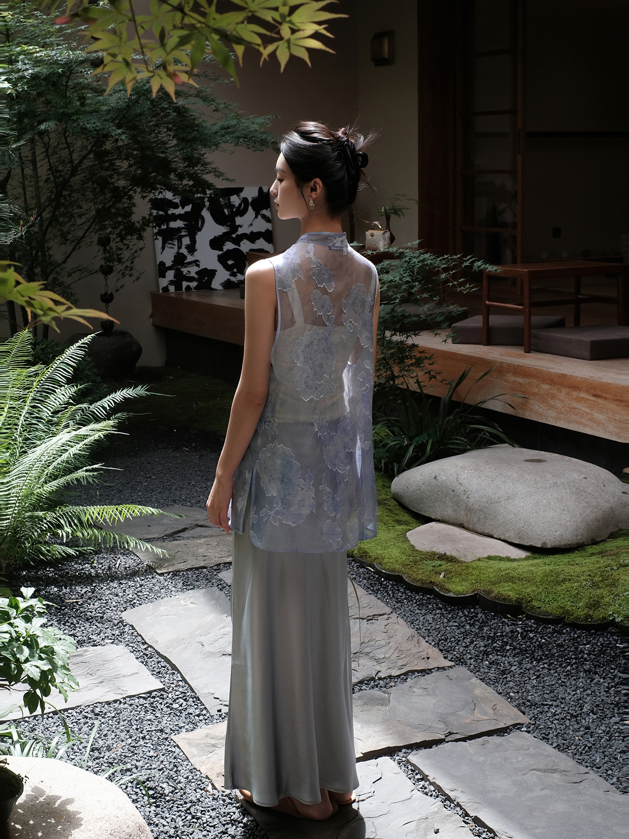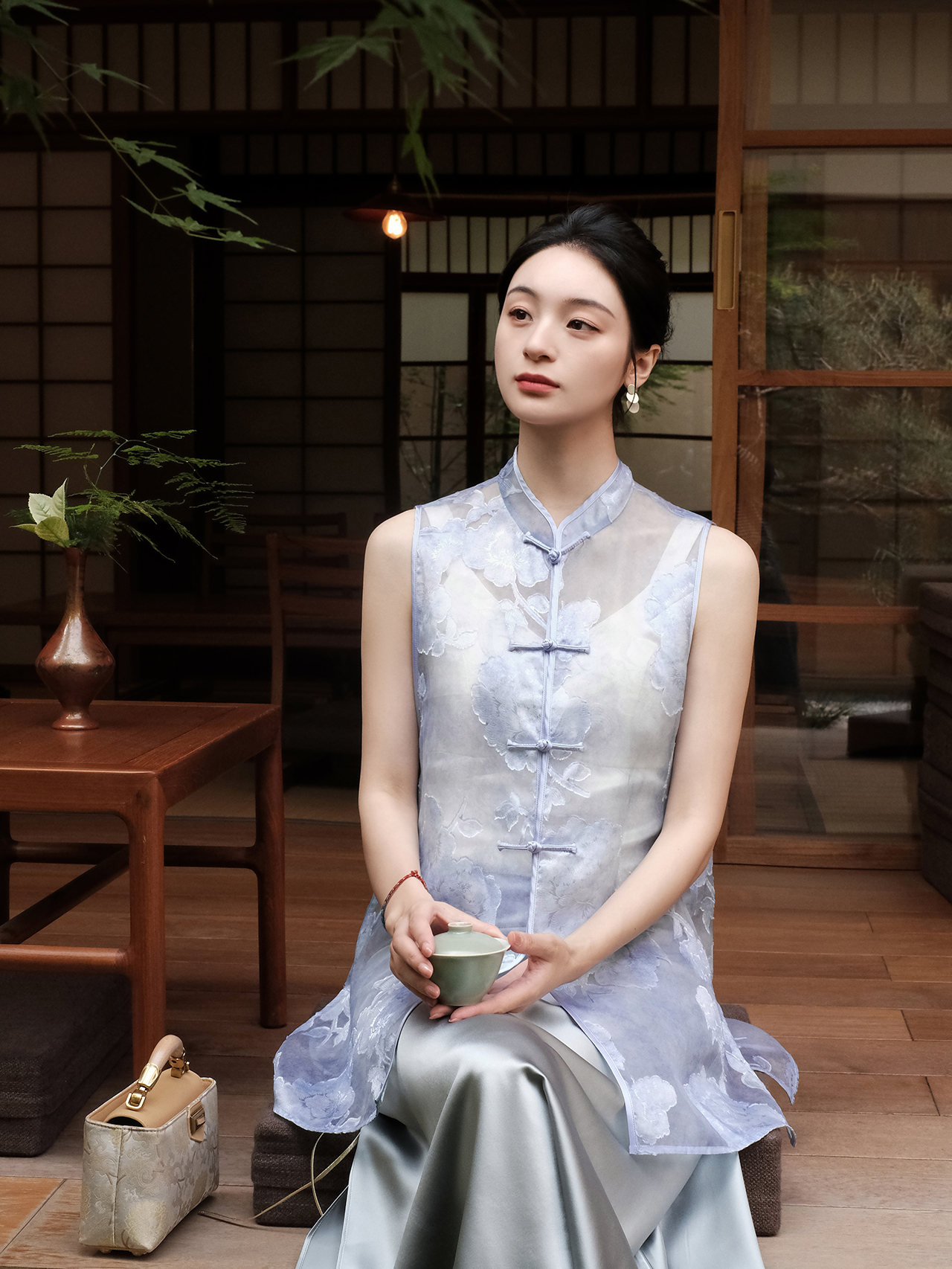 盛唐婧| 新中式立领真丝剪花绡对襟长马甲背心-蓝色