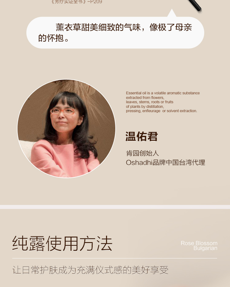- 欧洲植物精油典范品牌,1990年由植物大师荷索博士创立于德国温泉度假胜地巴登巴登。作为全球精油品类最全的品牌,Oshadhi选择自然栖息地最健康、最旺盛的植物作为原材料,以保证产品的最佳疗愈力。