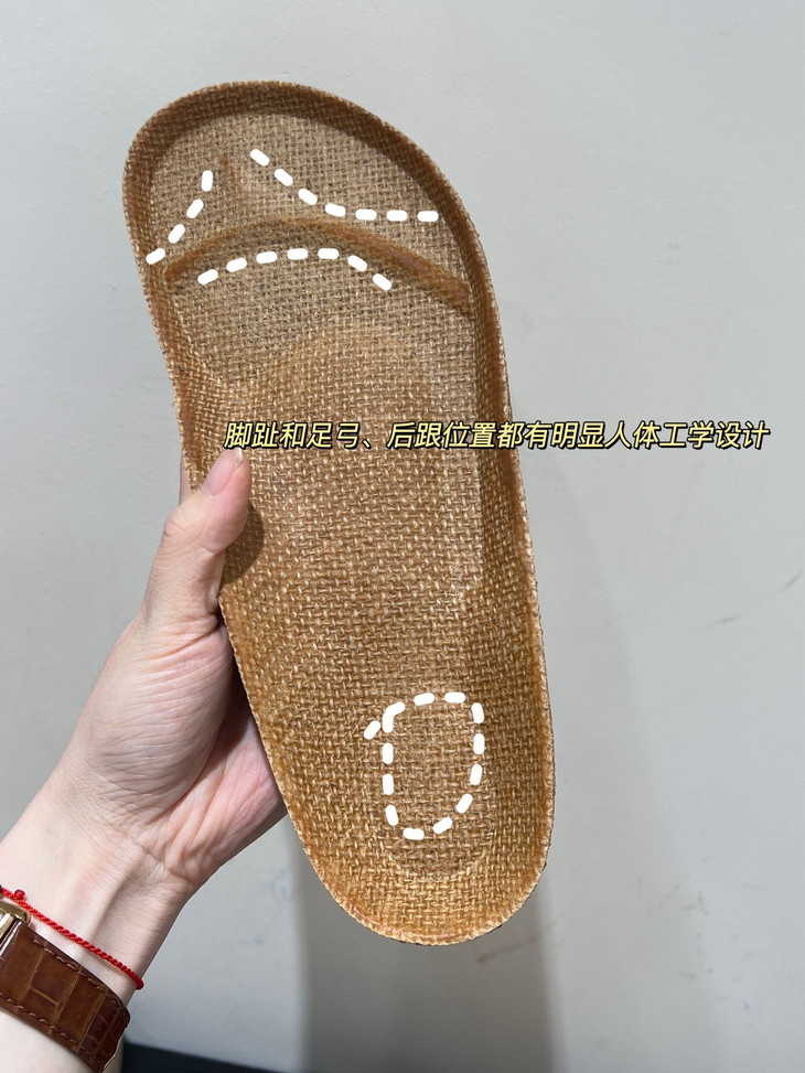我们包裹的里面的鞋床表面是黄麻材质 更具吸湿透汗能力!有华夫格的纹理 有种编织的工艺在的,脚趾和足弓、后跟位置都有明显人体工学设计,手感轻便。