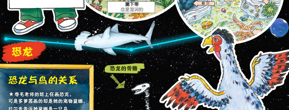 书上的图片很吸引孩子,文字设计也很好,既有连贯的故事情节,又有人物对话,还有故事中小孩们完成的作业报告。总之,每一页的信息量都很大。现在,孩子刚好到了对恐龙非常感兴趣的时候,就每天拿着两本与恐龙有关的书看,当然,看完了还得让我们讲。这个过程中,他也学会了不少“专业”词汇。