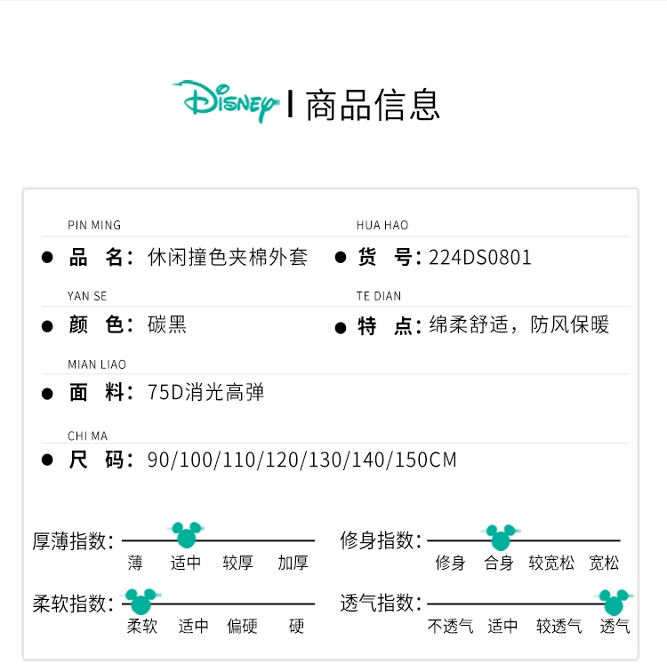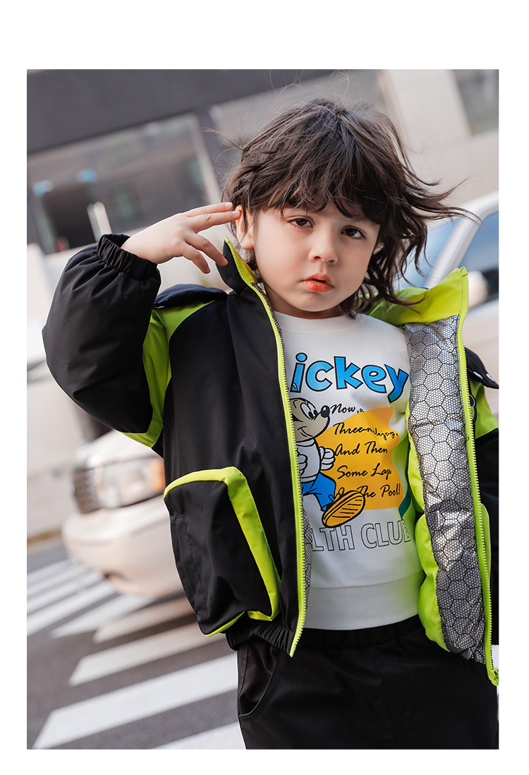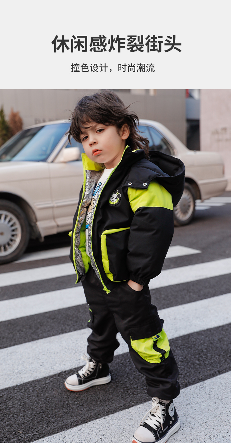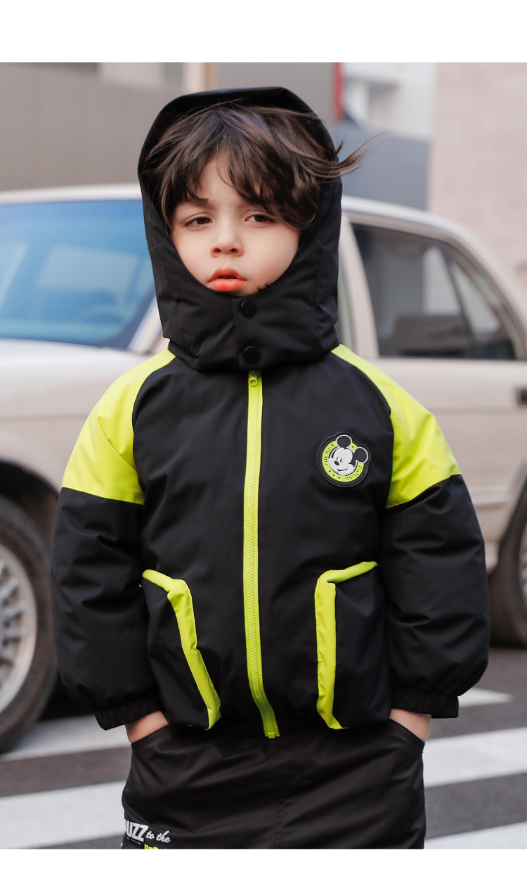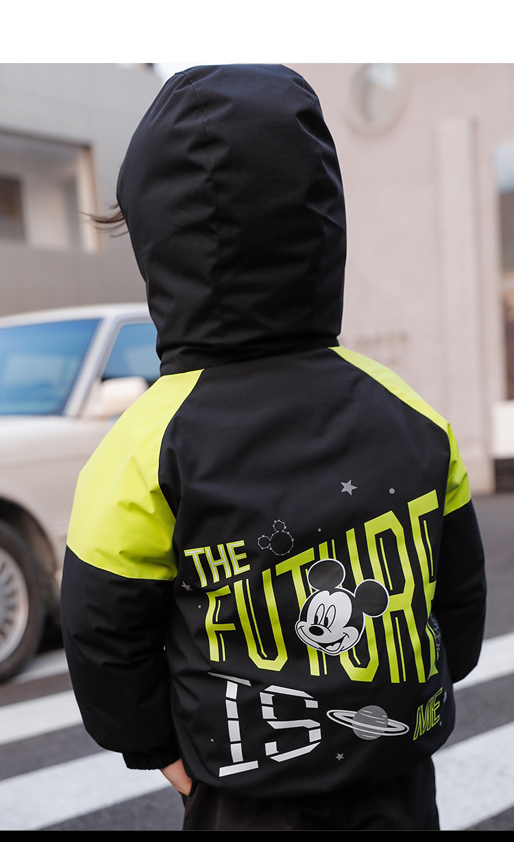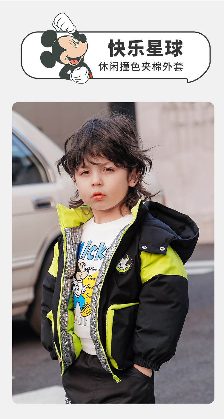迪士尼童装男童休闲撞色夹棉外套冬季款保暖连帽棉服224DS0801
