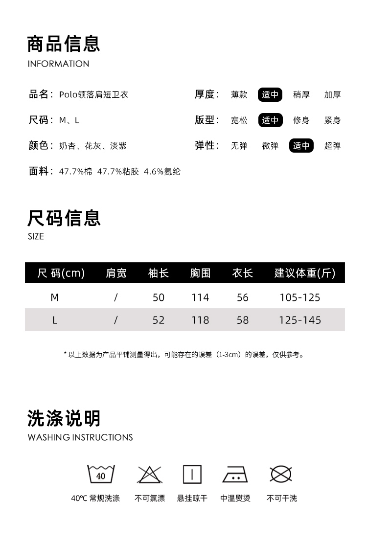 Polo领落肩短卫衣,淡紫、奶白、花灰三色,很有秋天的氛围感卫衣,减龄又俏皮,少女感十足!卫衣采用云梯棉面料,亲肤柔弹,轻薄百搭,特别适合夏秋交替,完美应对忽冷忽热的天气。设计上也是细节满满,将大热的翻领+V领融入卫衣,宽松的大落肩完美遮掩多余肉感,肩线处理绝了,软糯有力量,肩膀宽也不显壮!短款衣长,底部微微收腰,优化身材比例,对小个子MM也相当友好!再加上胸前装饰拼接口袋,增添层次感,收束袖口,服帖手腕,利落有型!