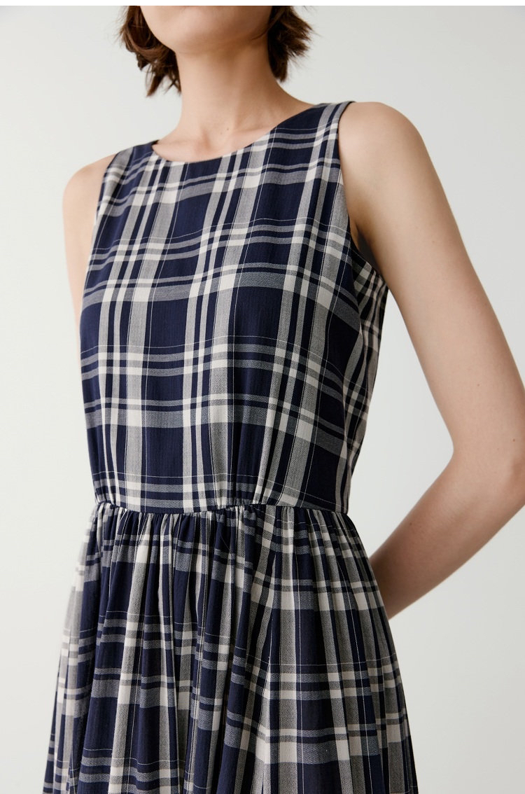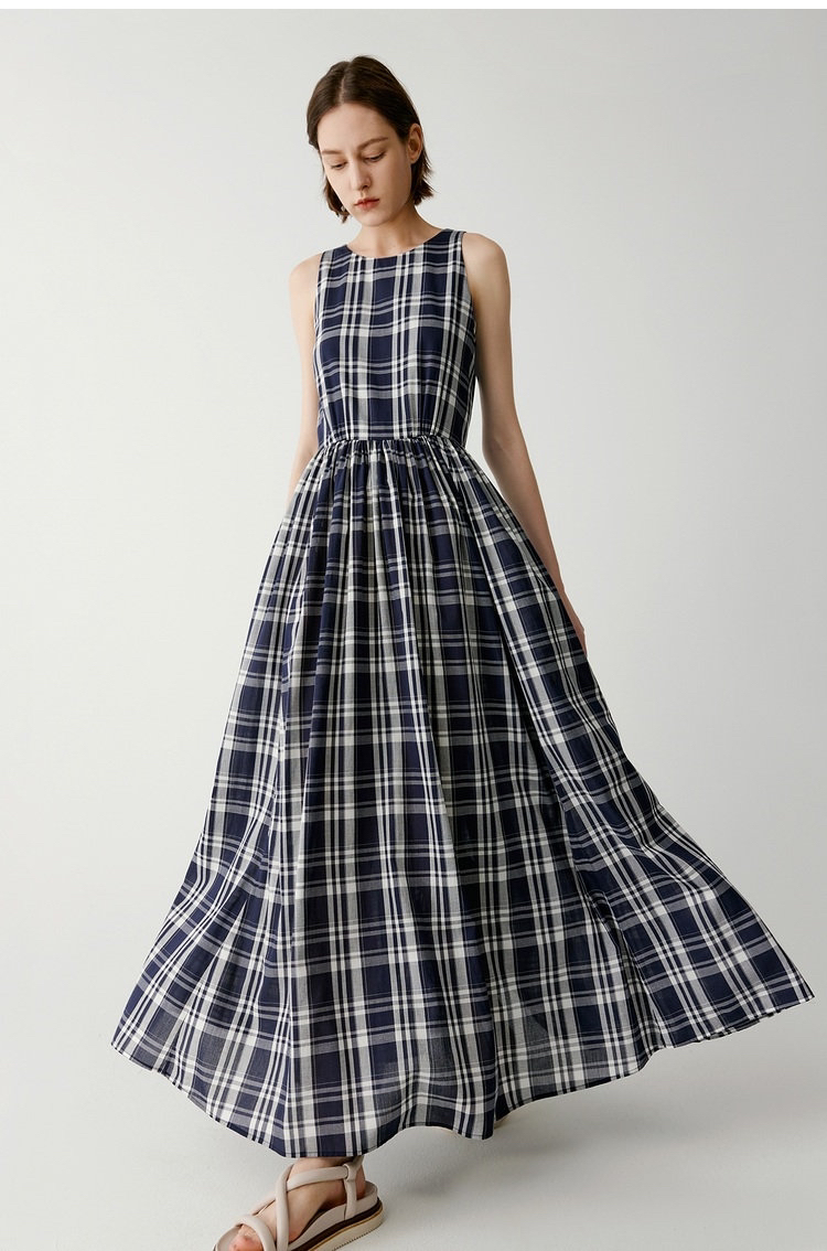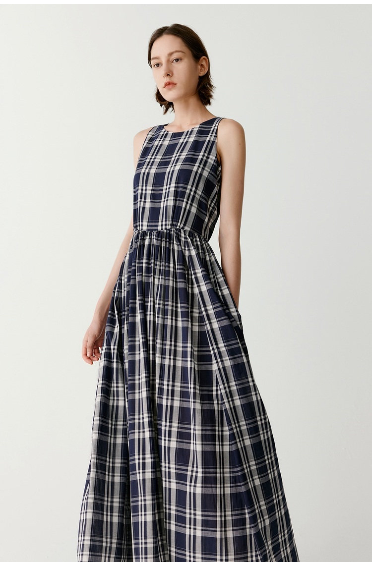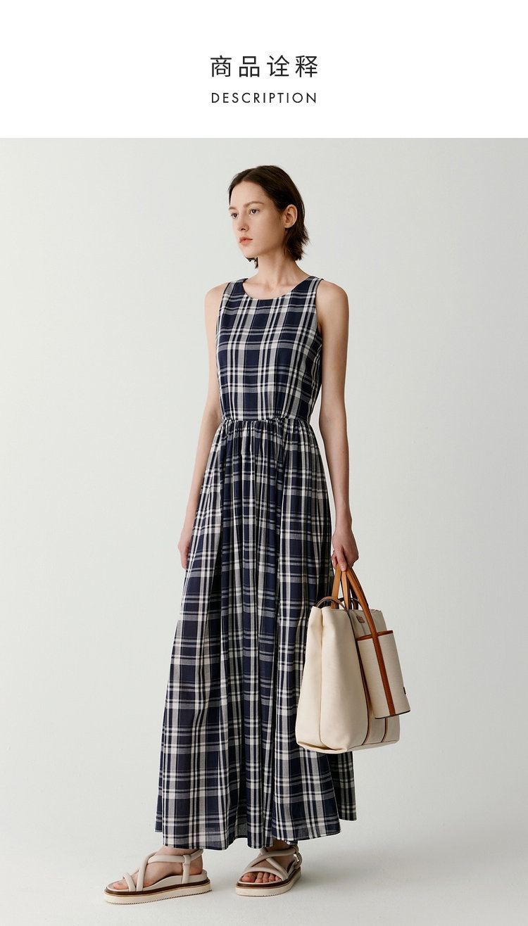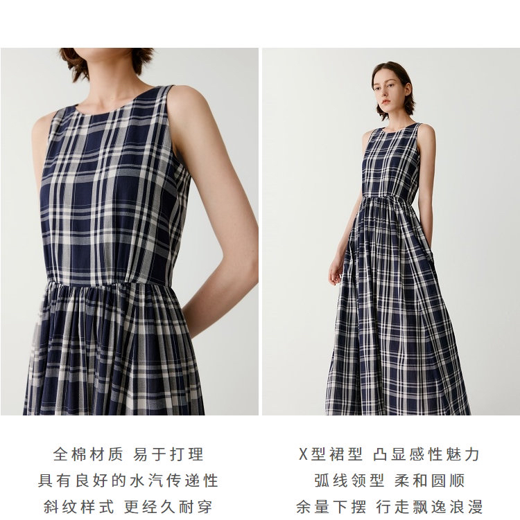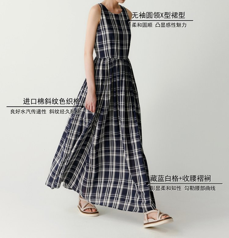 棉斜纹色织格松紧收腰连衣裙 进口面料斜纹棉格纹裙 收腰设计 勾勒腰部曲线 无袖X型收腰的黄金比例学 布面细洁美观 手感柔软舒适