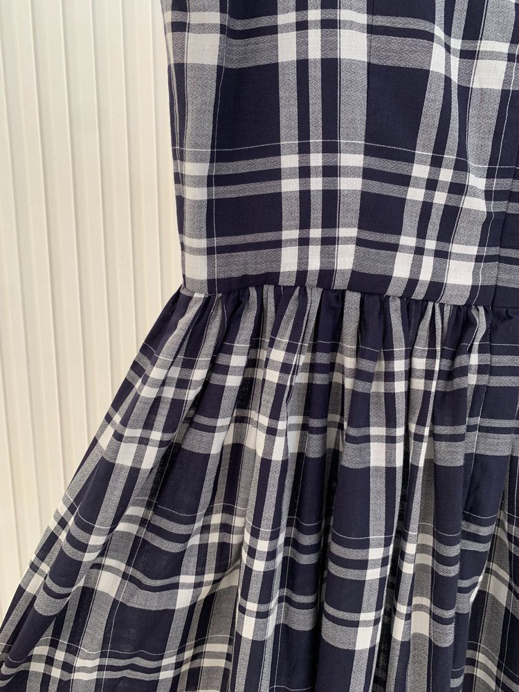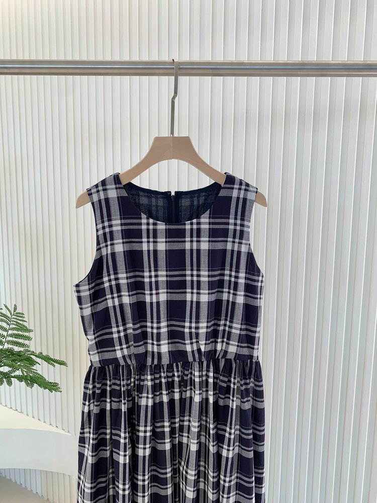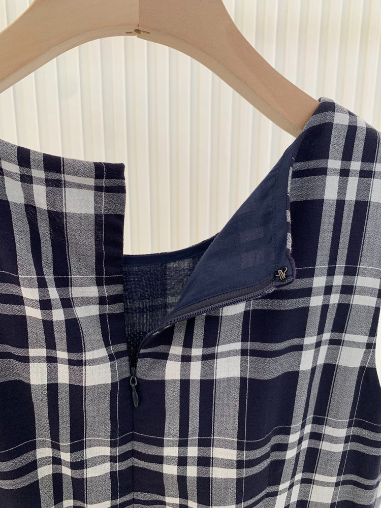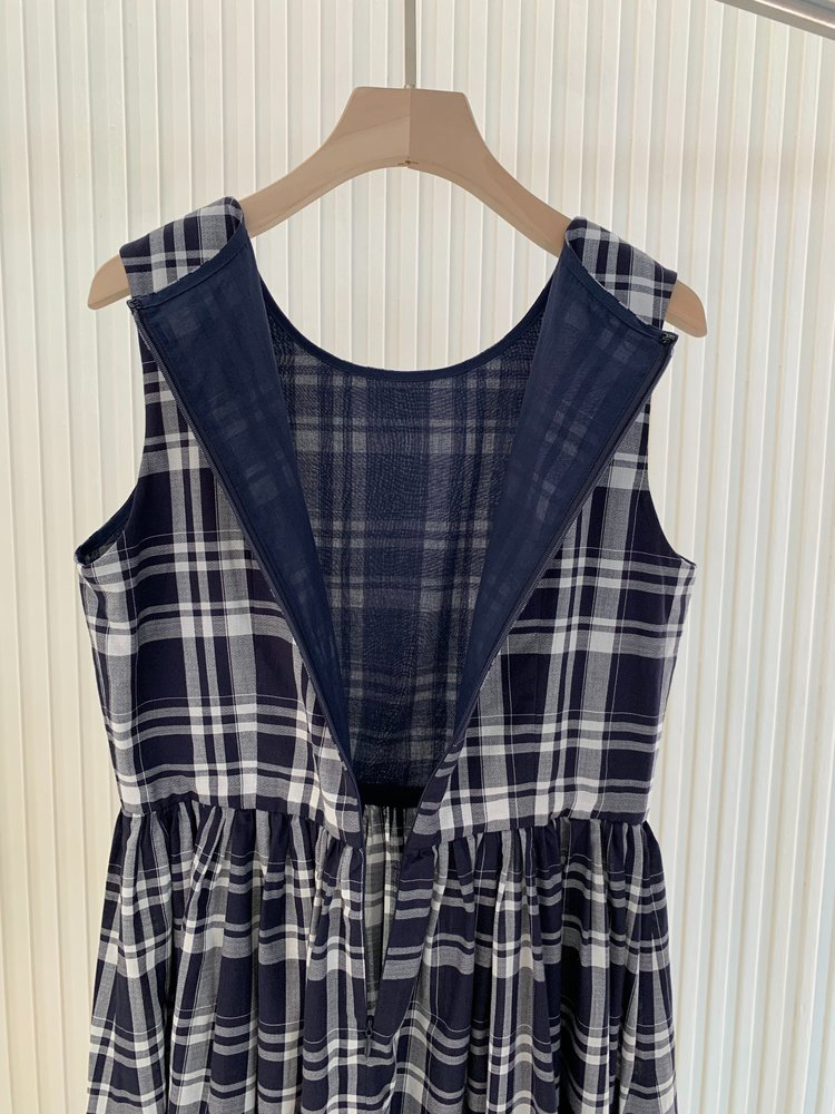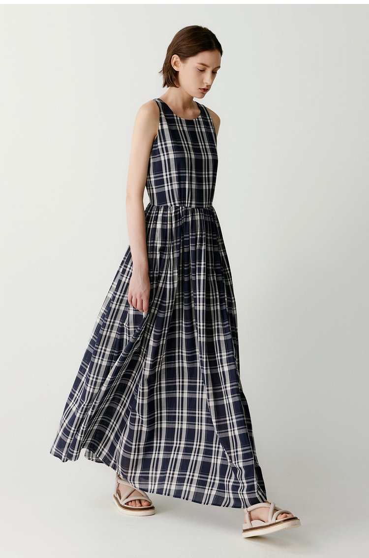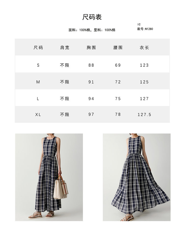 棉斜纹色织格松紧收腰连衣裙 进口面料斜纹棉格纹裙 收腰设计 勾勒腰部曲线 无袖X型收腰的黄金比例学 布面细洁美观 手感柔软舒适