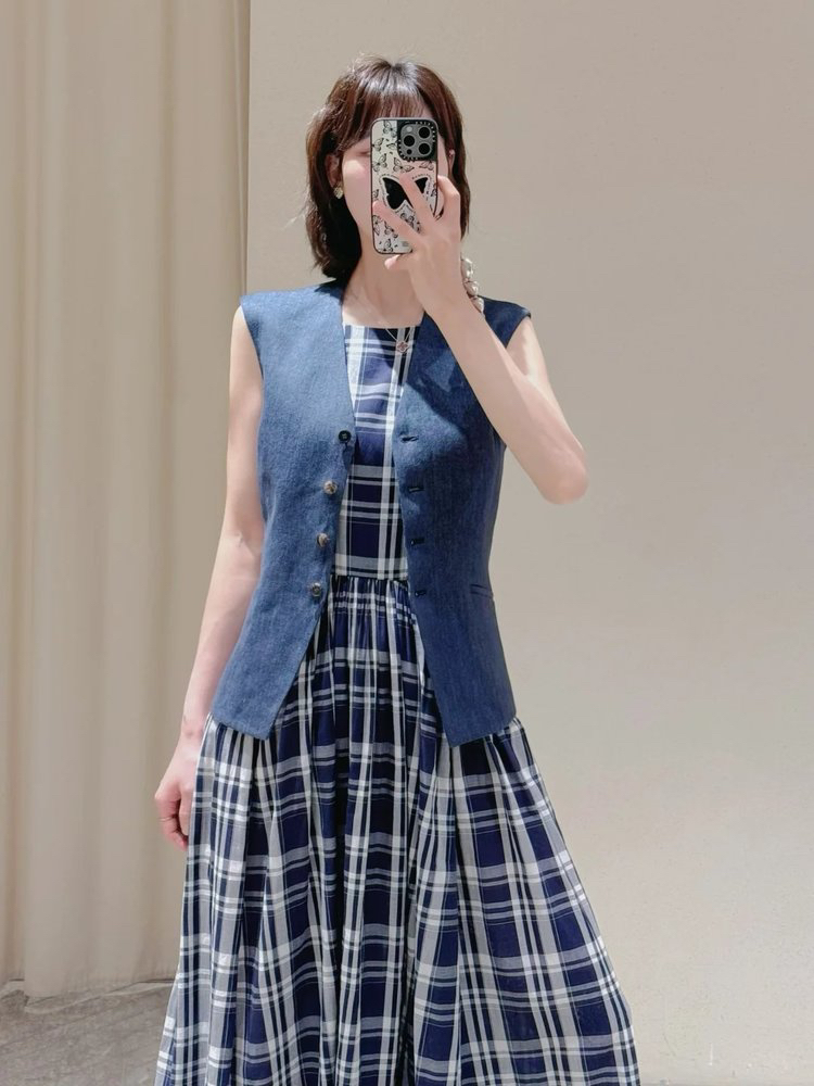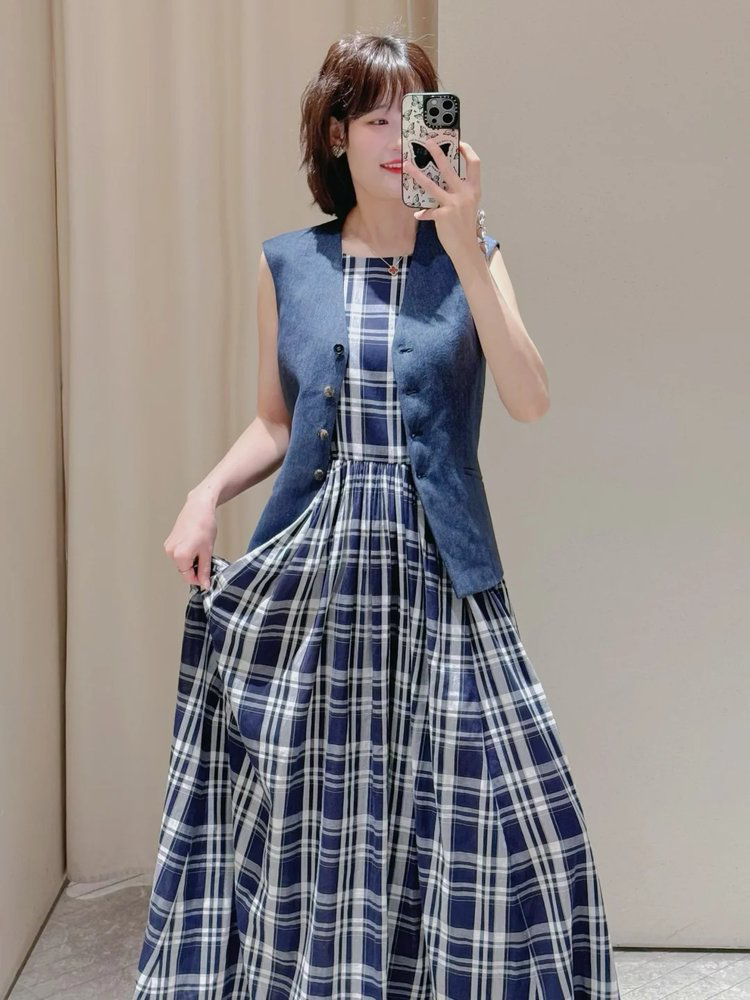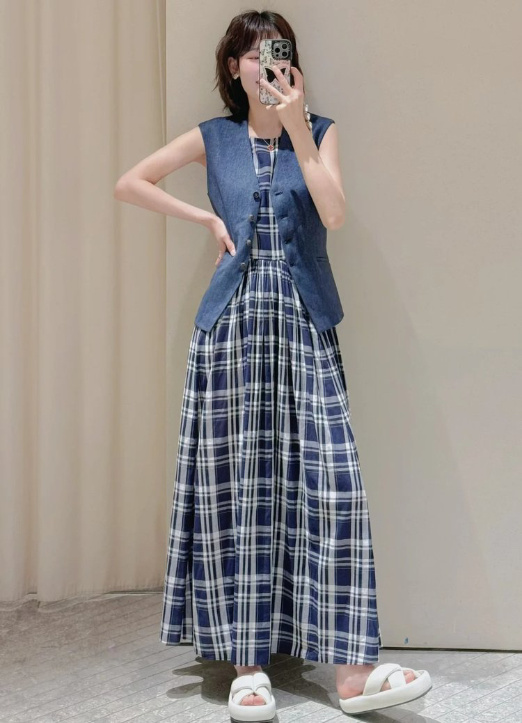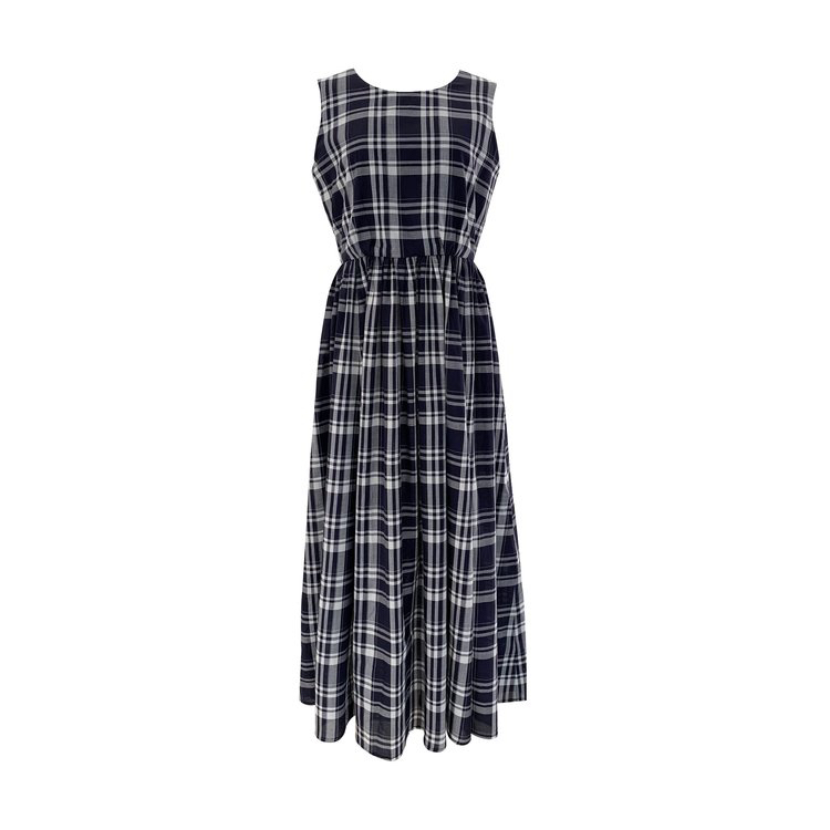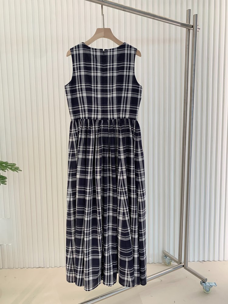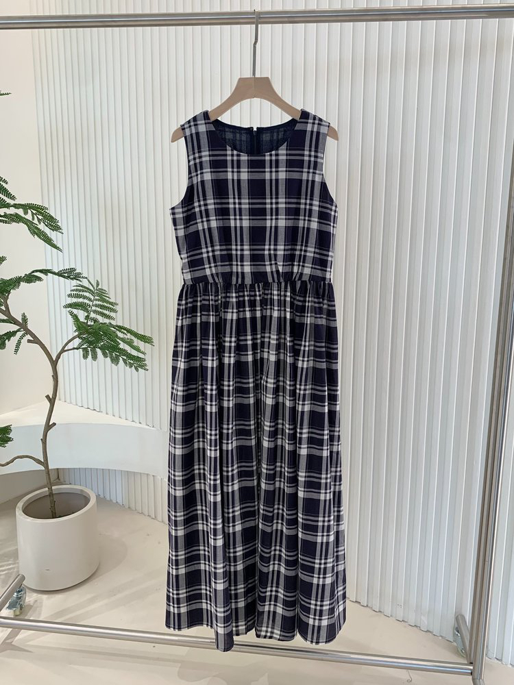 棉斜纹色织格松紧收腰连衣裙 进口面料斜纹棉格纹裙 收腰设计 勾勒腰部曲线 无袖X型收腰的黄金比例学 布面细洁美观 手感柔软舒适
