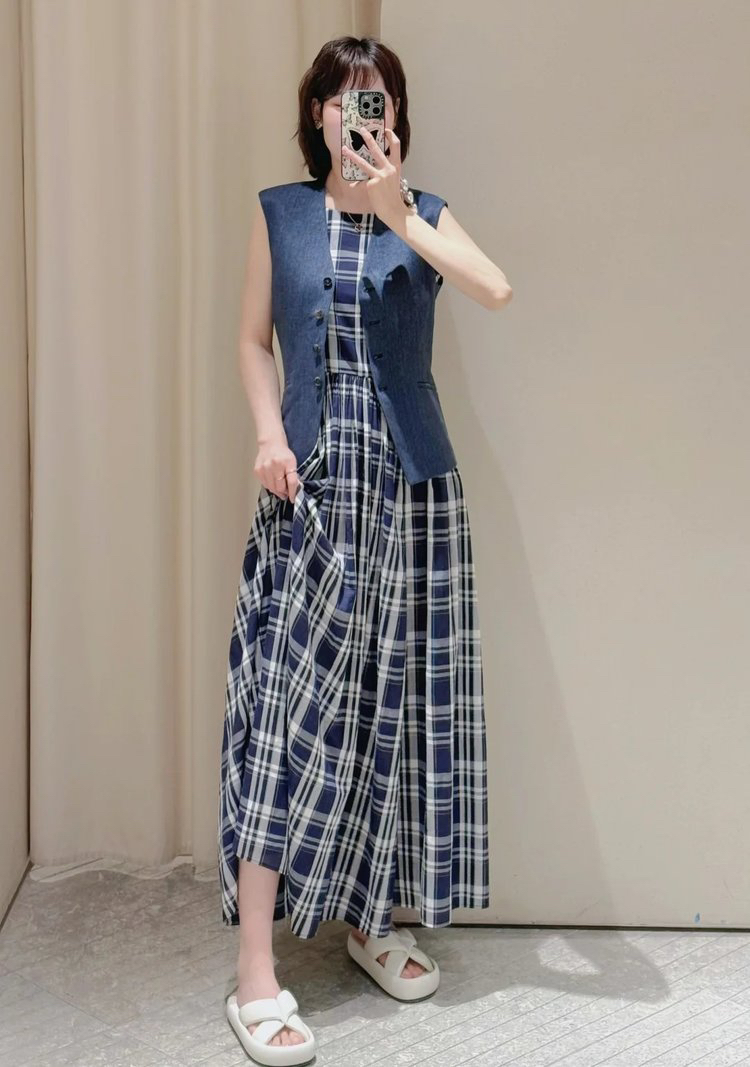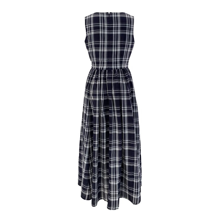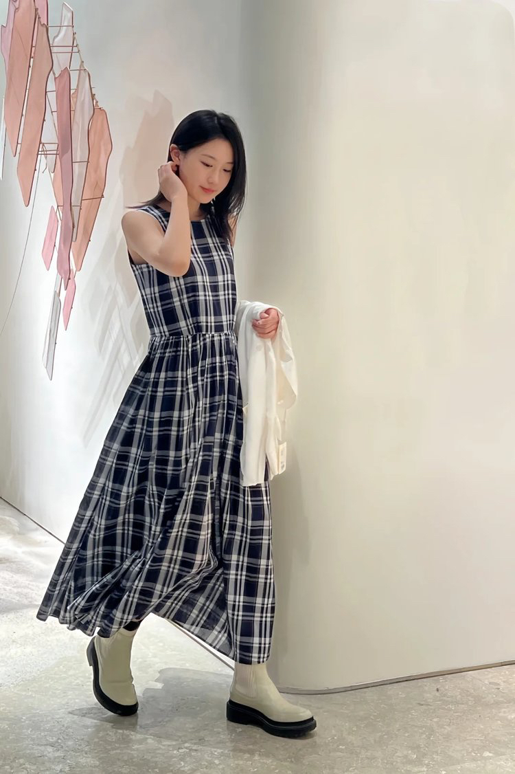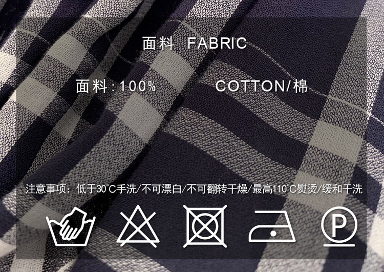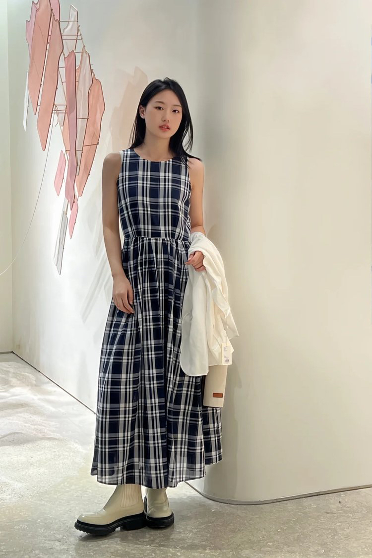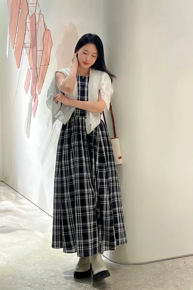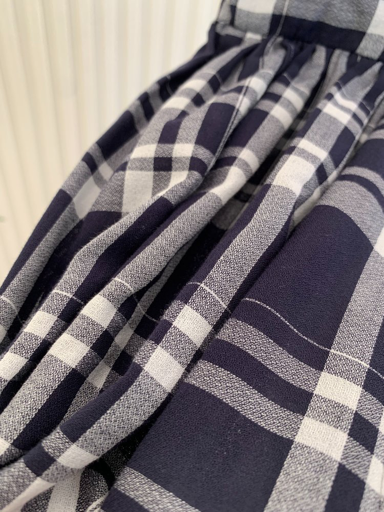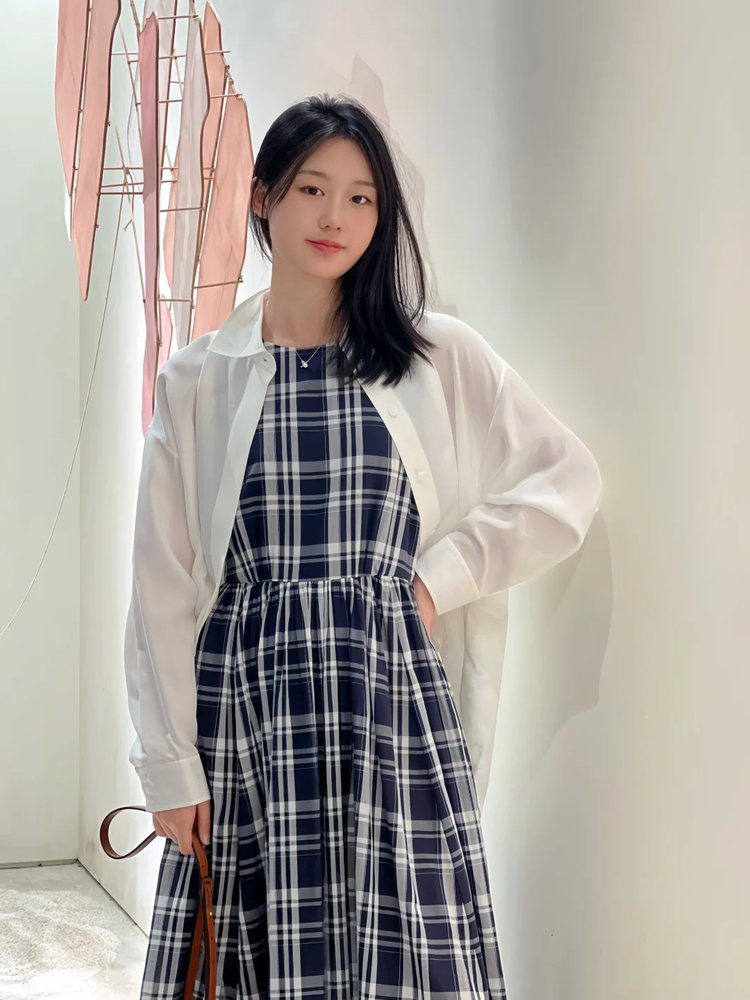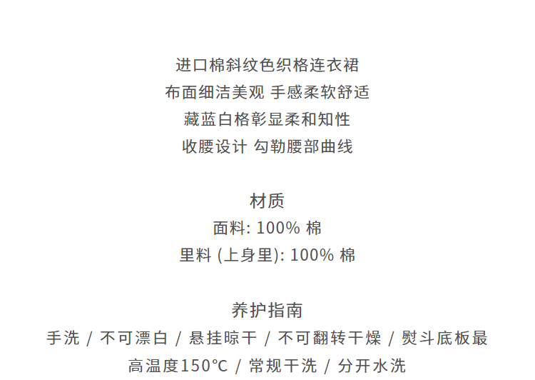 进口棉斜纹色织格连衣裙,布面细洁美观 手感柔软舒适,藏蓝白格彰显柔和知性,收腰设计 勾勒腰部曲线。