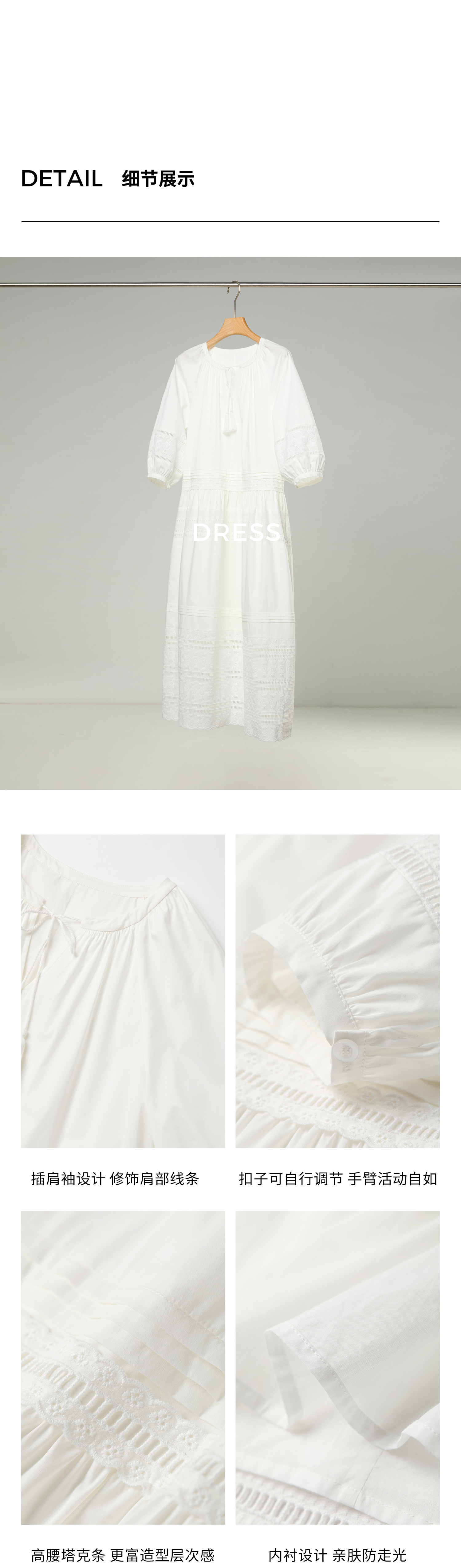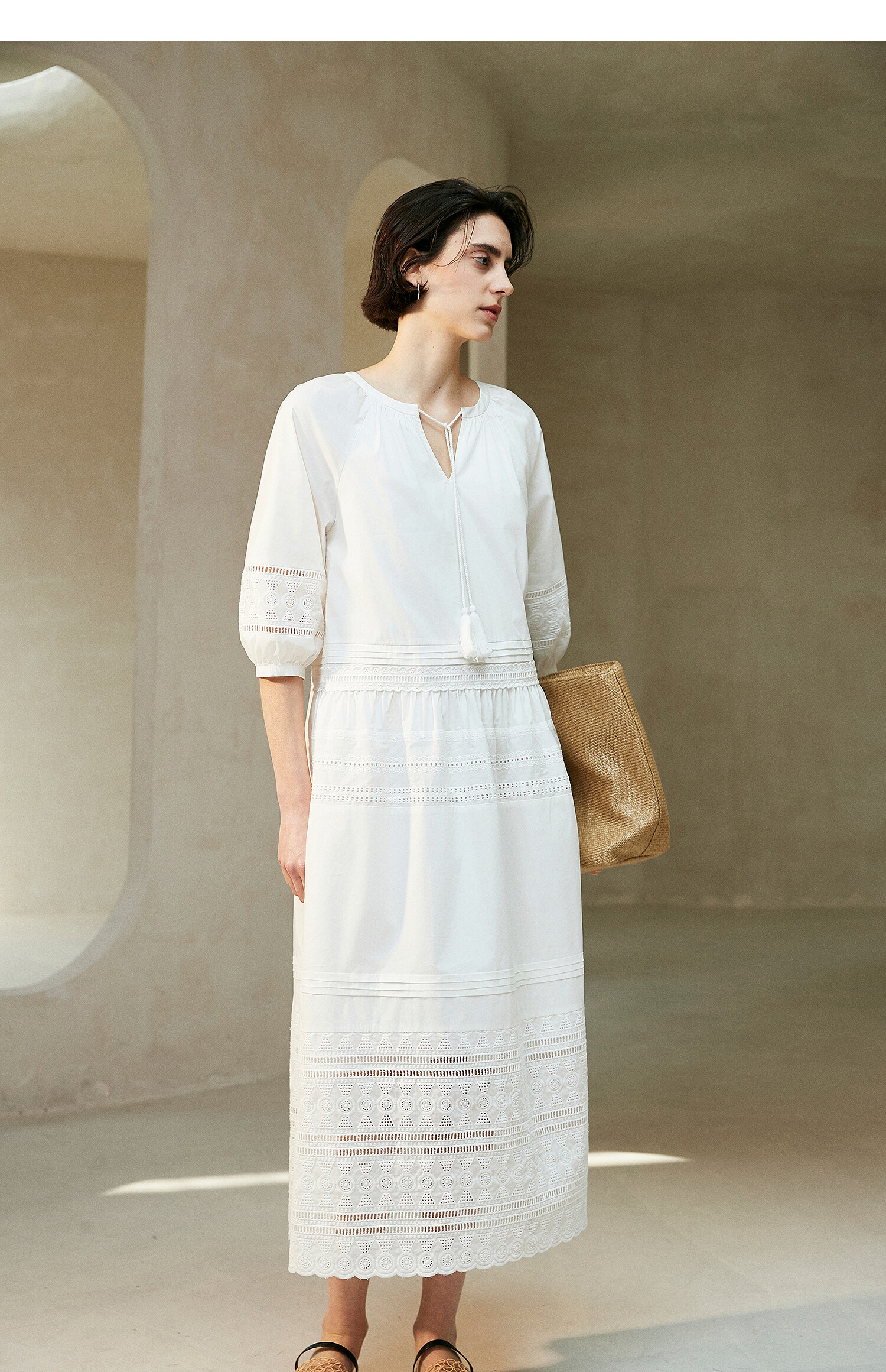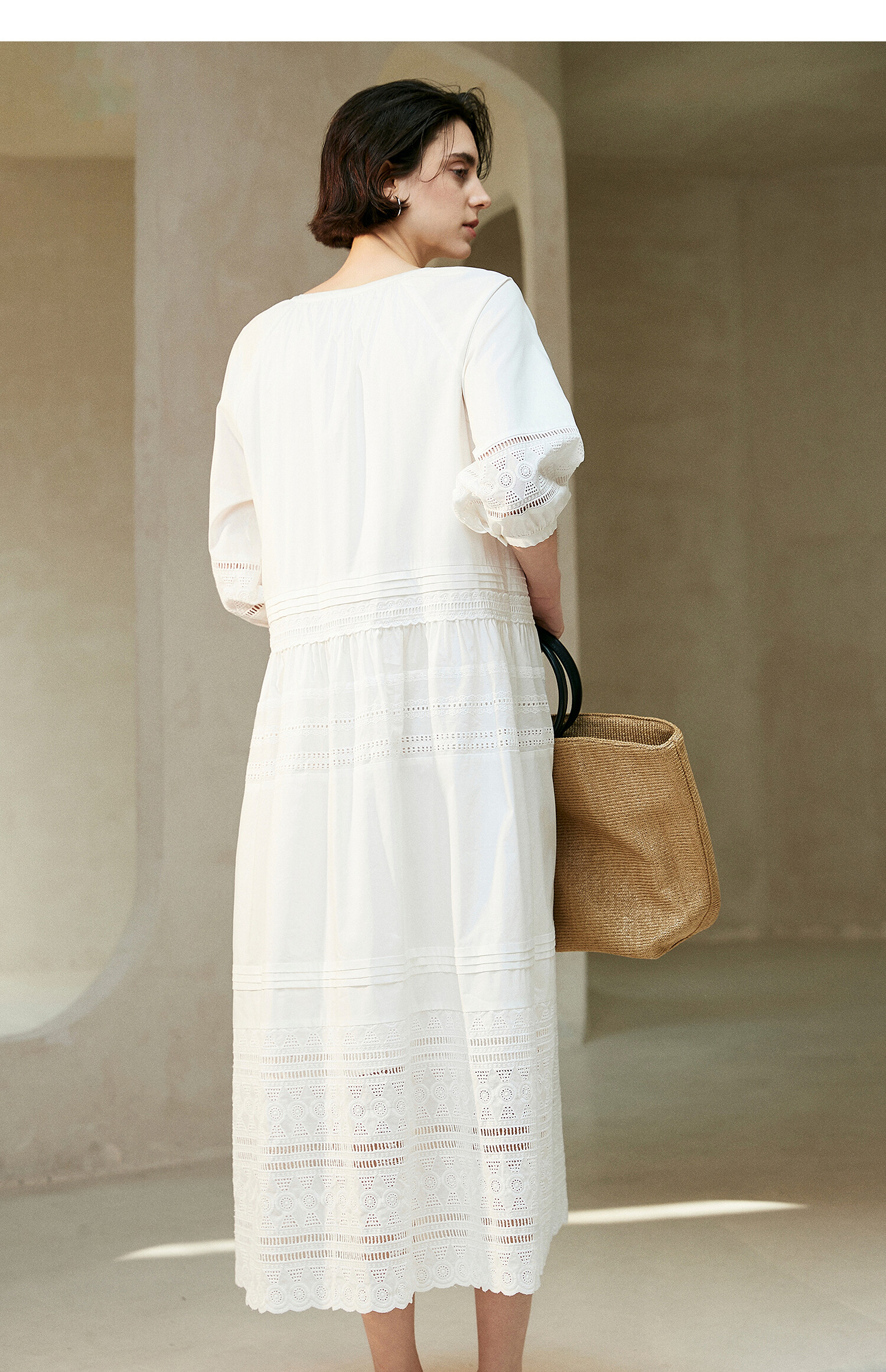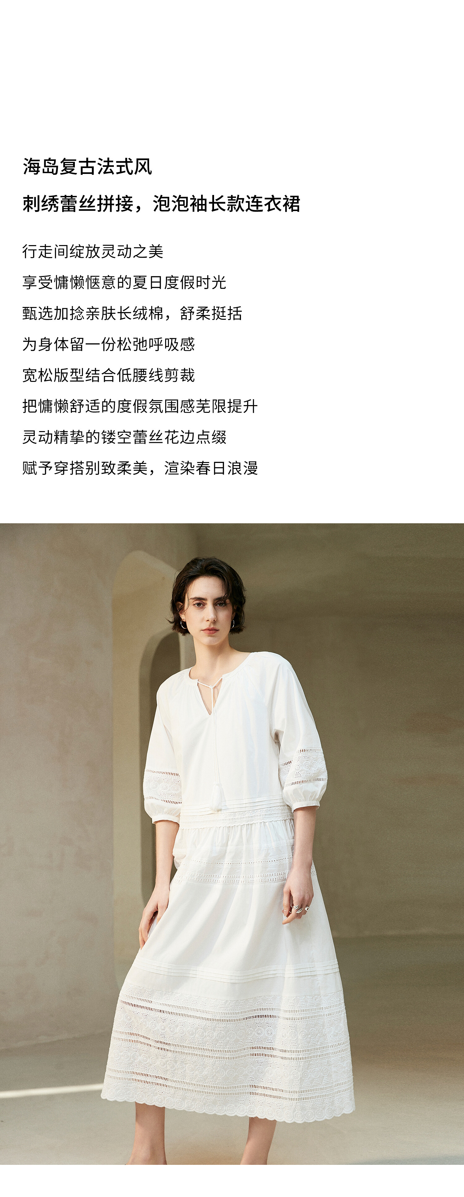 棉仓363616010初棉刺绣蕾丝拼接泡泡袖宽松--度假风长款连衣裙
