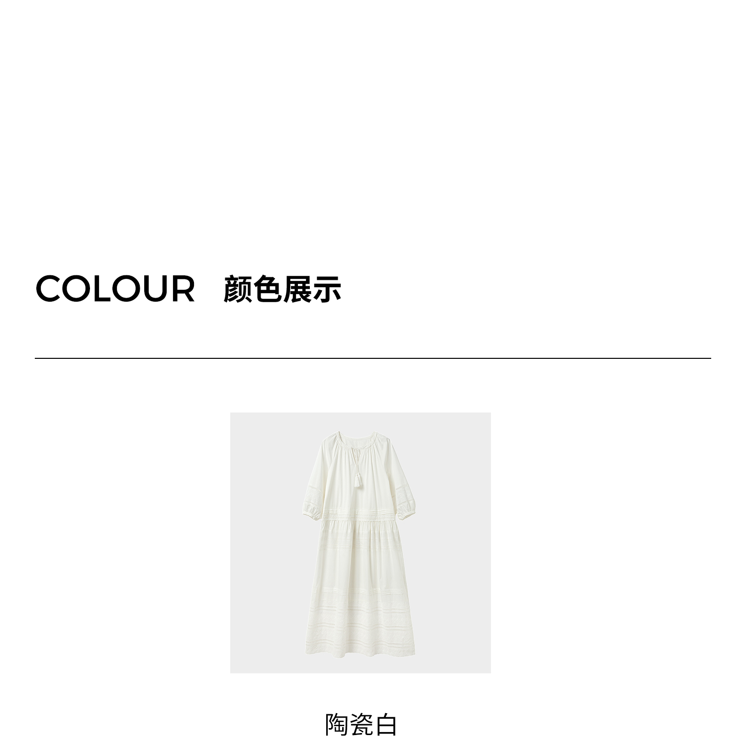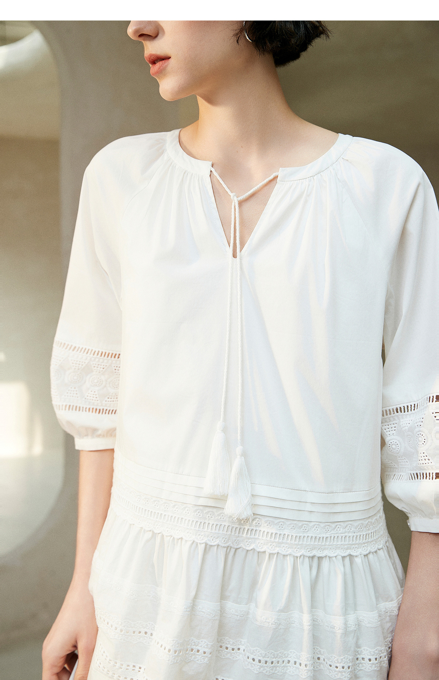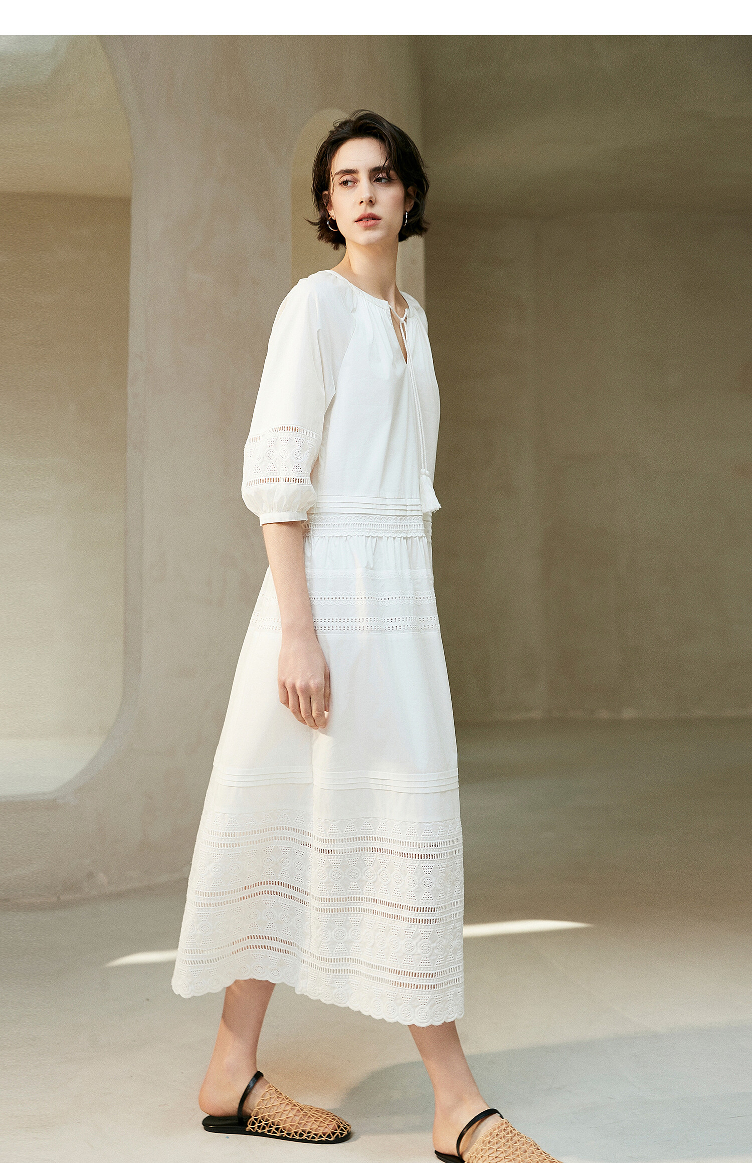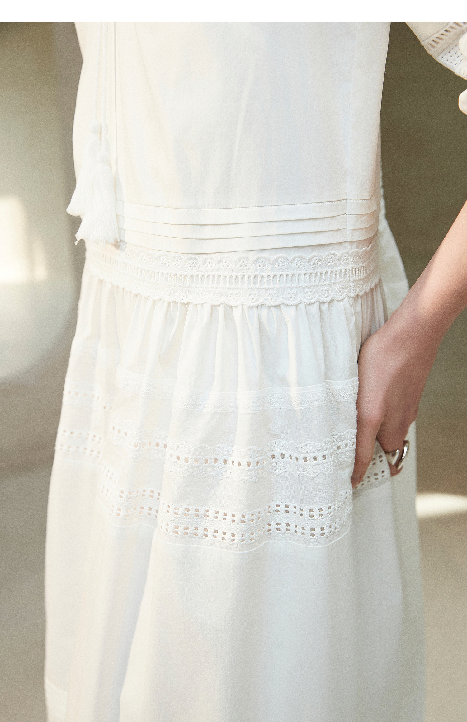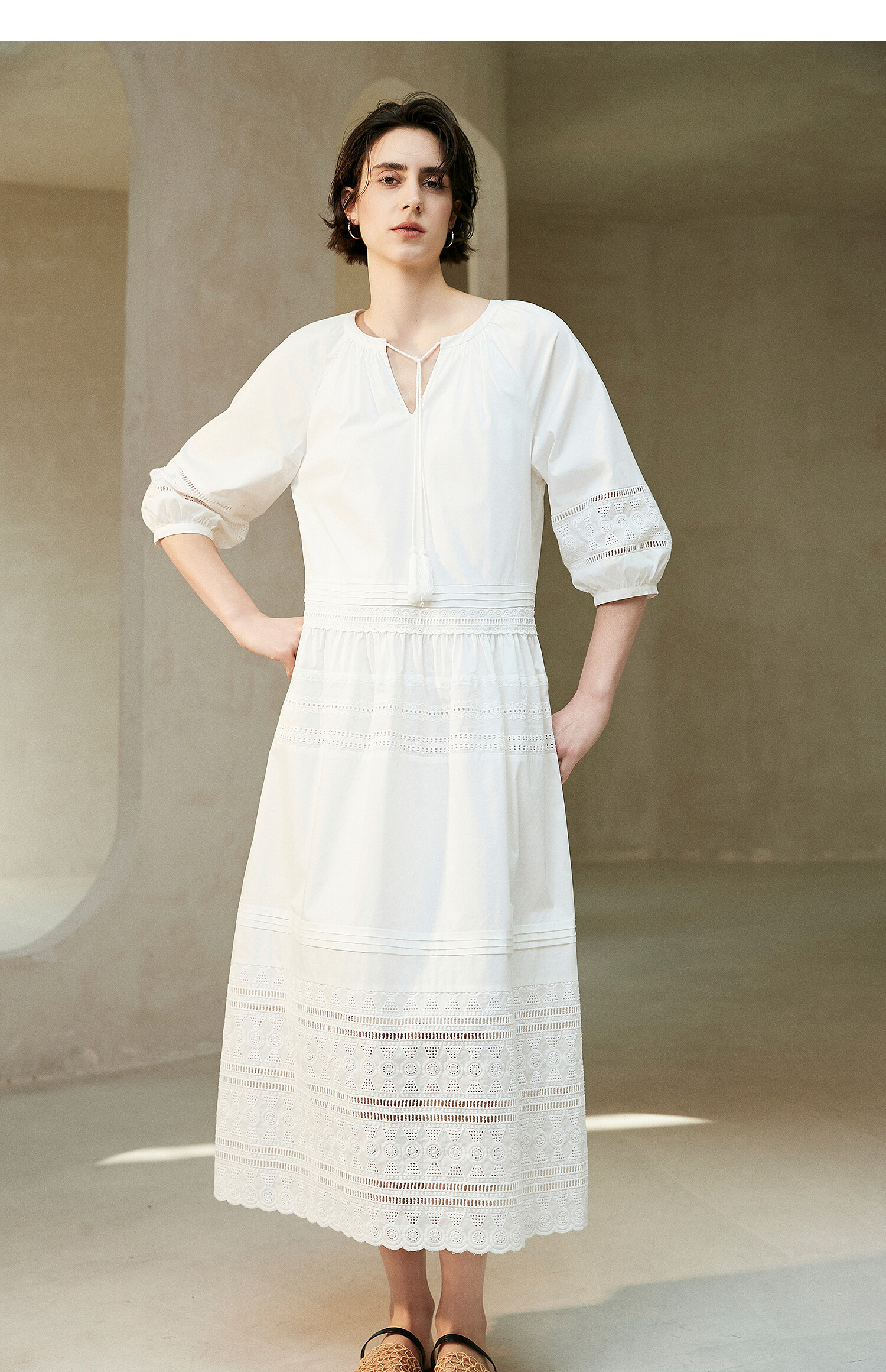 棉仓363616010初棉刺绣蕾丝拼接泡泡袖宽松--度假风长款连衣裙