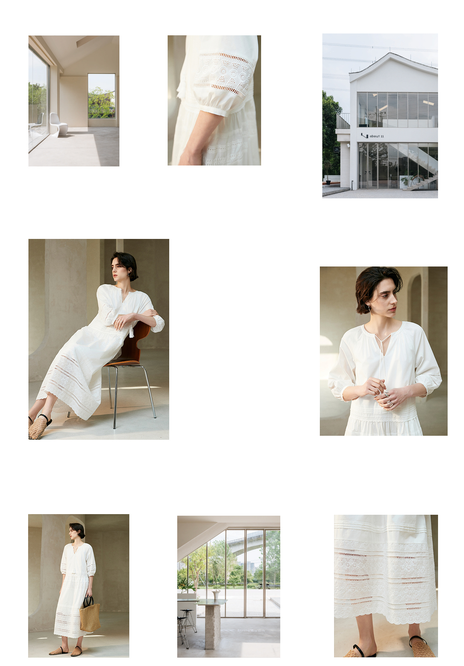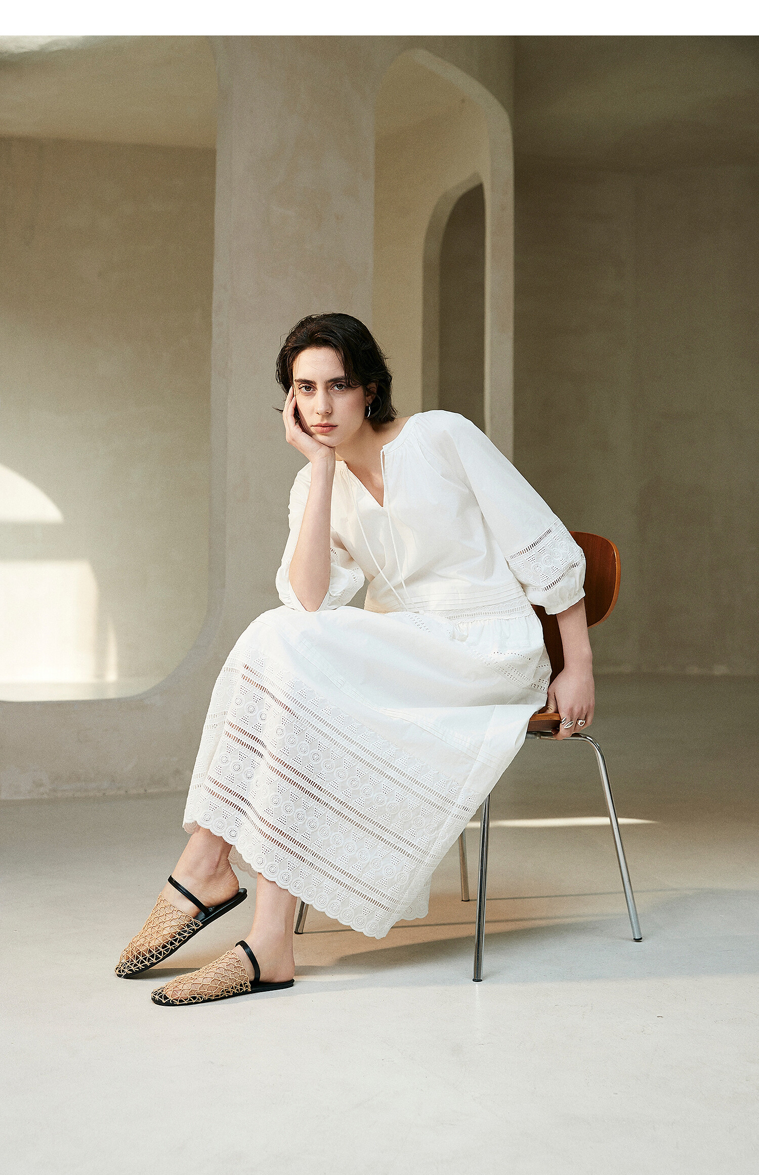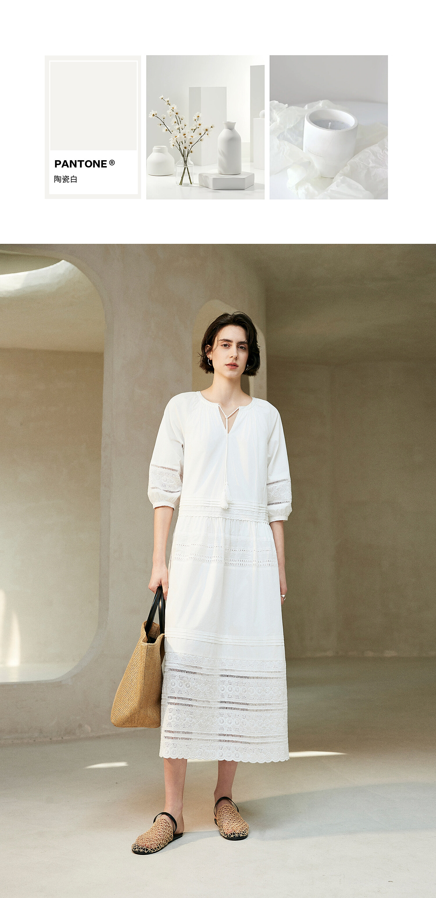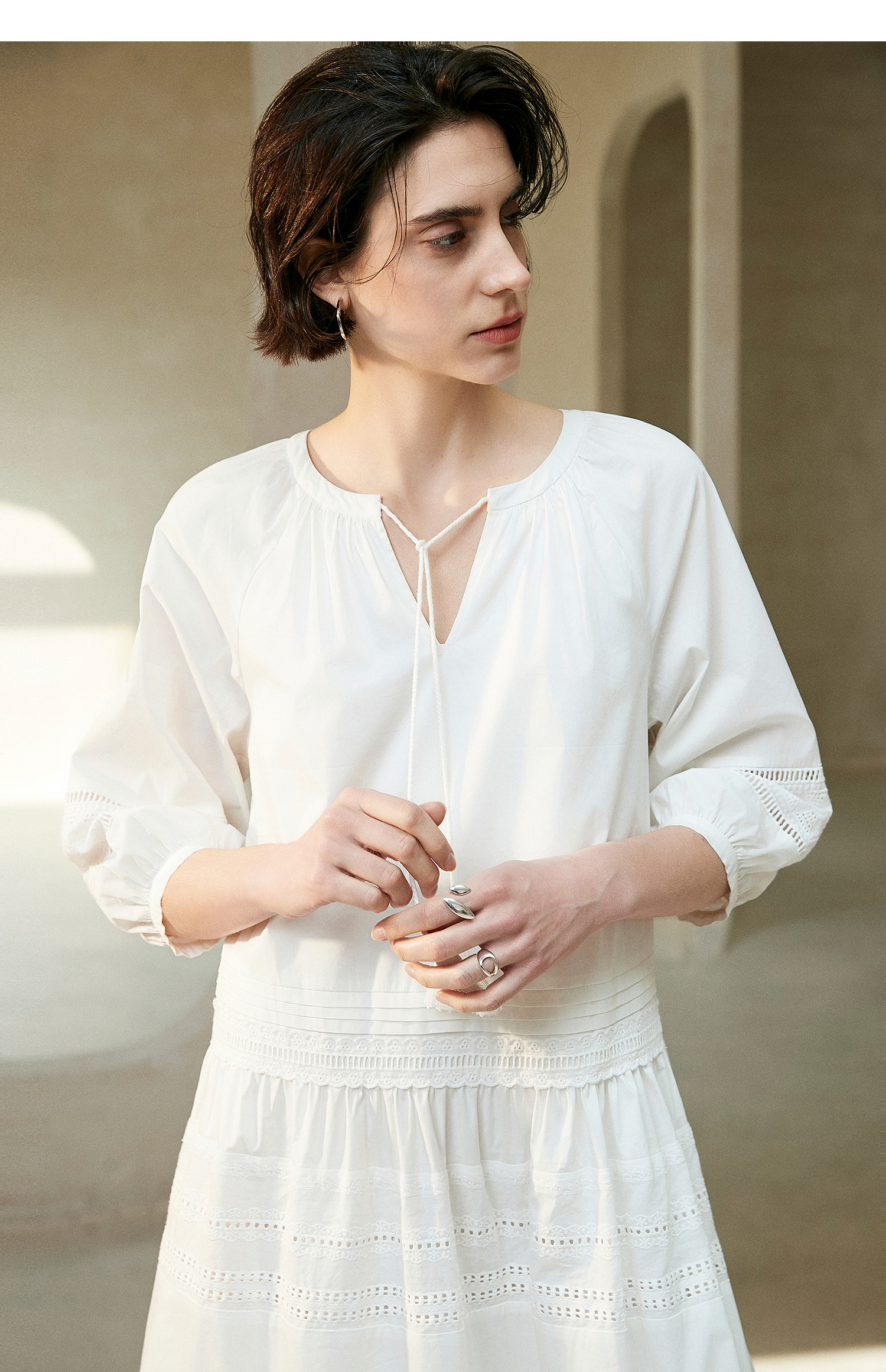 棉仓363616010初棉刺绣蕾丝拼接泡泡袖宽松--度假风长款连衣裙