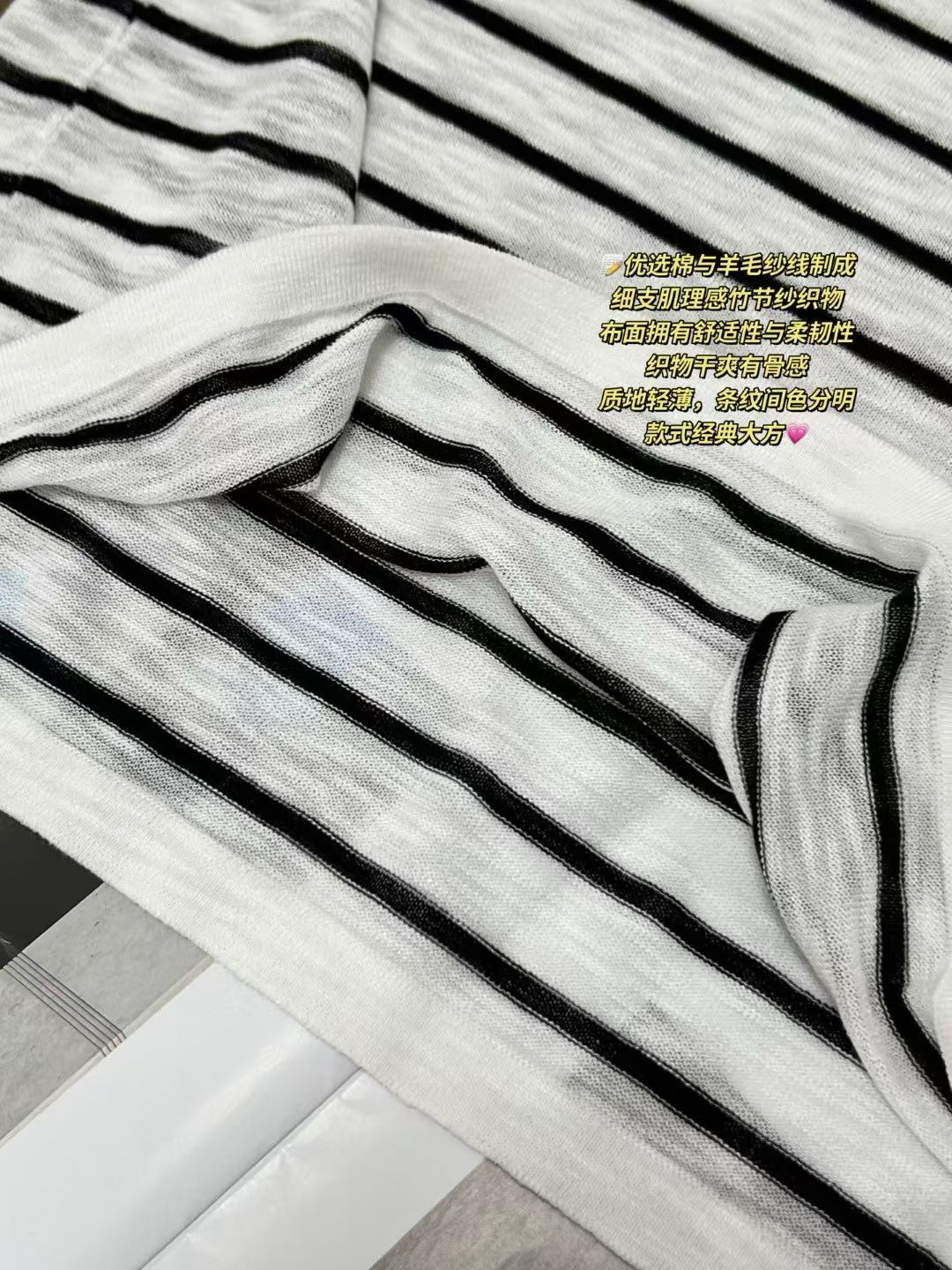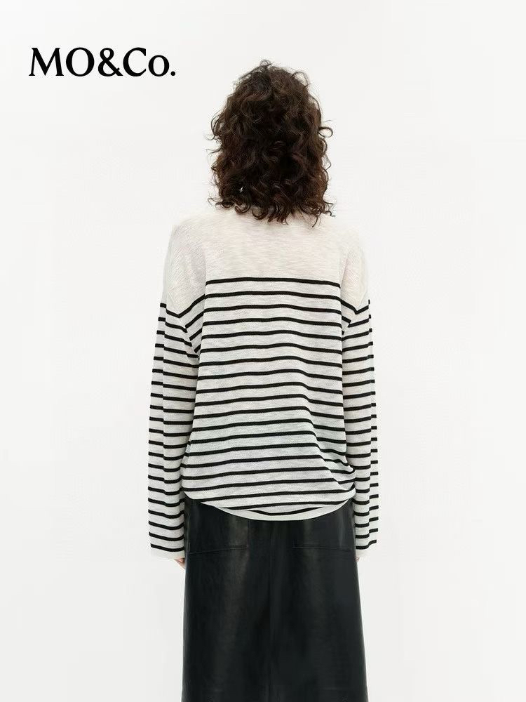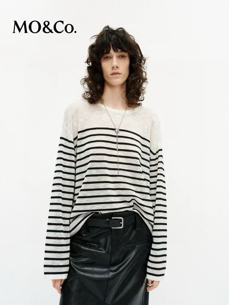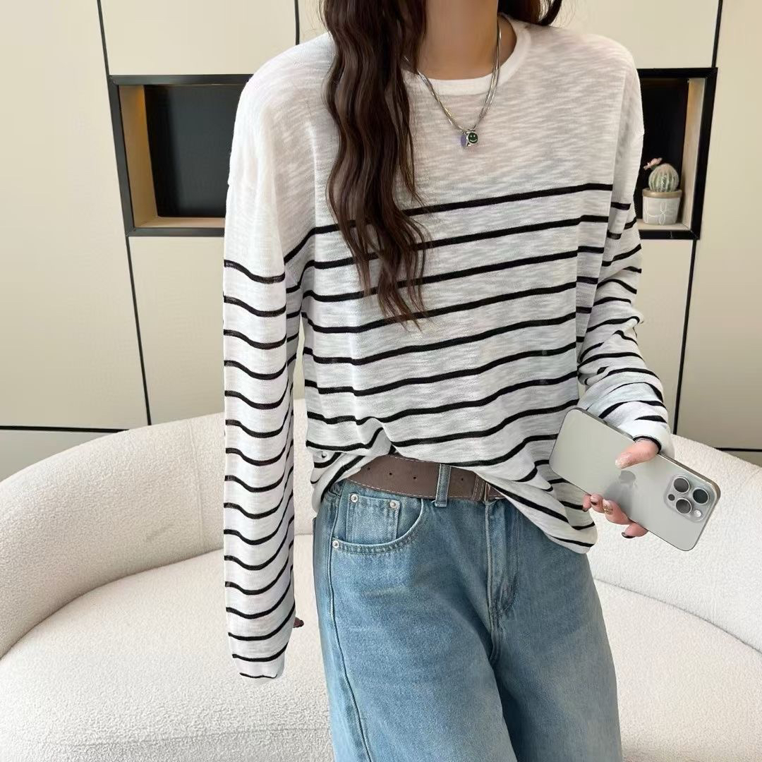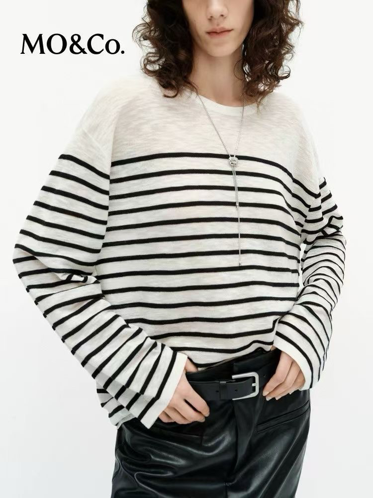 MO家 春夏黑白条纹落肩肌理感轻柔 微透圆领百搭防晒针织衫长袖