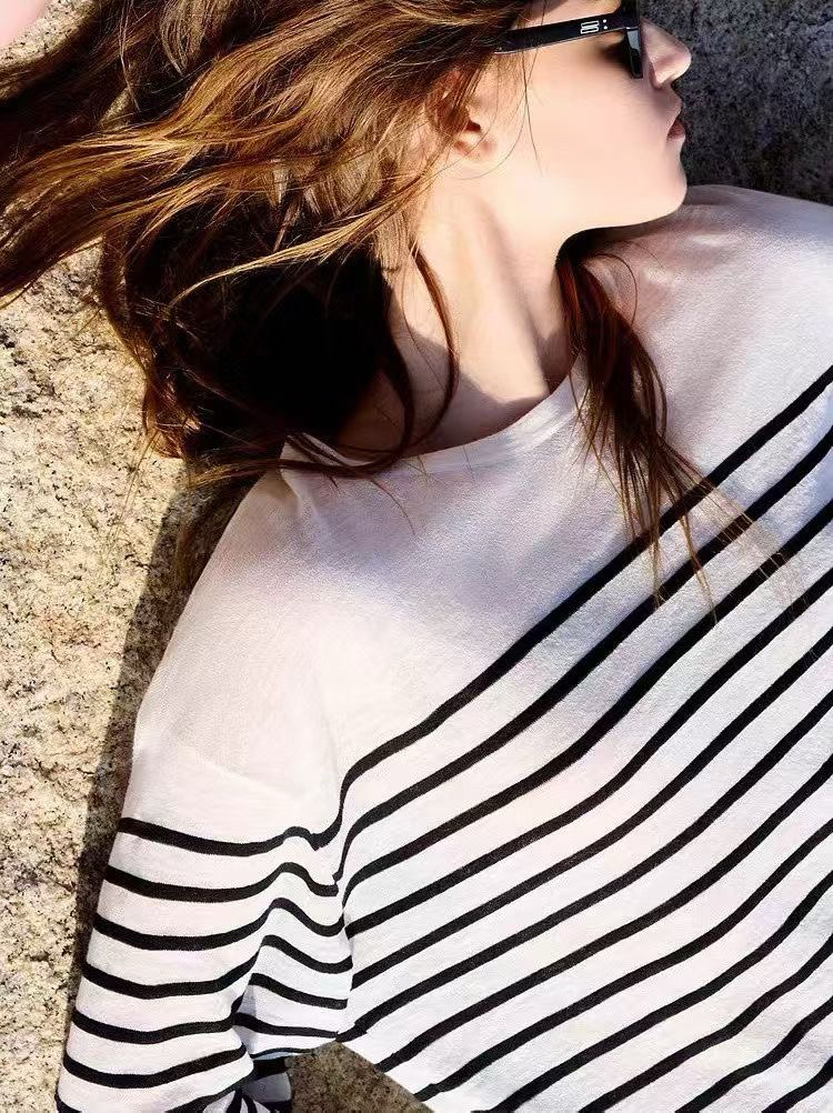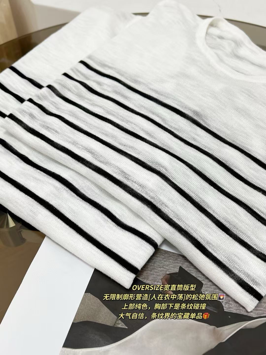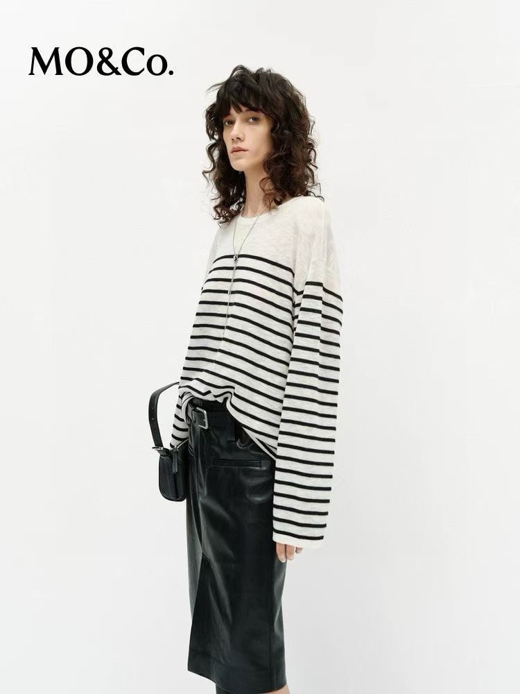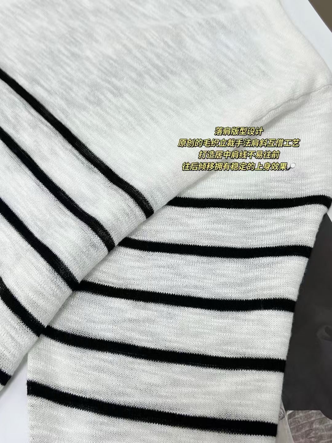 MO家 春夏黑白条纹落肩肌理感轻柔 微透圆领百搭防晒针织衫长袖