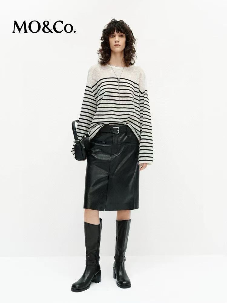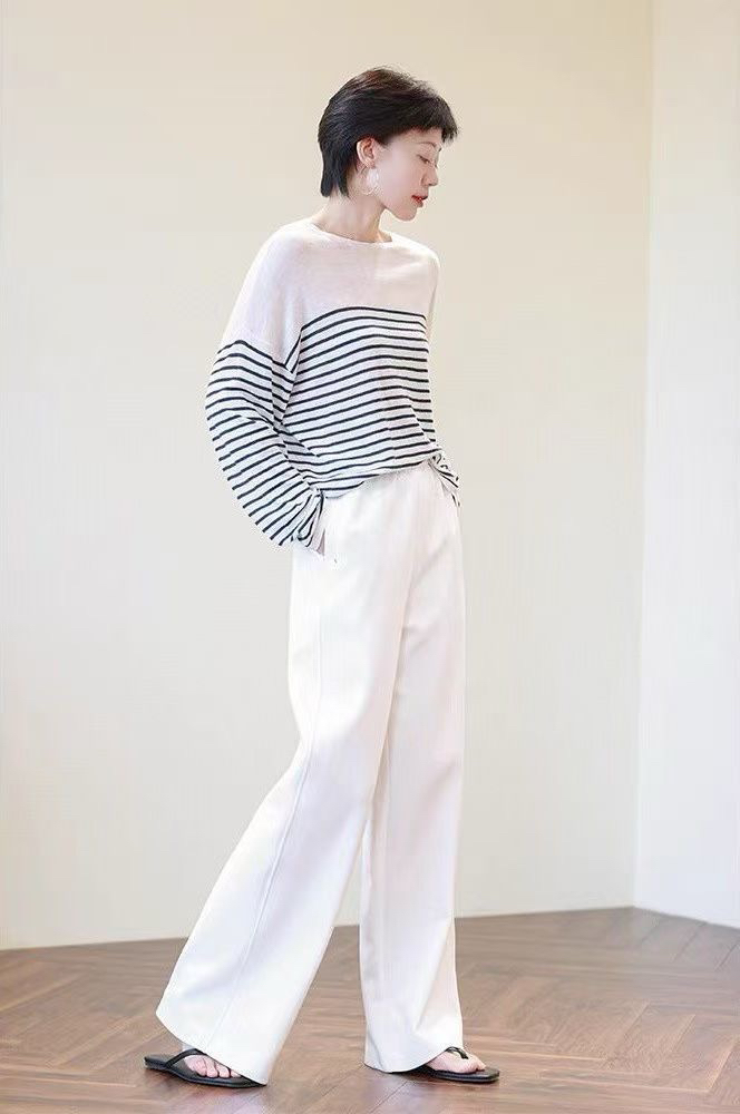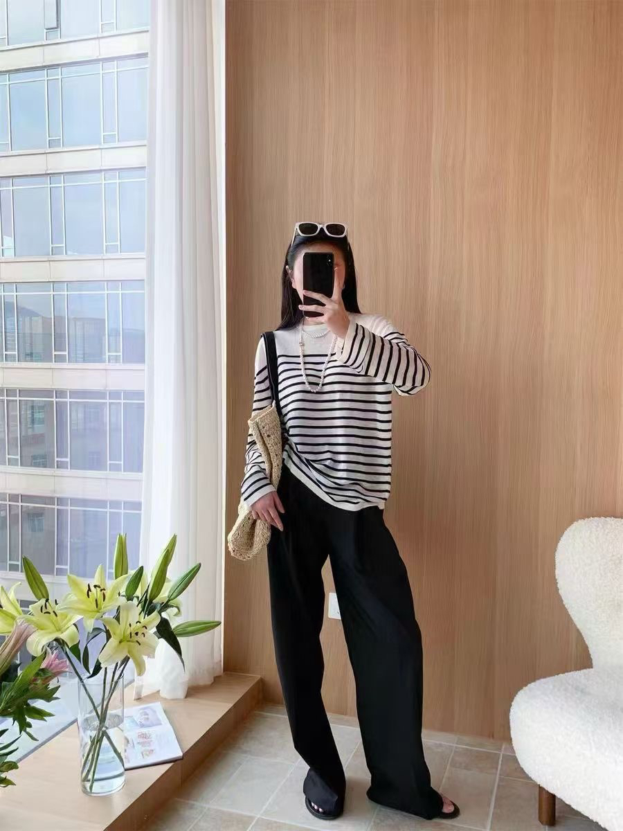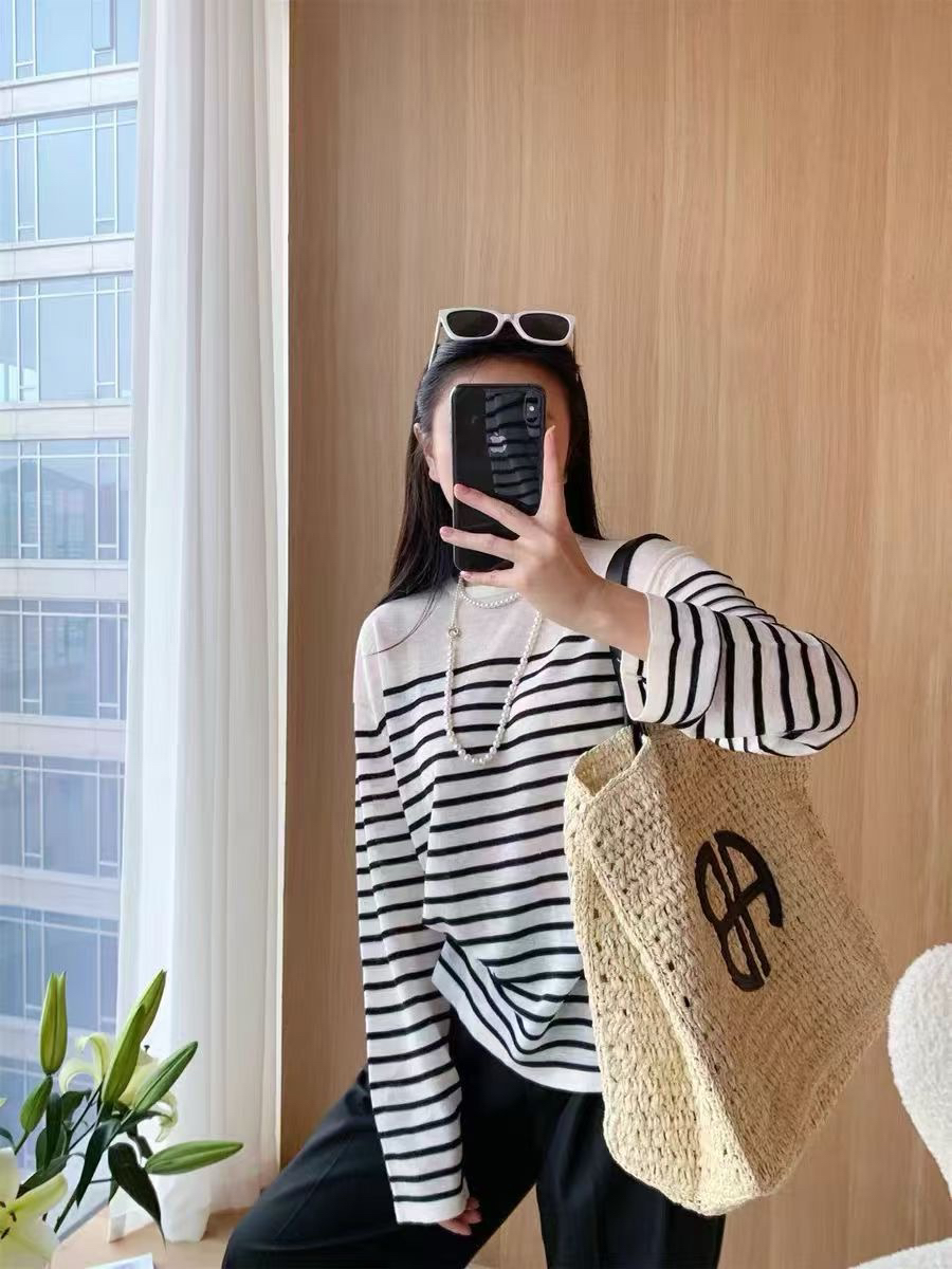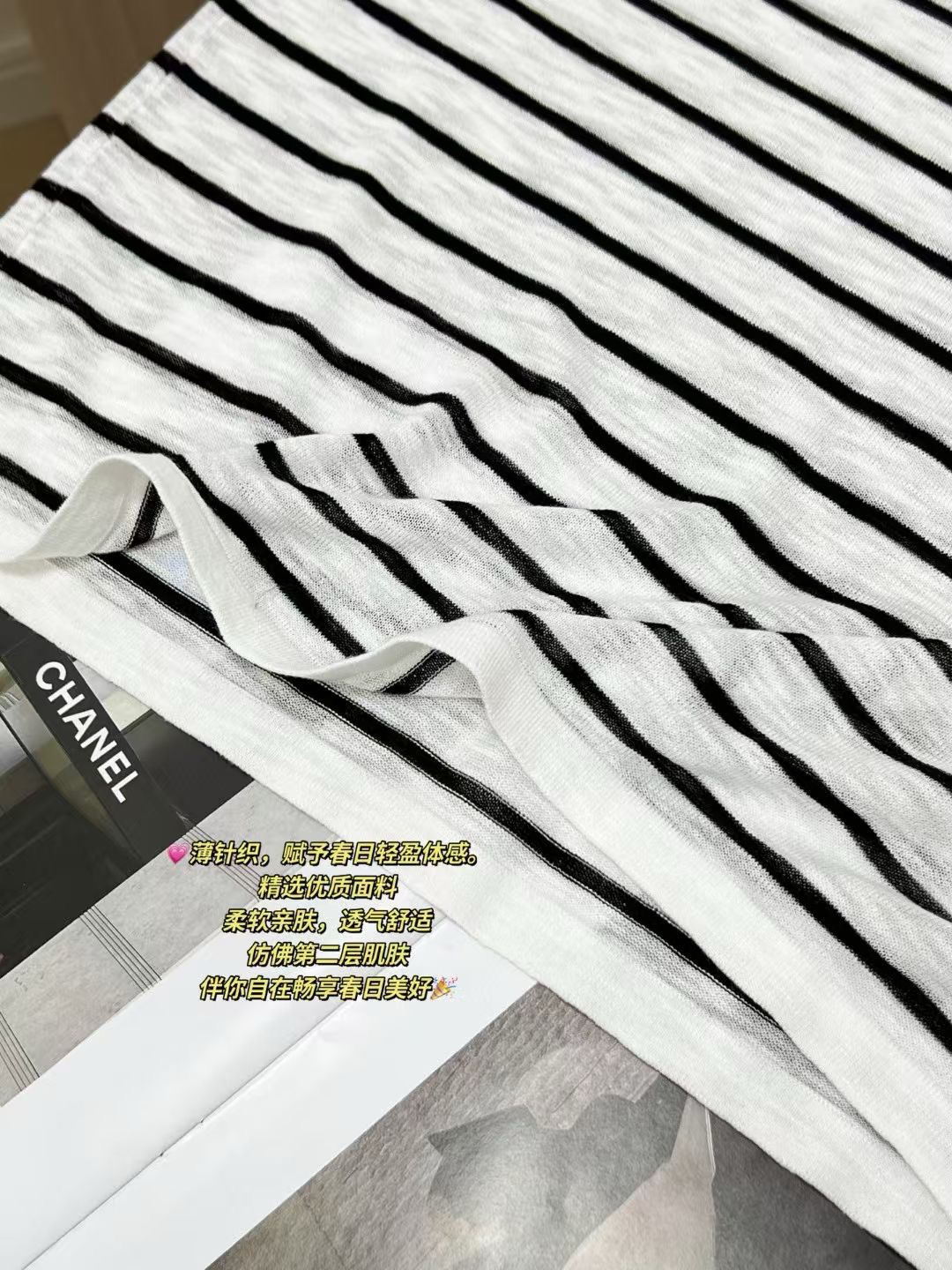 MO家 春夏黑白条纹落肩肌理感轻柔 微透圆领百搭防晒针织衫长袖
