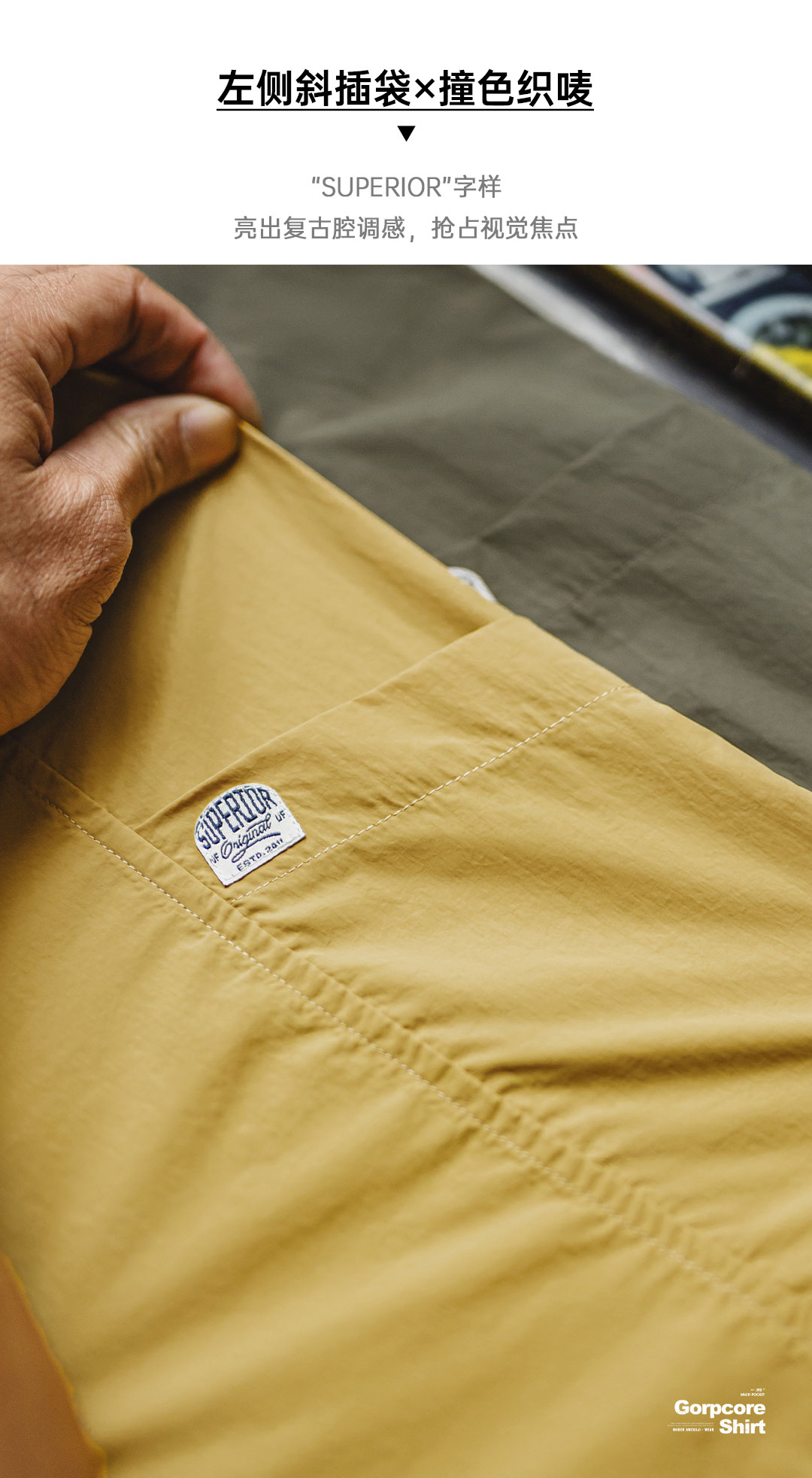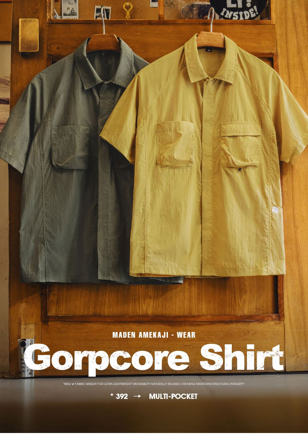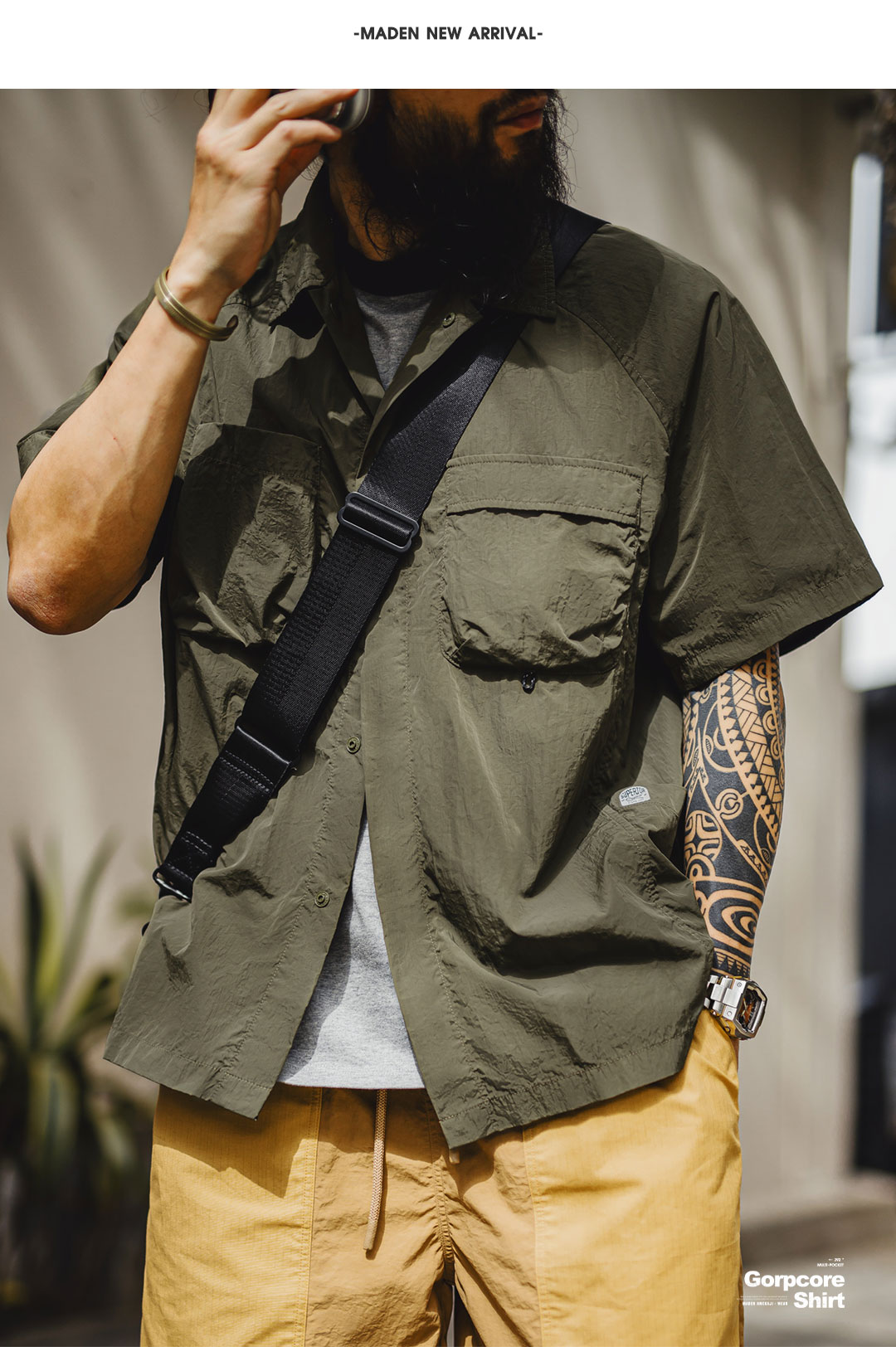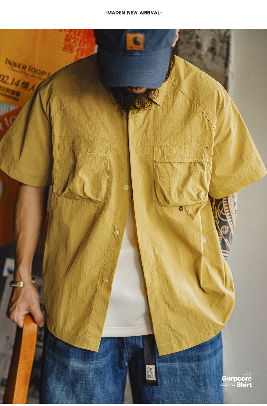 马登工装山系户外短袖衬衫速干黄色肌理感薄款日系口袋衬衣男款夏