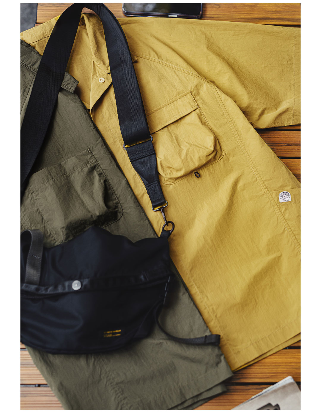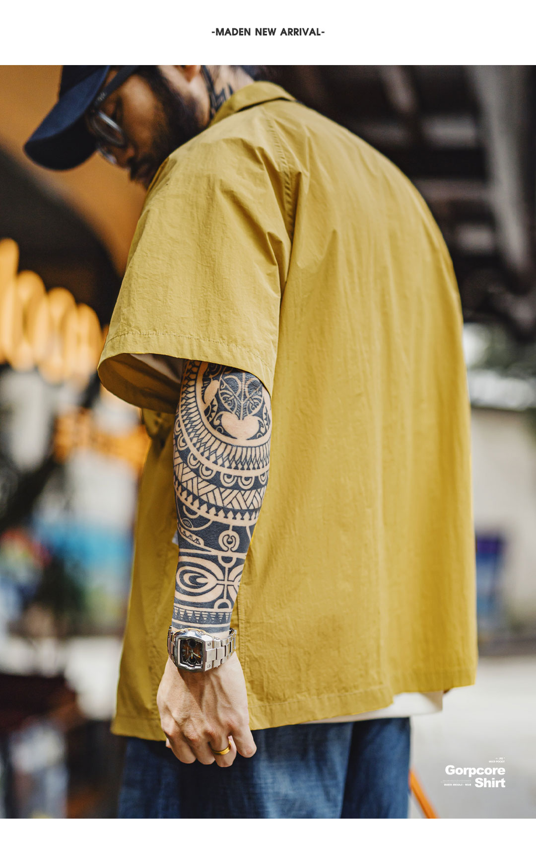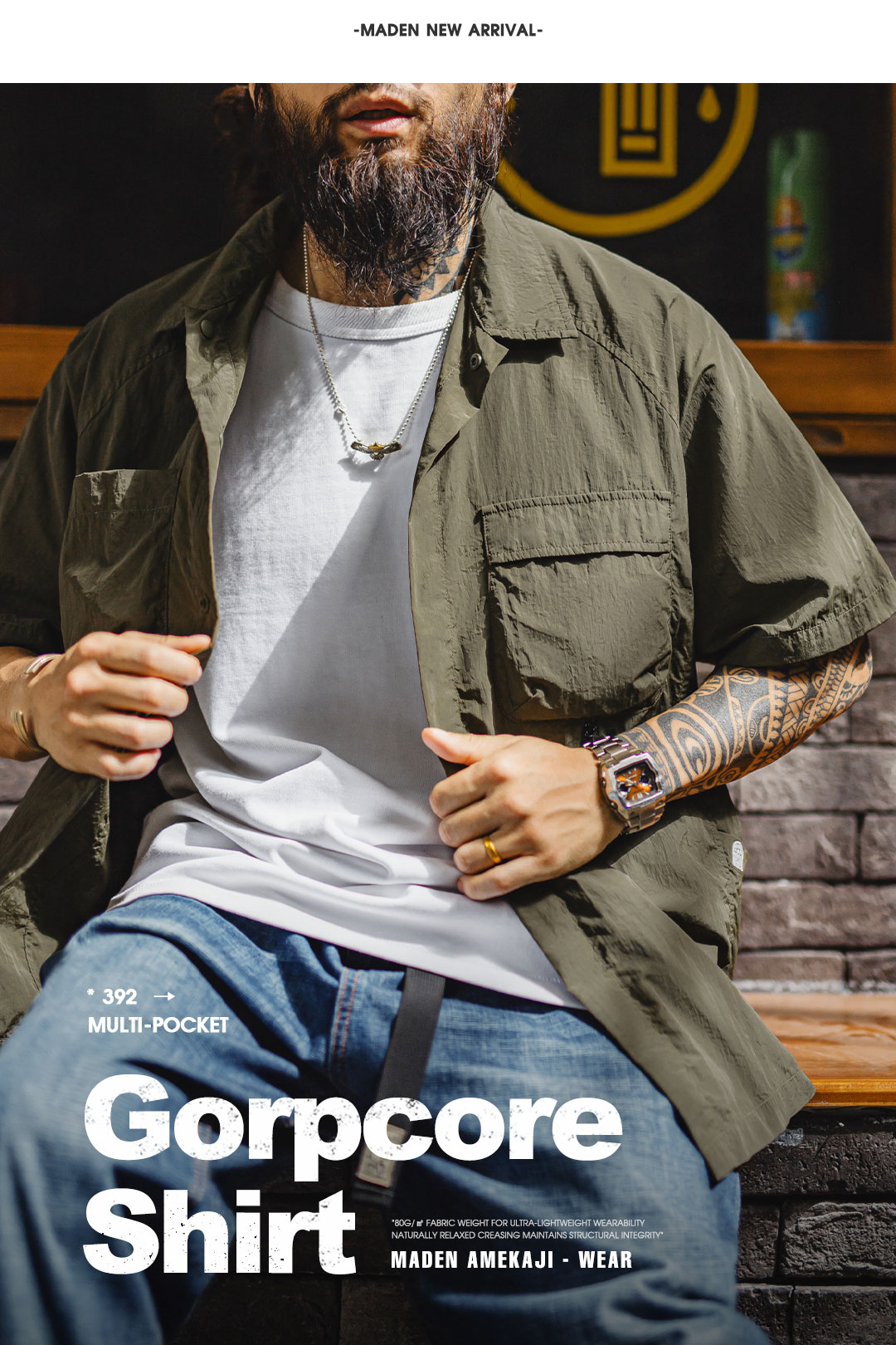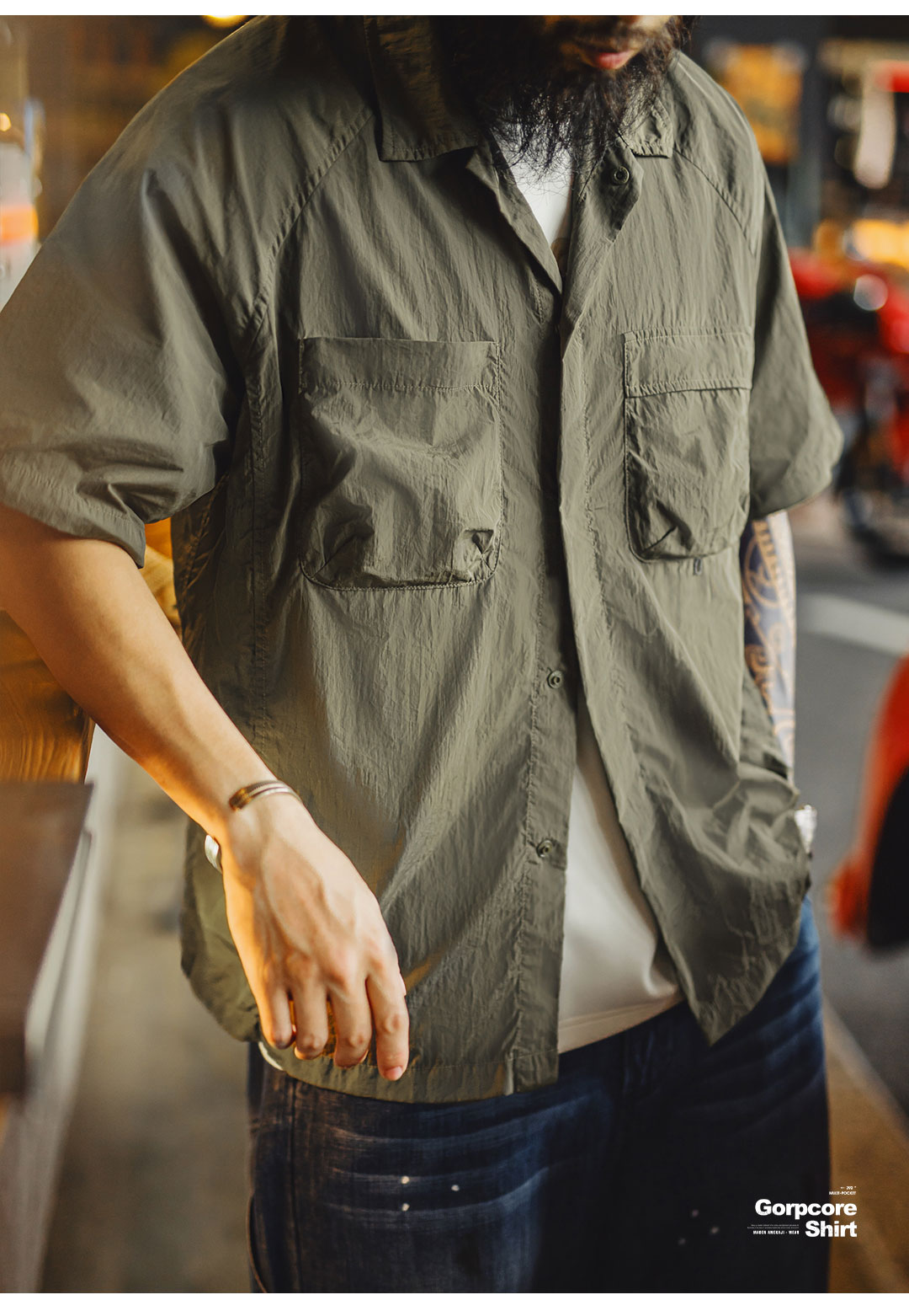马登工装山系户外短袖衬衫速干黄色肌理感薄款日系口袋衬衣男款夏