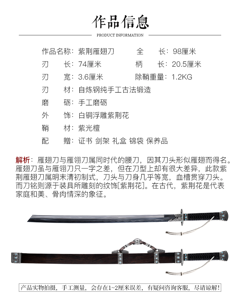 紫荆雁翅刀剑 手工传统一体刀剑花纹钢刀剑龙泉沈广隆宝剑 未开刃