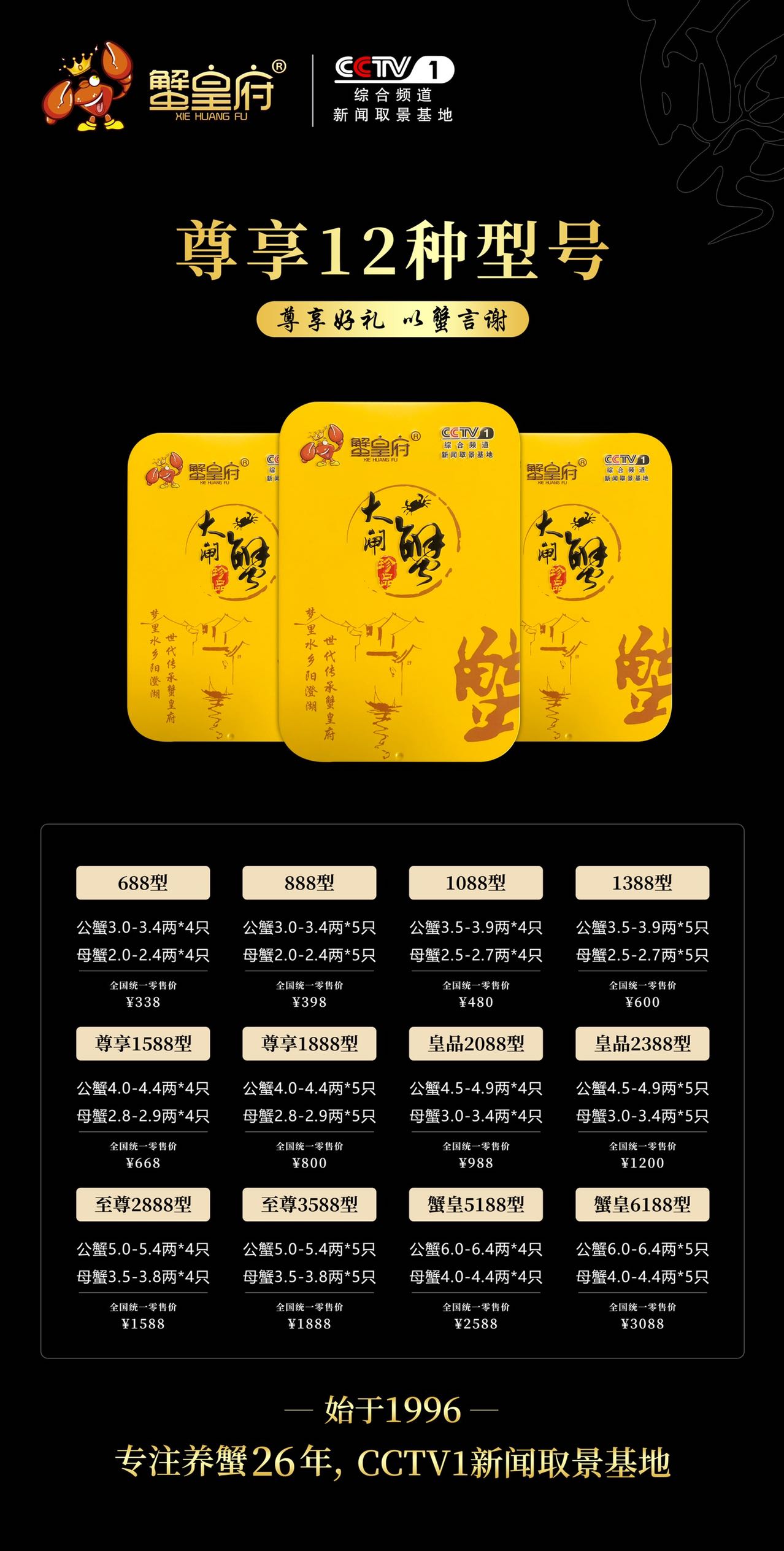 尊享1588、1888型:公蟹4.0-4.4两,母蟹2.8-2.9两