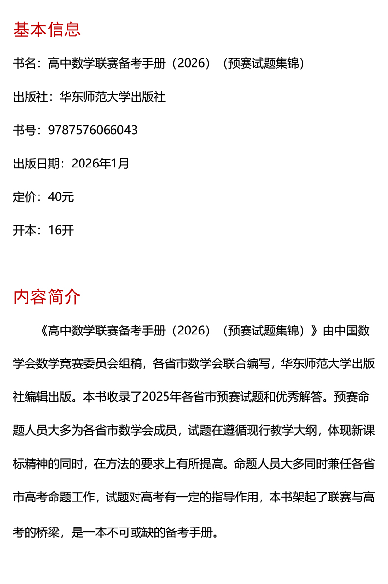 高中数学联赛备考手册 2026 预赛试题集锦 中国数学会数学竞赛委员会编