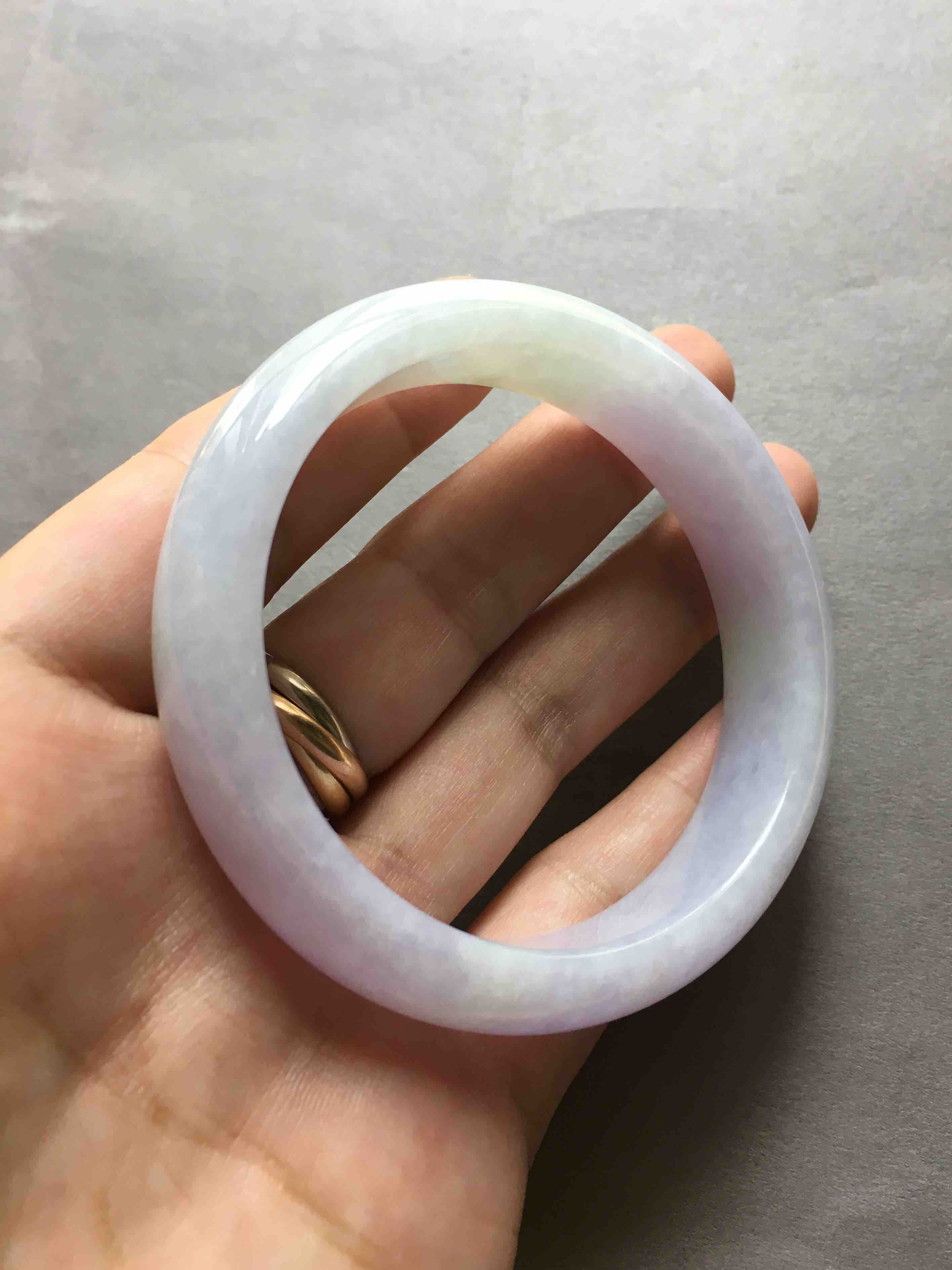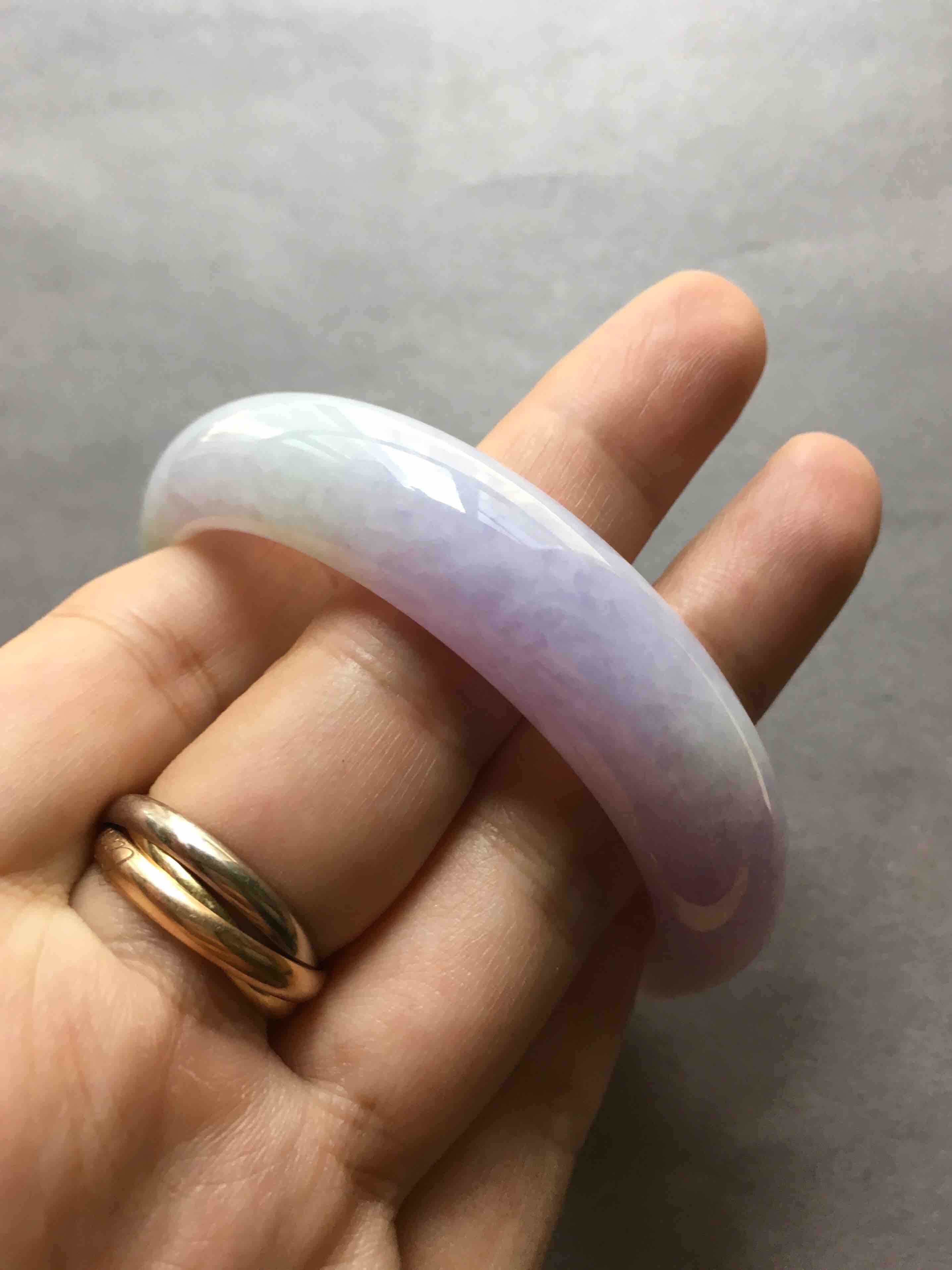 富贵之物,糯冰种紫罗兰翡翠手镯,种水细腻清透,颜色艳丽,阳光下紫紫的,灯光下粉红色,难得的宽版厚庄尺寸,上手特别富贵大方,真正紫罗兰,所见即所得,手机自然光下拍摄,吊打网上那些PS的紫色几条街,内径56.4,宽14.7,厚8mm,适合手寸55到57的朋友佩戴