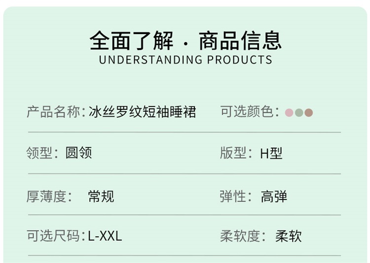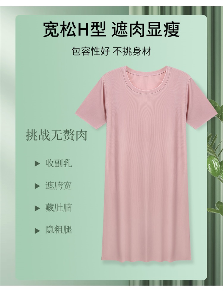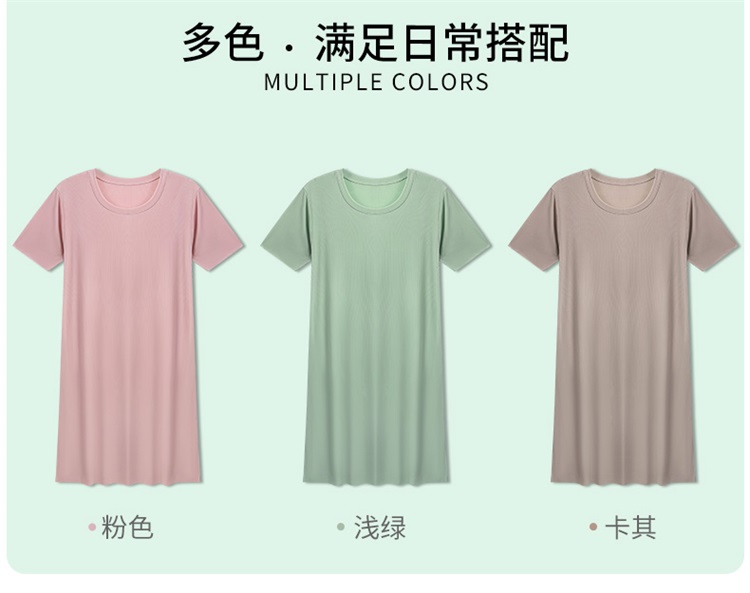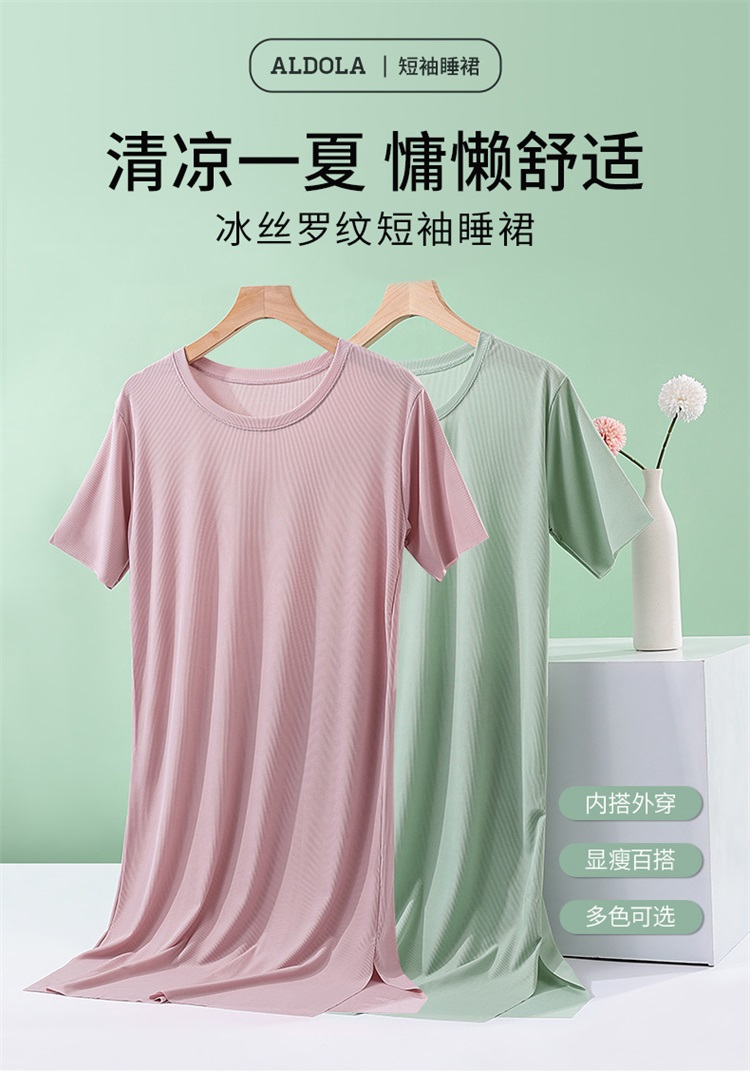 雅黛丽睡衣女款夏天冰丝圆领短袖家居服纯色简约中长款大码女睡裙