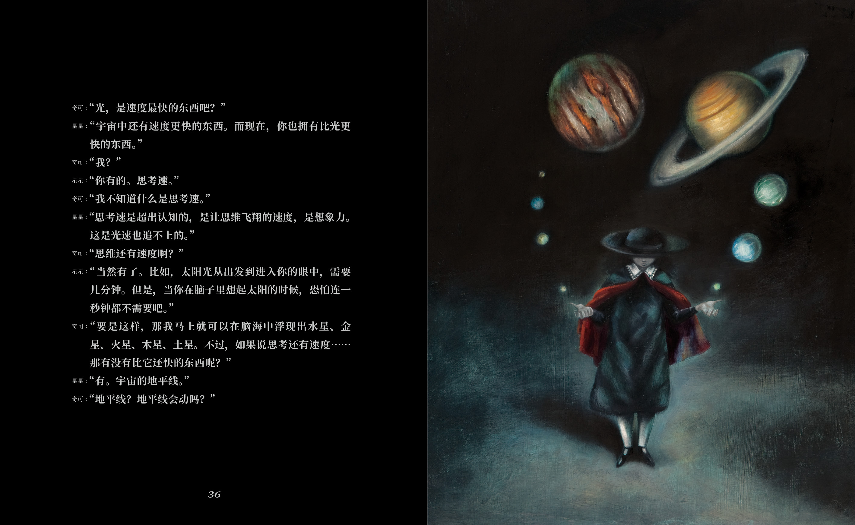 绘本中黑暗宇宙的深度和广度,神秘的对话令我深深着迷。想起小时候,我在学校用天文望远镜看到月亮时的那份感动——我头顶上的世界,有着如此宏大而壮美的未知。就是这样的感觉。