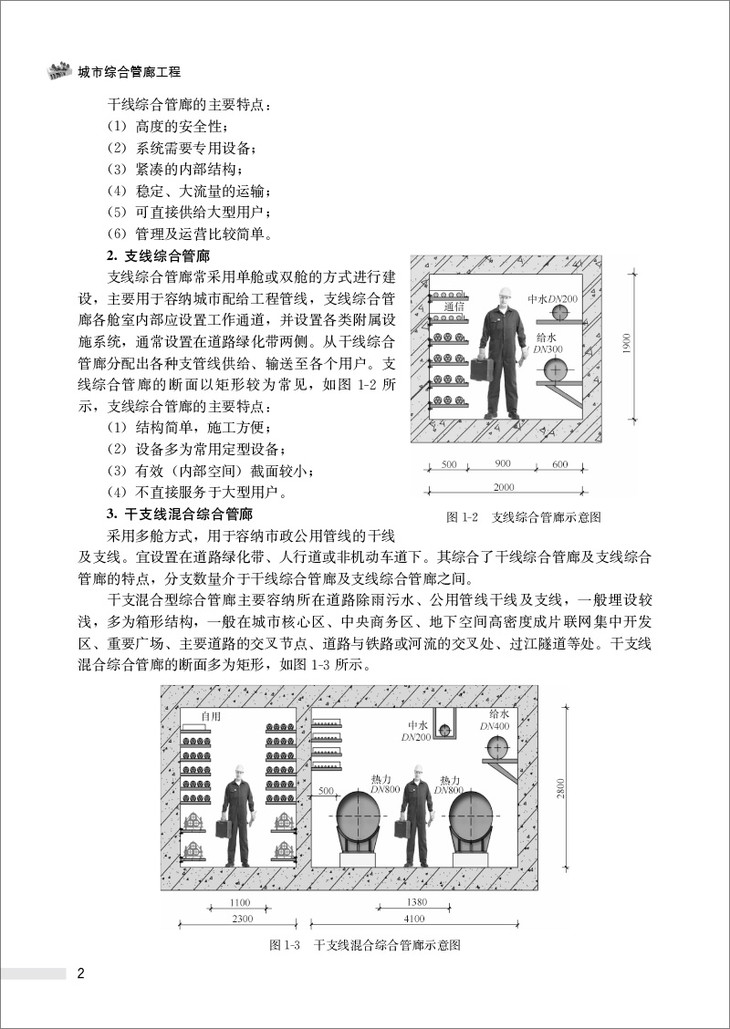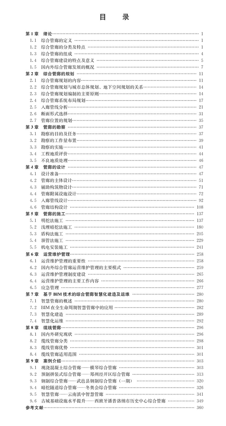 管廊是将城市生活所必需的供水、供电、照明、通信、燃气、热力、雨水、污水等 管线集成于地下隧道空间,实施统一管理,有效改善生命线工程的运营及维护,从而有 力地保障城市社会生产与生活的正常进行,是增强现代城市韧性的有效手段。 管廊工程也是一个国家经济、科技与社会发展到一定程度的必然产物。 本书拟对以往建设经验进行一次全面的总结和梳理,同时,在编写中也注 意广泛吸收当前的新技术、新材料、新工艺,力求体现行业的最新发展水平。