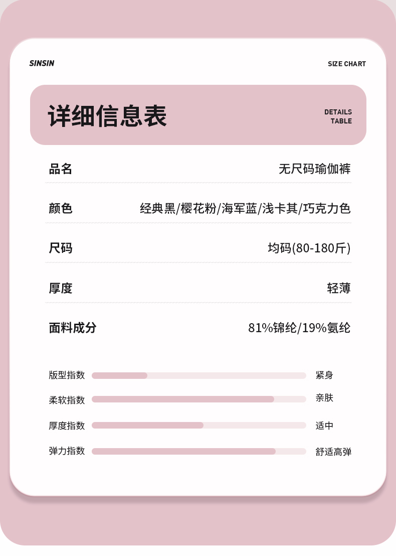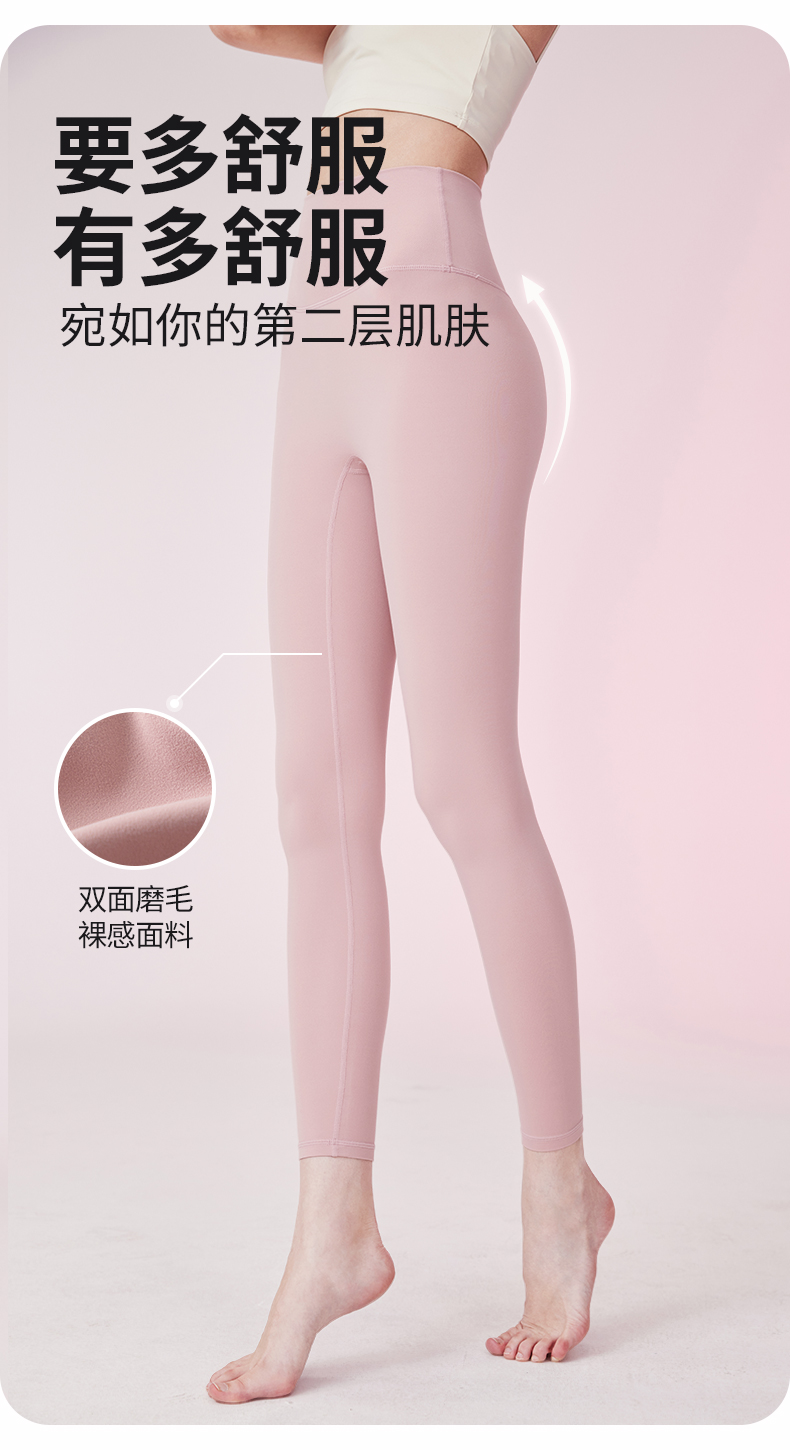 SINSIN的无尺码瑜伽裤,选用的是双面磨毛的裸感面料,穿在身上舒适的像“没穿”一样,几乎没有束缚感,真正做到了贴身但不粘腻,柔软又吸汗。而且这种新型四面弹面料,弹性巨大,穿起来舒适不紧绷,不容易变形,做瑜伽需要有高强度的拉伸也不怕,延展性特别棒,就像第二层肌肤一样,完全不会有被牵扯住的感觉哦!