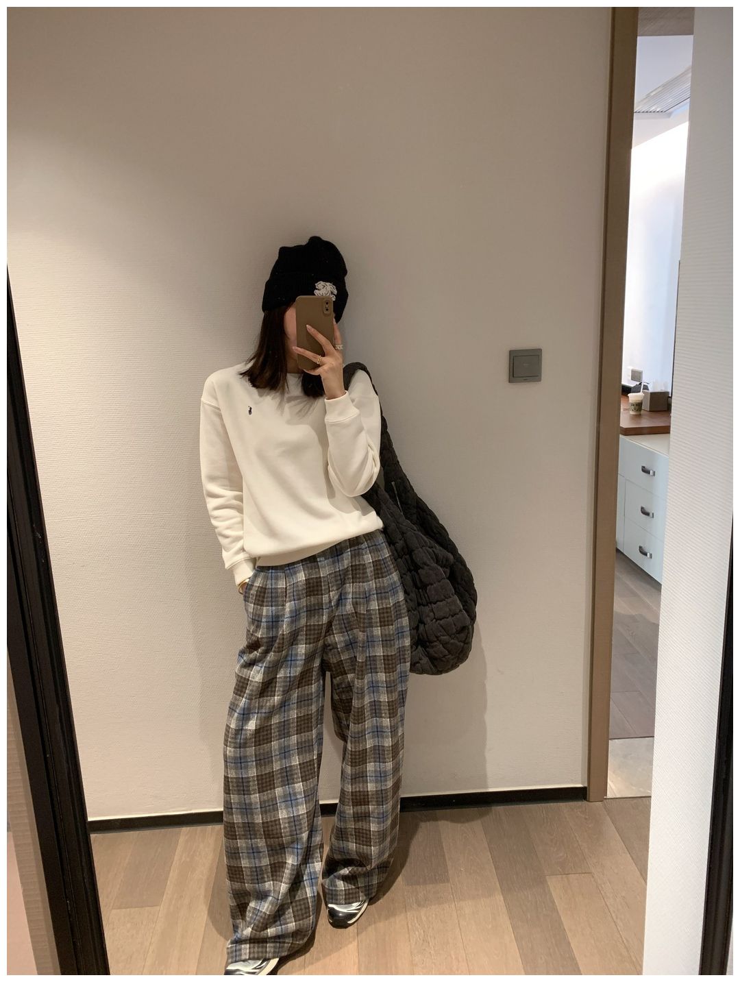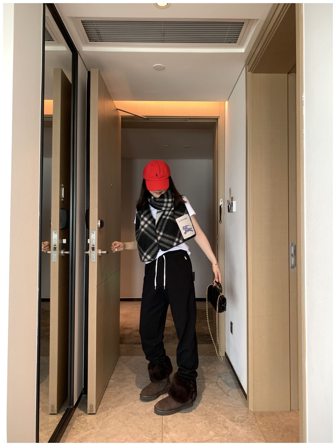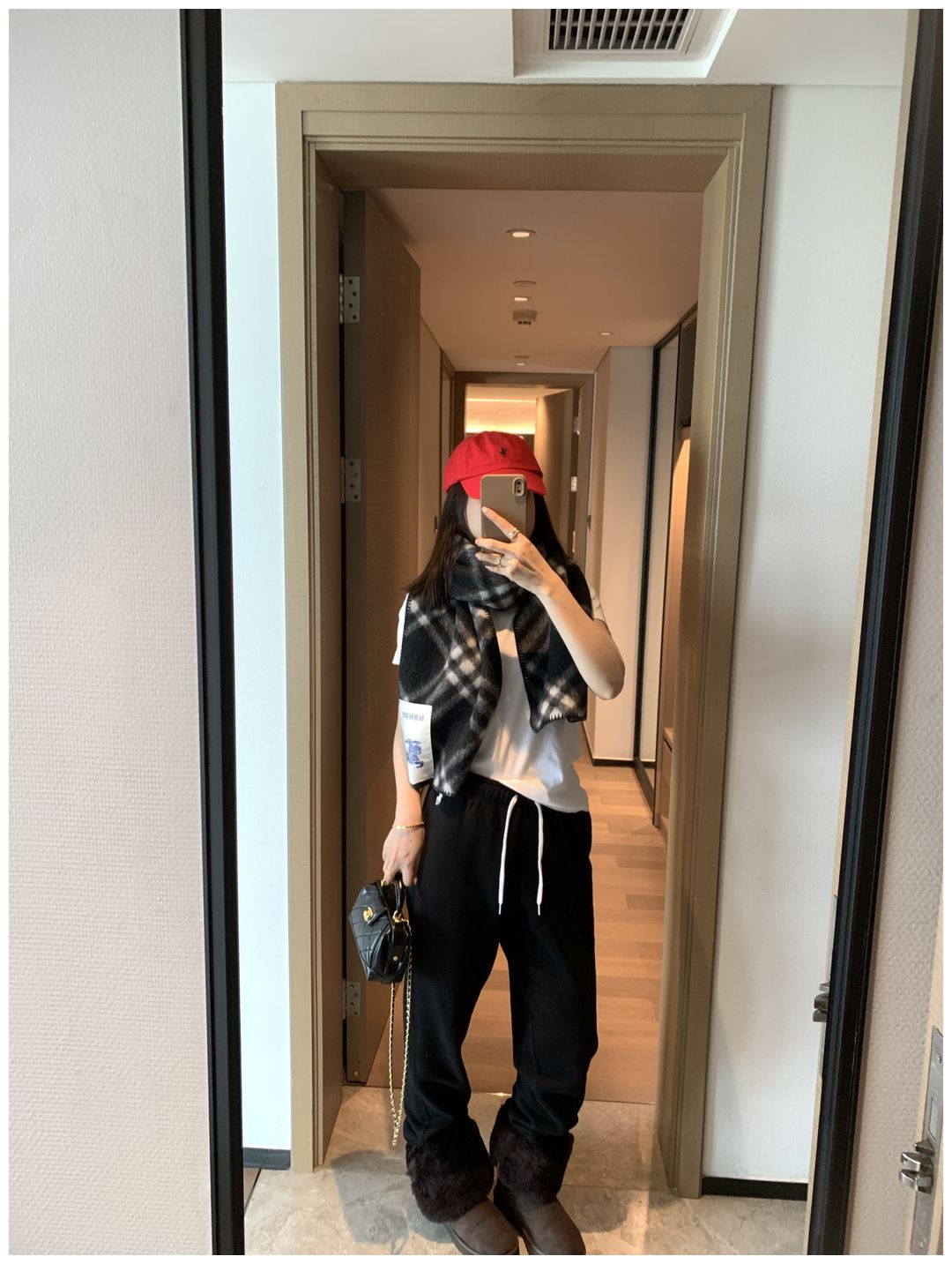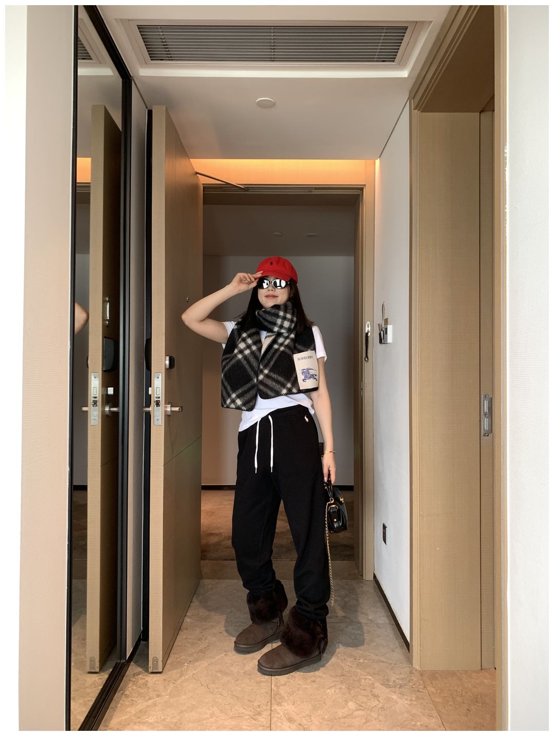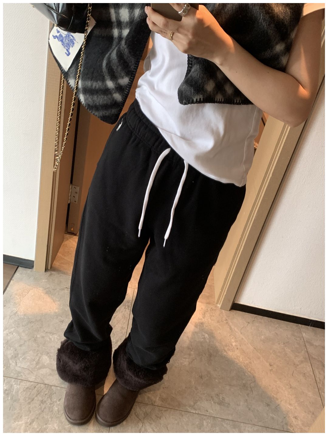 而且白色搭配格子彩色都好看 成套你们就给我搭配ugg 羽绒服