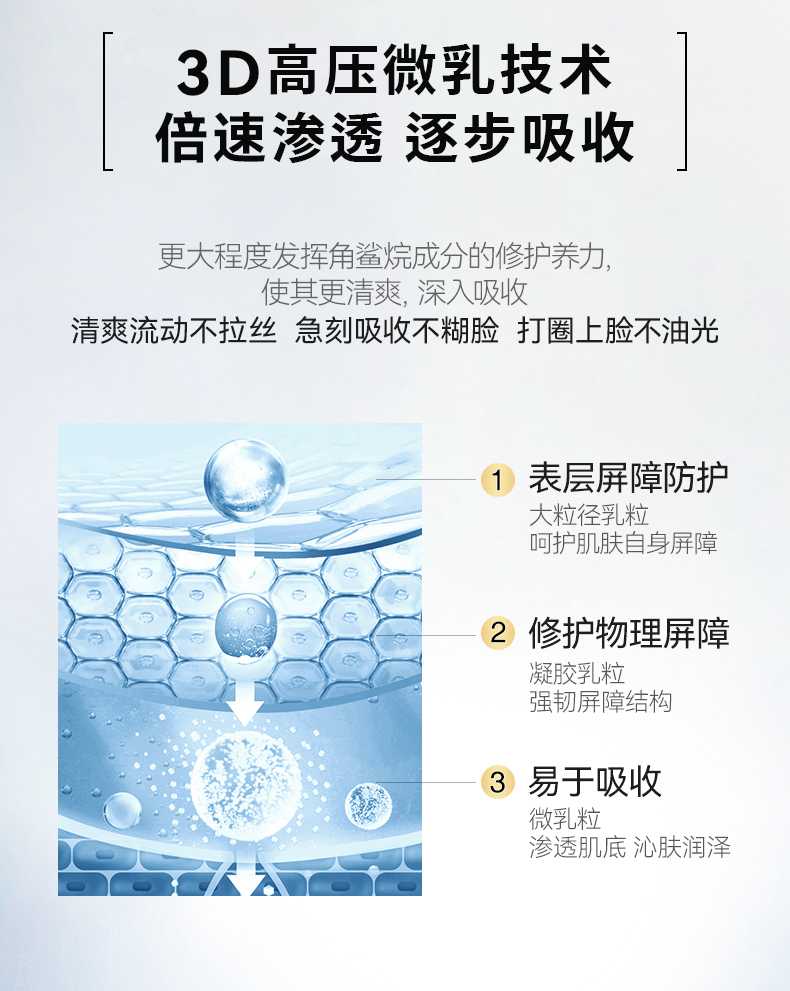 米蓓尔次抛还采用了3D高压微乳技术,让角鲨烷能够倍速渗透、逐步吸收,更大程度地发挥其修护养力。而且,BFS一体化包装,每一支都确保了纯净与新鲜,不仅避免二次污染风险,更让每一次使用都能感受到纯净的活力。