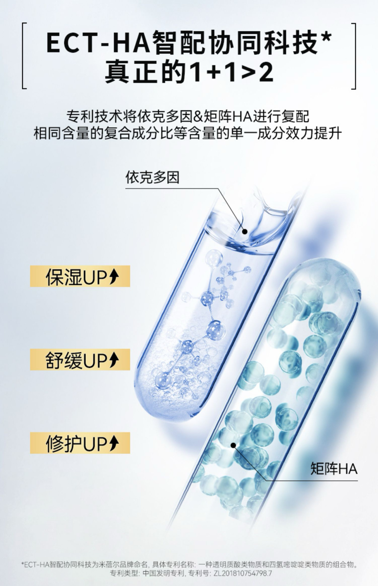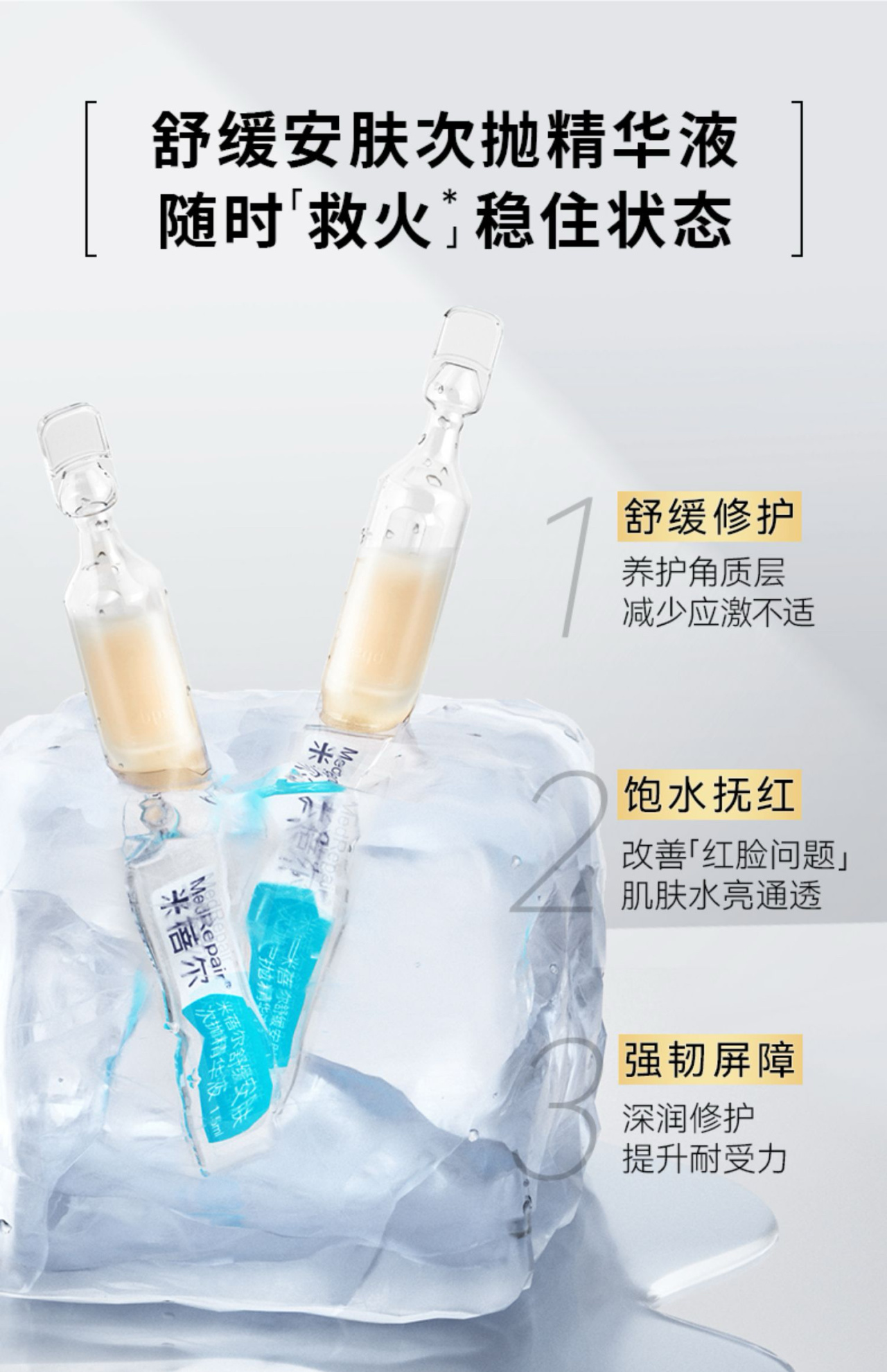 安肤次抛,是小蓝帽系列的哦,就是为敏肌设计,非常降燥!它融合了油橄榄叶提取物、华熙专研依克多因以及三重专利矩阵HA等多重专利成分,这些成分各自拥有独特的护肤功效,组合在一起更是如同开挂一般,让肌肤问题迎刃而解!油橄榄叶提取物富含橄榄苦苷、多酚、黄酮等,能够改shan敏痘肌的泛红现象。而依克多因,则能够守护肌肤,抵挡外界侵袭,同时对晒后修hu也很有帮助。三重专利矩阵HA则从内到外呵护补水系统,让肌肤时刻保持水润状态。除此之外,米蓓尔次抛精华还采用了ECT-HA智配协同科技,将依克多因与矩阵HA进行复配,使相同含量的复合成分比等含量的单一成分效力提升,真正实现了1+1>2。同时,微美态ME-1™、专利加持的MHA Micro®以及燕麦活性成分、积雪草甙、柑橘果皮提取物等成分的加入,更让这款次抛在改shan皮肤油脂分泌、修hu强韧、平衡PH值等方面表现出色。