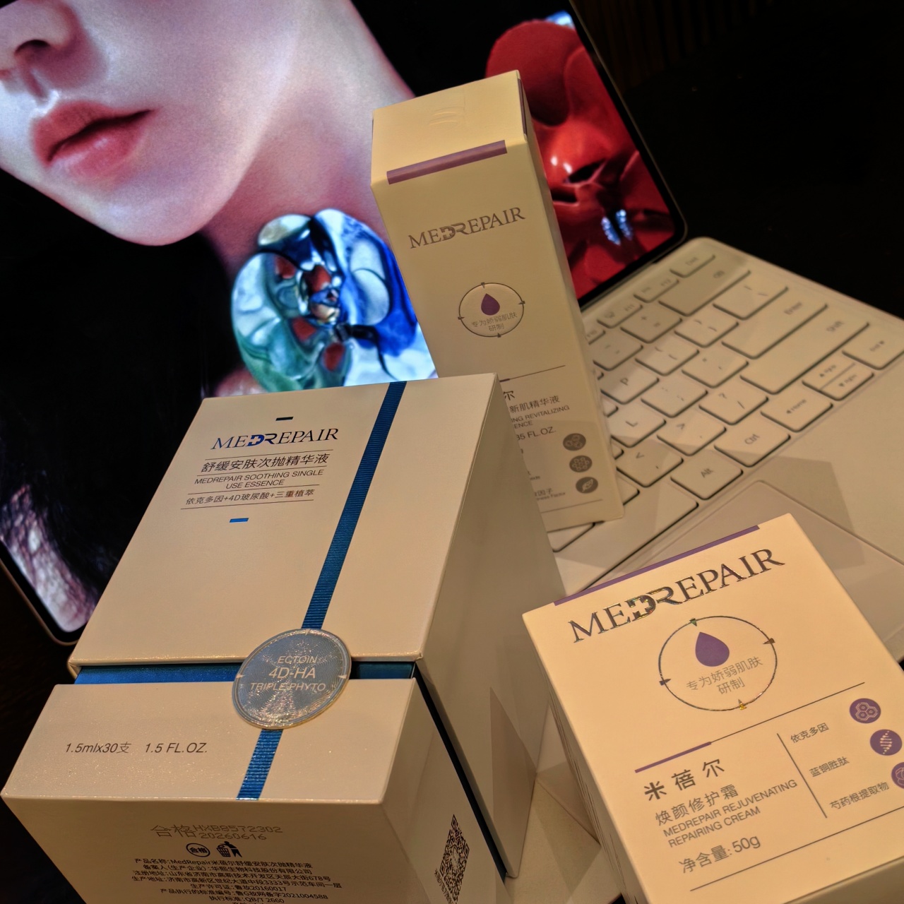 来更一些米蓓尔的新,都是敏肌也可用的,快乐!米蓓尔的安肤次抛,是小蓝帽系列,能快速去红稳肌,真灭火应急小棒棒;焕颜修护霜,是蓝绷带系列的急救面霜,修红储水,熬夜也发光;还有3A的紫精华,问题肌也可尝试,3重A醇加2重胜肽的搭配,温温和和的减龄!