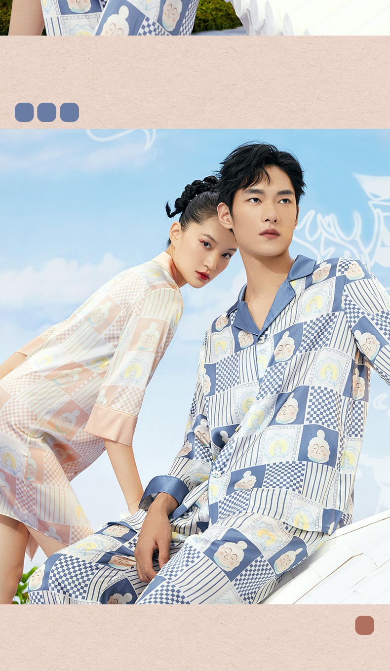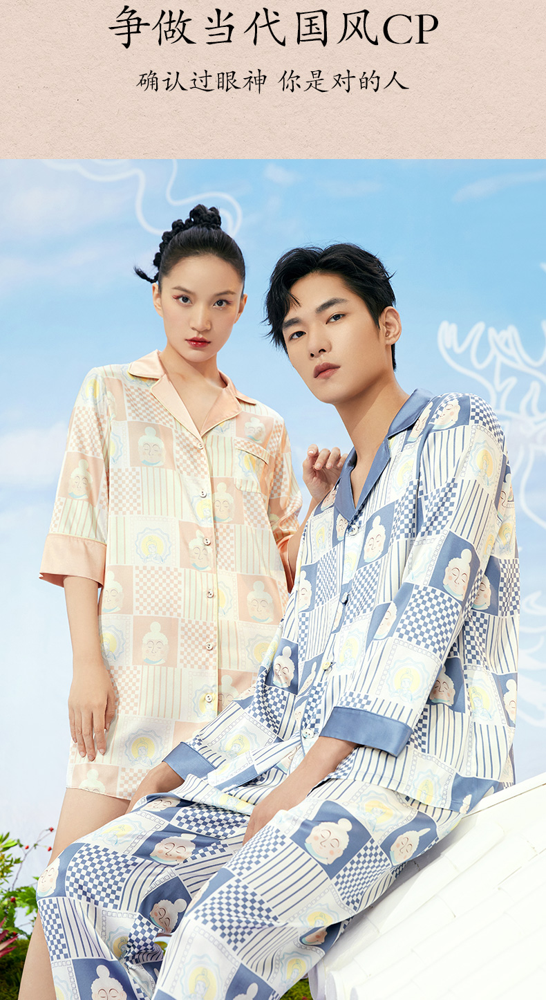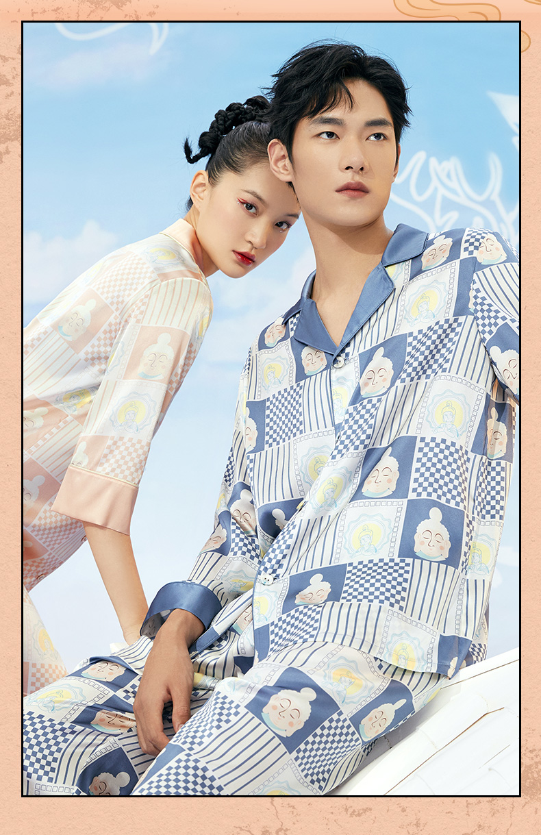 金三塔敦煌联名100%桑蚕丝印花情侣家居服男士真丝睡衣套装女士睡裙 YSFCA317 YSMCA202