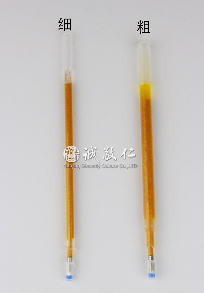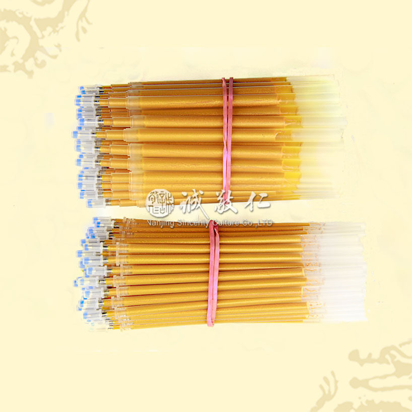 【基本信息】 品名:抄经笔芯 规格:细款内径3.0 笔头0.7 定价0.3元/支 粗款内径4.0 笔头0.7 定价0.7元/支 温馨提醒:细款市场上普通的水笔都可套用 粗款需内径8mm左右的笔壳才能用! 超大容量 书写超滑 流畅好写 超低价格 超值享受 用此闪光笔芯可以直接抄写经文金光闪闪,非常殊胜,功德无量! 古时的抄经感应(摘录) 从六朝以后各朝代都有非常多的虔诚佛教信仰者,包括出家僧人和帝王、官吏、宫人、士大夫、平民等在家居士,为了弘扬传播佛法而写经;或者为了祈福、报恩、布施、超荐亡人而写经。 例如明代的明勋法师,未出家前为中书舍人,一日忽患人面疮,痛不可忍。后来由于书写《金刚经》、《法华经》、《楞严经》,及《三昧水忏》,遂使疾患不药而愈。 又如宋代温州参军,书写《金刚经》一卷,恭入佛殿供奉,于乘舟涉海还乡途中,虽遇风难,而能平安抵达到岸。 日本弘仁九年(八一八)春,日本国中疫病流行,死者不计其数。嵯峨天皇深感痛心。后因弘法(空海:七七四-八三五)大师上奏,以一字三礼竭诚之心抄写《般若心经》,在《般若心经》净书完成之际,立刻有了灵验,疫病即时被控制,全国欢喜之声遍及大街小巷。之后为了解救国家的灾变、民生的疾苦,后光、后花园、后奈良、正亲町、光格等五位日本天皇,亦举行写经。这些抄写的经文与《般若心经》一同被奉祀于大觉寺的心经殿中。从此日本全国人民倾心于《般若心经》的抄写奉祀。 抄经的要求:戒定慧敬静净 若是经典所在之处,即为有佛。抄经就是礼拜十方三世一切诸佛。抄经就是皈依三宝。 一分诚敬,一分利益,十分诚敬,十分利益。由敬生静,以致心净,心净则国土净。 摄心为戒。抄经时将整个身心都投入其中,集中精神。断除各种杂念,使心念专注于经文上,达到一心不乱的境界。 一心不乱就是定,也可称止,所谓制心一处,无事不办。一心不乱的同时,保持当下的觉照,就是观,一笔一画都要清晰明了,逐渐深解义趣,则智慧之光将与日俱增。