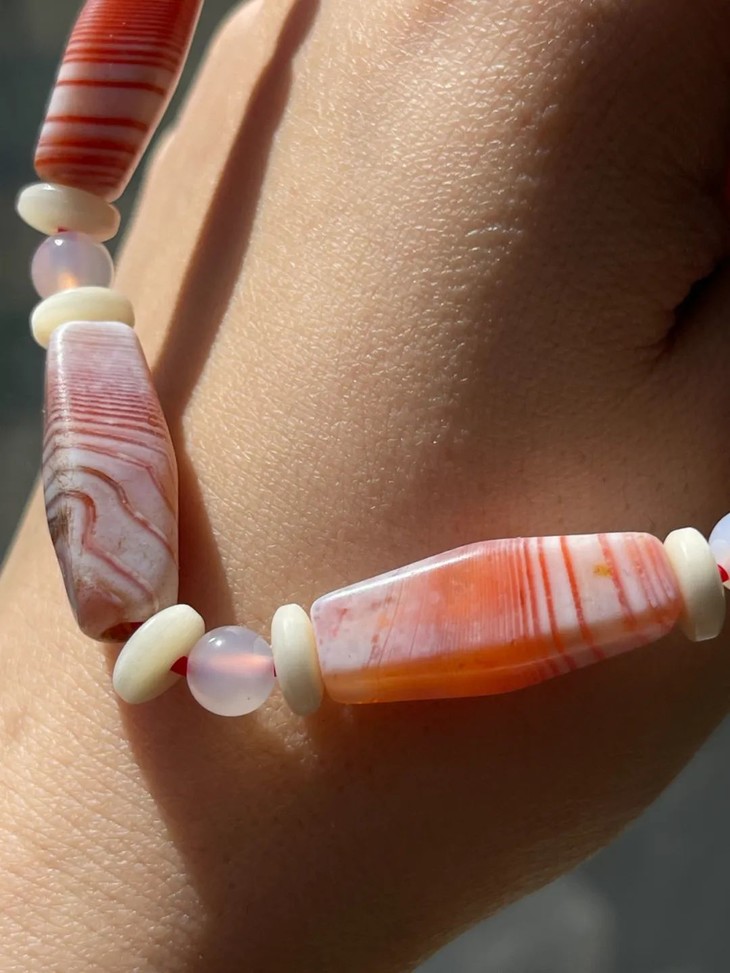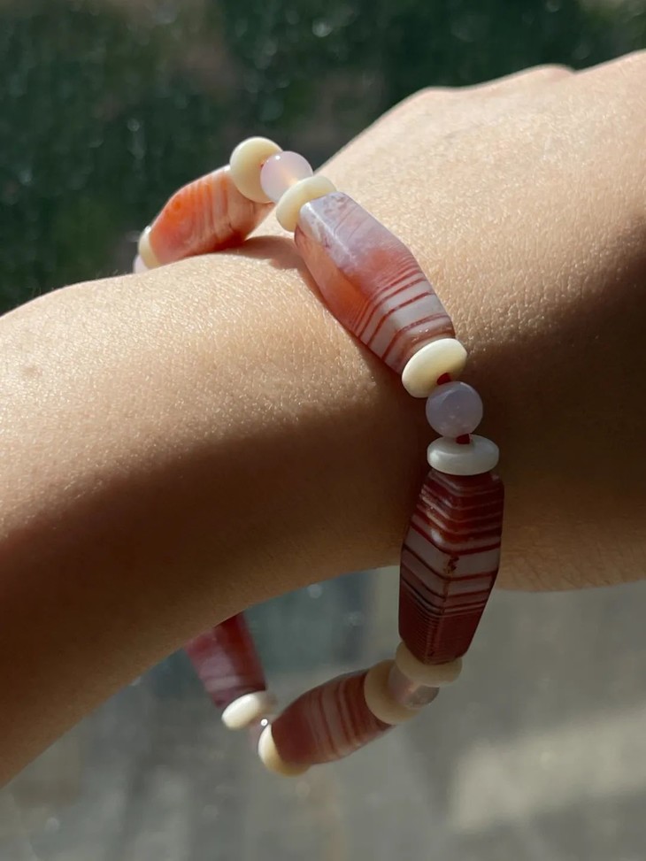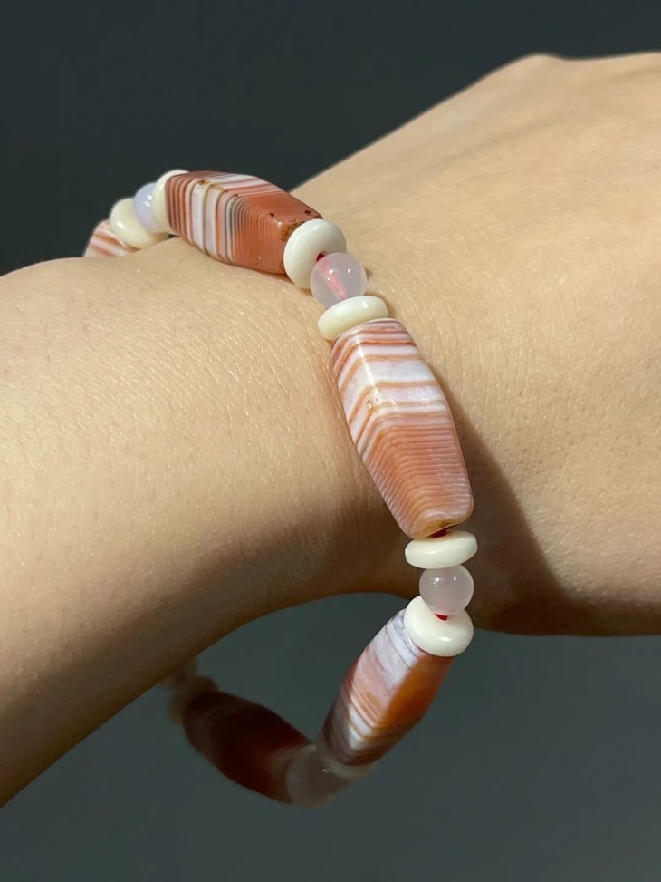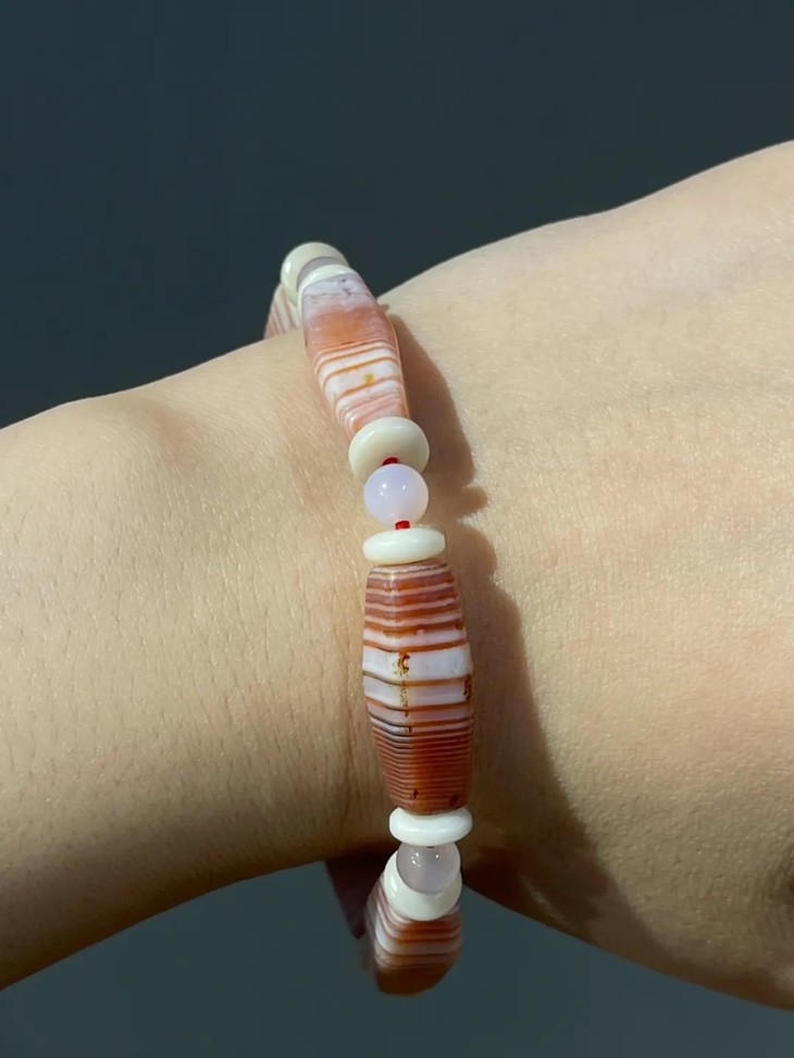 这红白缠丝玛瑙四方橄榄珠手链造型独特,天然色泽对比强,艳丽四射,界线分明,紋理清晰,红白色泽鲜艳清新,搭配鱼脑冻玛瑙隔珠与白耶壳隔片,以弹性伸缩线串成手链,入手即可搭配各式服饰佩戴,或可融入时尚首饰设计,色彩艳丽柔美,珠型高雅,难以言喻。