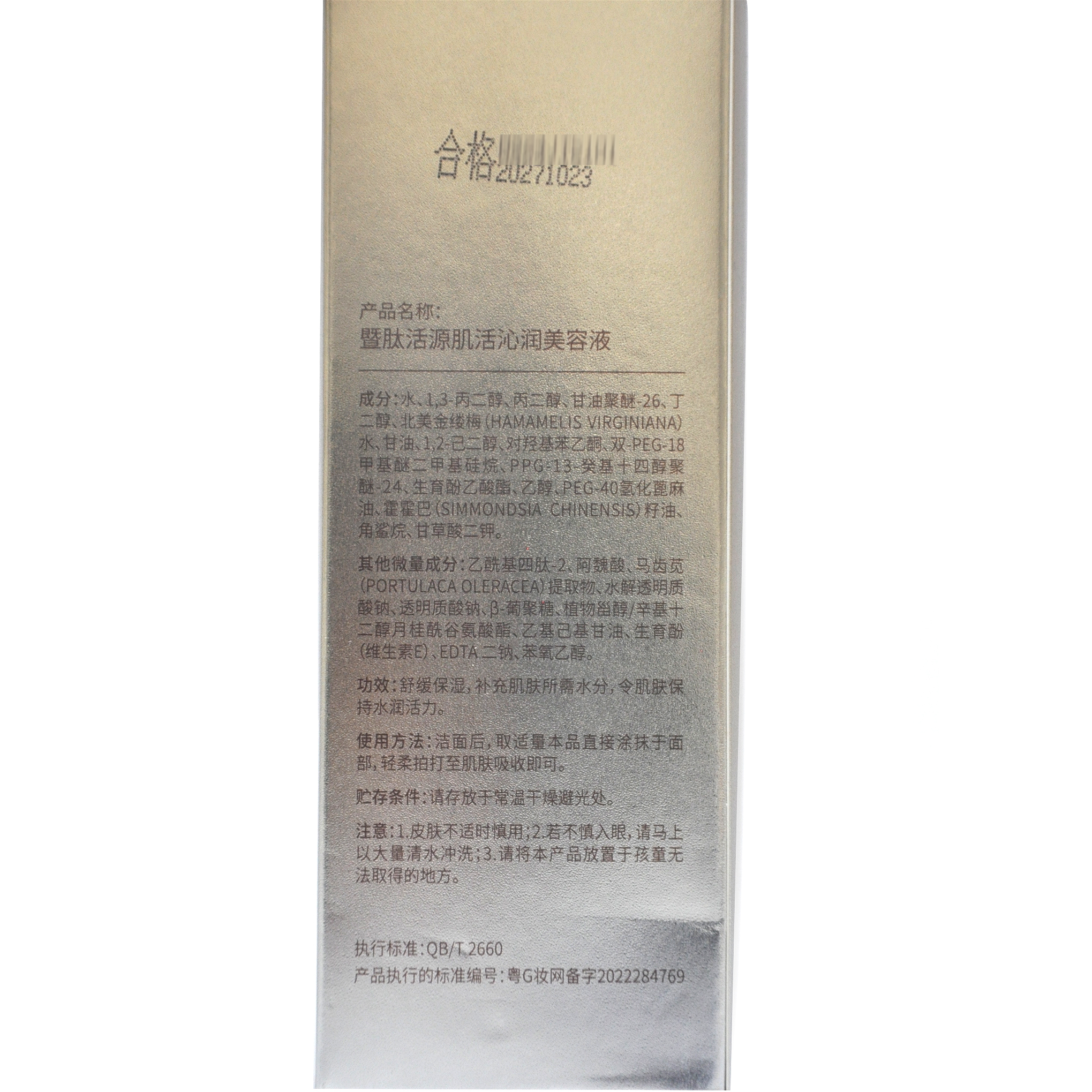 使用方法:洁面后,取适量本品直接涂抹于面部轻柔拍打至肌肤吸收即可。