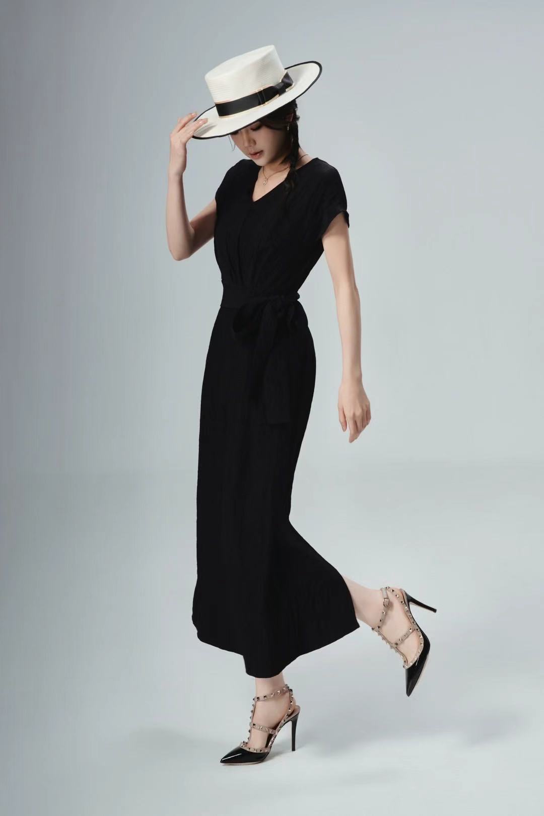 SZ2S81_漆黑色_连衣裙_春夏_V领蝙蝠袖系带收腰肌理感长款_高级女装_BERNIEELEN 伯妮斯茵