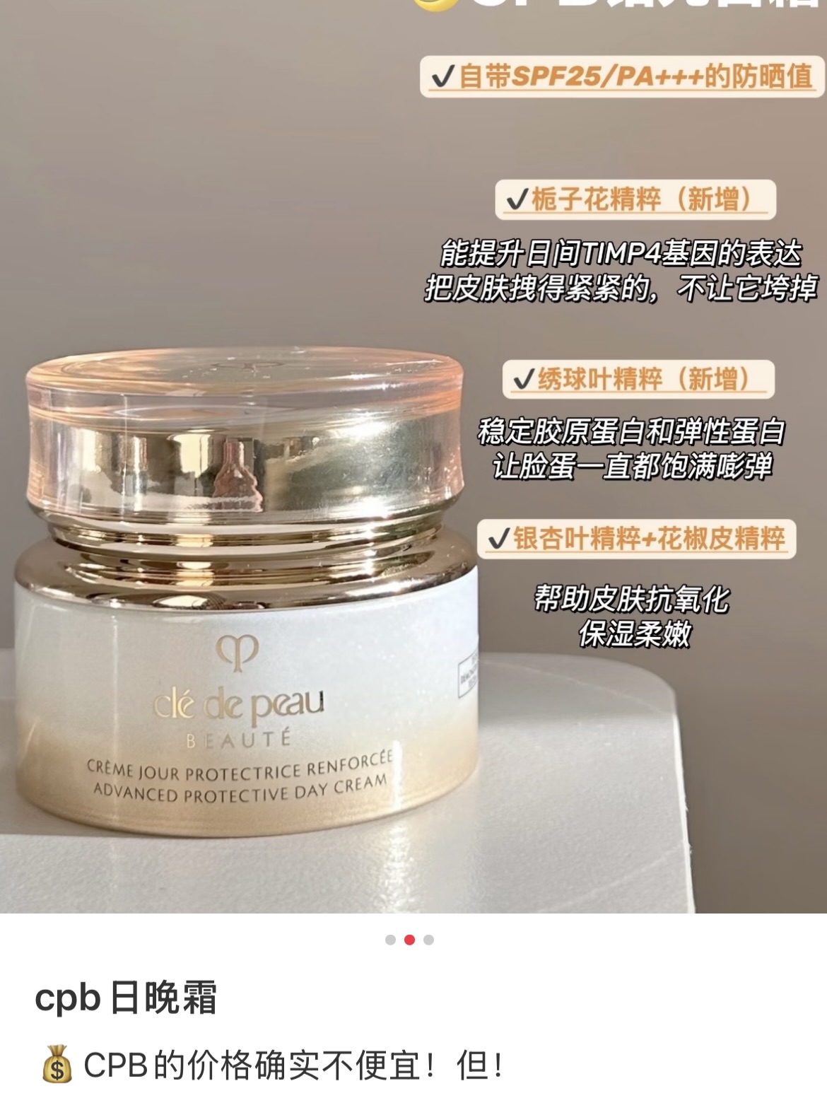 2. 通勤、日晒、空调房的三重考验,交给一瓶日霜从容应对。CPB分时抗老科技精准适配日间节律,升级OBP年轻蛋白主动识别外界刺激,绣球叶精粹稳固胶原与透明质酸,3重水油配比带来高延展吸收力,淡香萦绕间,给肌肤全天的水润、紧致与防护,素颜也能透着健康光泽。
