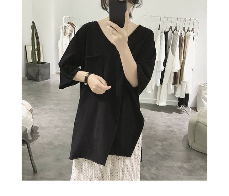 【复古文艺 透气舒适】95棉开叉t恤女式夏季宽松显瘦韩版卷边前短后长短袖v领