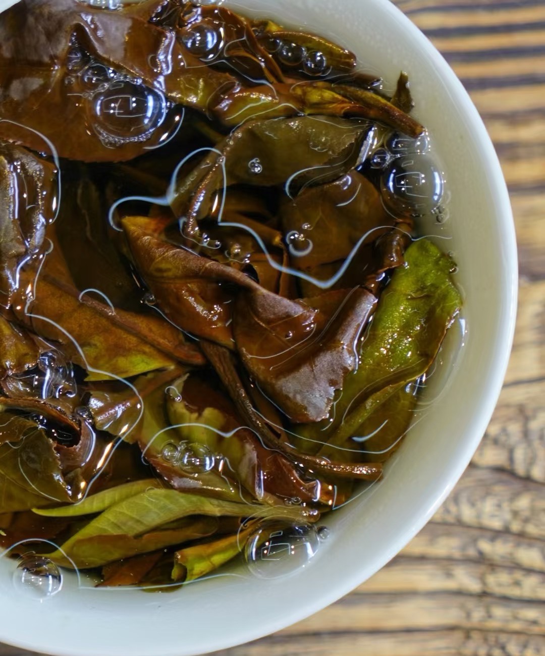 叶底柔软:班崴古树熟茶叶底柔软肥厚,色泽红褐,富有弹性。