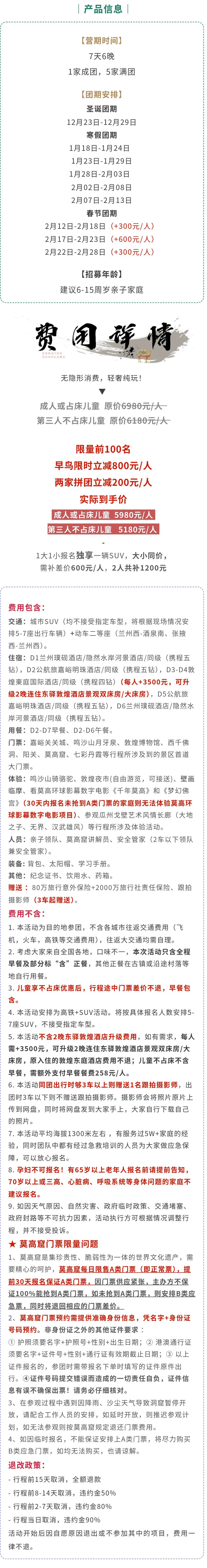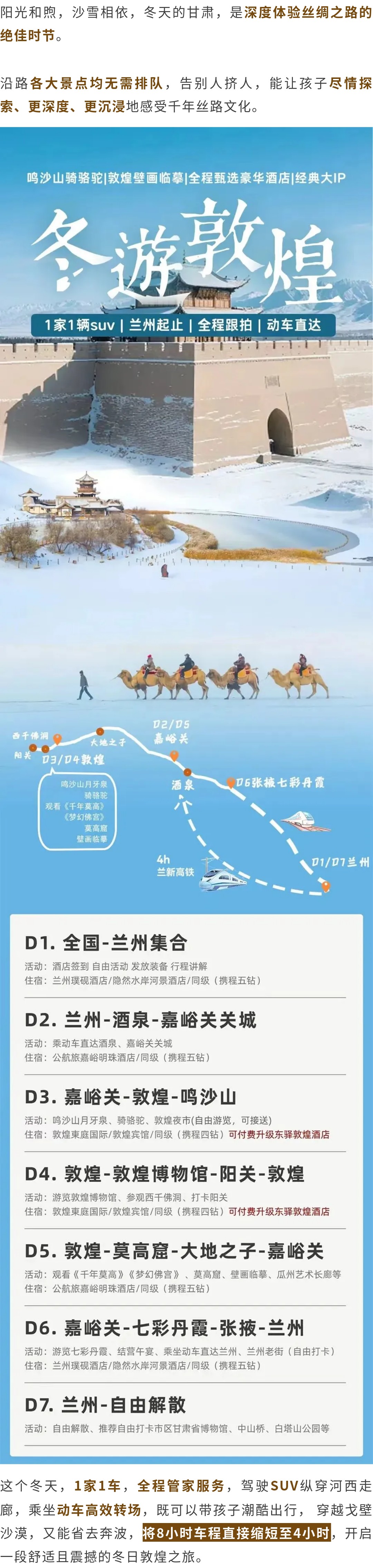 早鸟立减1000!圣诞寒假 【冬游敦煌】1家1辆SUV探秘河西,动车穿越戈壁沙漠,直达酒泉,打卡莫高窟、鸣沙山等8大IP,沉浸丝路文明…