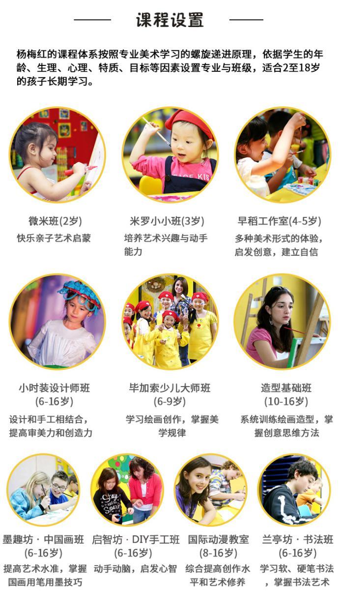 杨梅红拥有先进的早期艺术教育课程体系,由总部设在华盛顿的杨梅红艺术教育研究院(YAERI)历经多年研发完成。该课程体系按照专业美术学习的螺旋递进原理,依据学生的年龄、生理、心理、特质、目标等因素设置专业与班级。
