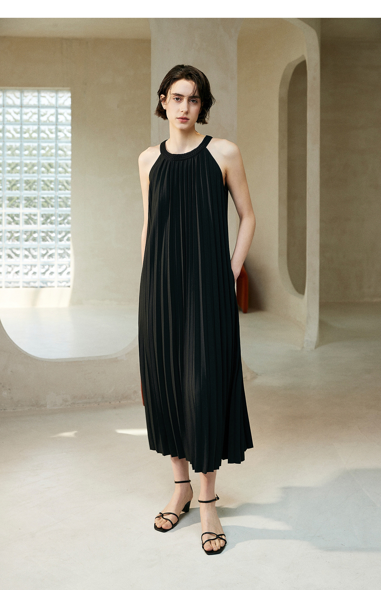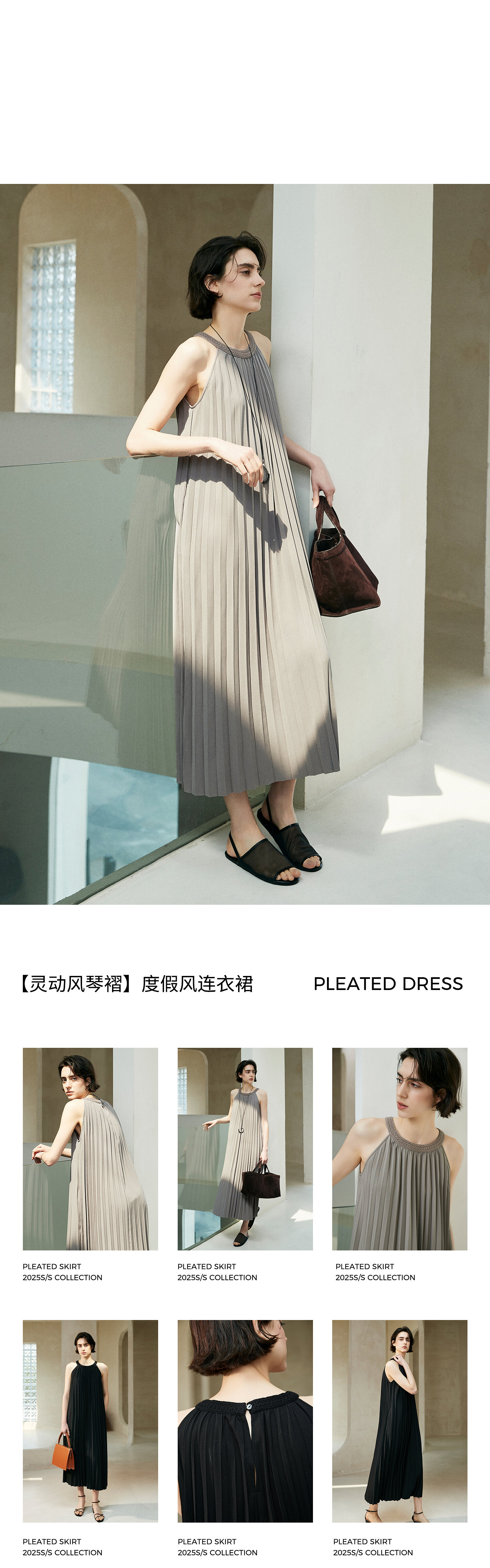 棉仓363616025-初棉灵动风琴褶重工百褶裙度假风挂脖连衣裙春夏