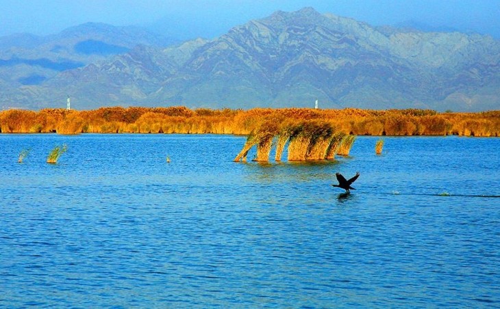 沙湖眺望,远处巍巍贺兰山山峰高耸,重峦叠嶂,雪积成山,日照不融,山上阳光明媚,山下常如披絮,形成“贺兰晴雪”,为宁夏古代八景之一。乘坐着小船,荡漾在水面上,水鸟在身边振翅飞过的景象让你毕生难忘。