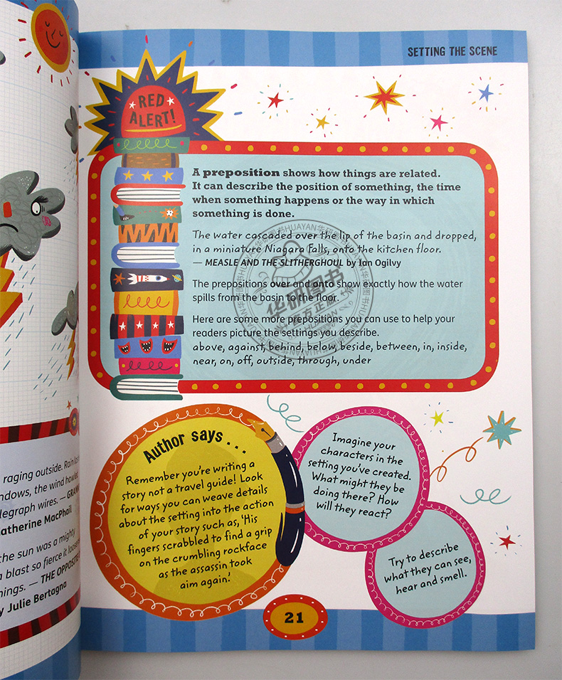 本书结合了小学和初中低年级的课程要求,在如何有针对性地写作、如何克服写作瓶颈、如何在不同的体裁中写作、如何使用简洁明了的语言等方面做了详细阐释,让孩子快乐地学习写作。此外,在如何使用恰当的词语表达,创造新词,用暗喻、明喻、习语写出佳句上,本书也提供很多实用的建议,非常适合13岁以下的孩子使用。 Ideal for children wanting to enter story writing competitions! This is a humorous and authoritative book that will awaken the author in every child, unlocking their story ideas and giving them hints and tips to create their own stories. For children aged 13 and under, this book is written in a fun, engaging, and inspirational style that will help all readers to see themselves as writers and help them to achieve their creative writing goals. It is ideal for home and schools, primary and lower secondary. The book is authoritative, linked to curriculum requirements, but not intimidating. From how to write for your audience or for a specific purpose, how to overcome writer’s block and how to write in different genres, to what words to use to best effect, this book gives children the tools they need to make writing an enjoyable experience. It is filled with tips on how to use wonderful and weird words, invent new words, and write powerful sentences using metaphors, similes, and idioms. Children will soon be creating stories that will stay with their writers and readers forever. Review “This new book is just the ticket for all budding young writers.” —Dad Info Blog “There could be no better guide to helping young imaginations take flight.” —Lancashire Evening Post “A fabulous and inspirational guide to fiction and narrative.” —The BookBag “Written in an engaging, fun style.” —Bev Humphrey, School Library Association